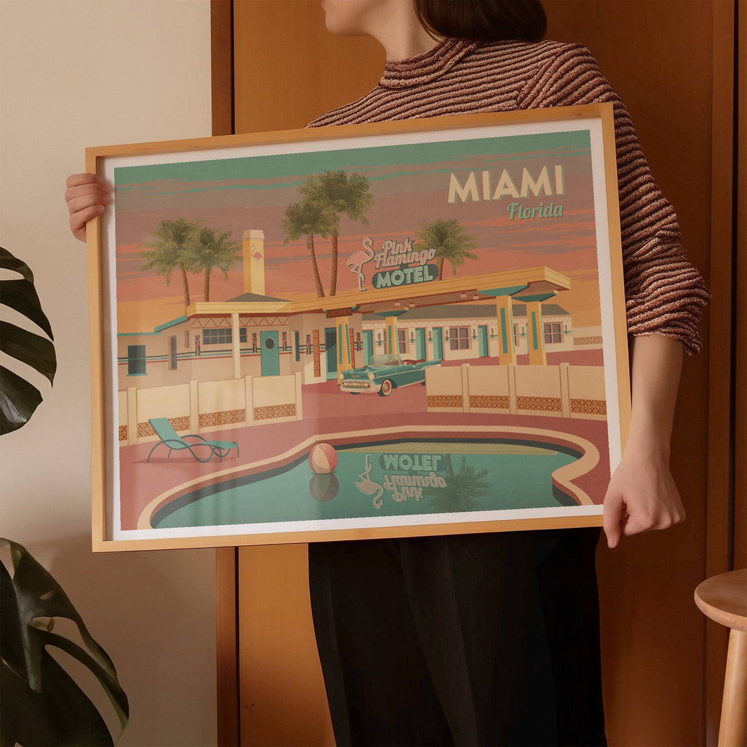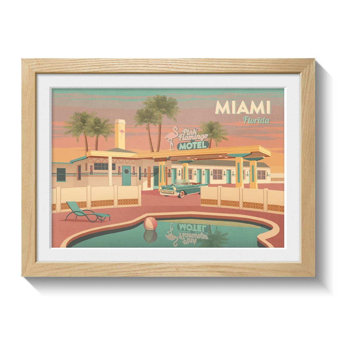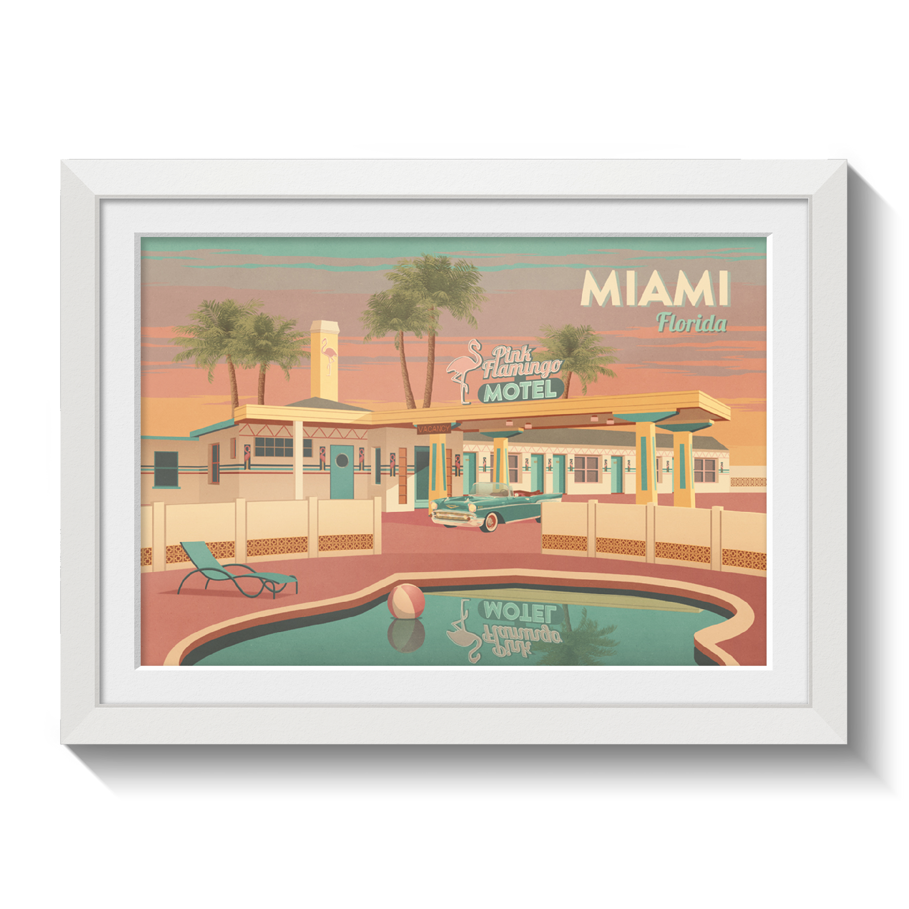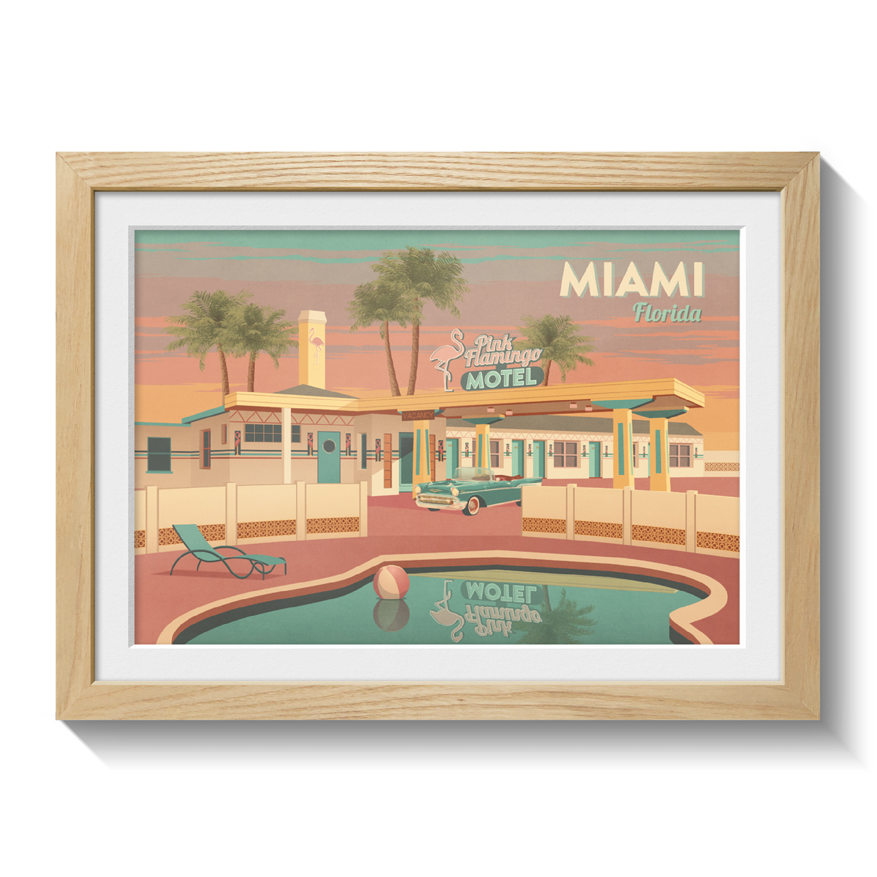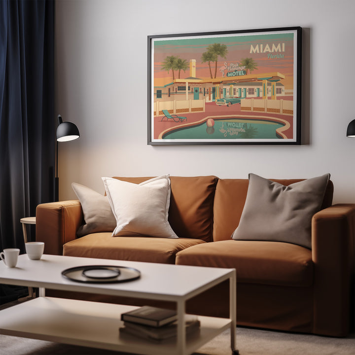An original travel poster of Miama, Florida. This sepia hued poster features a retro motel building complete with palm trees, swimming pool and a vintage 1950s car.