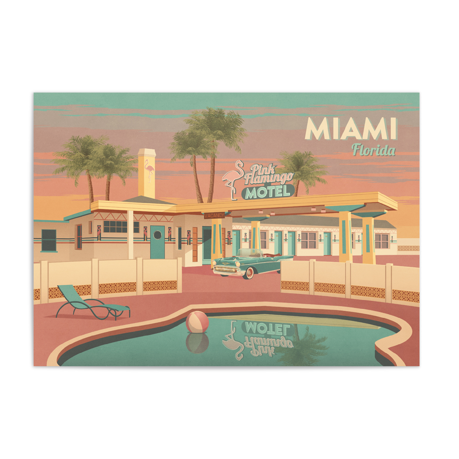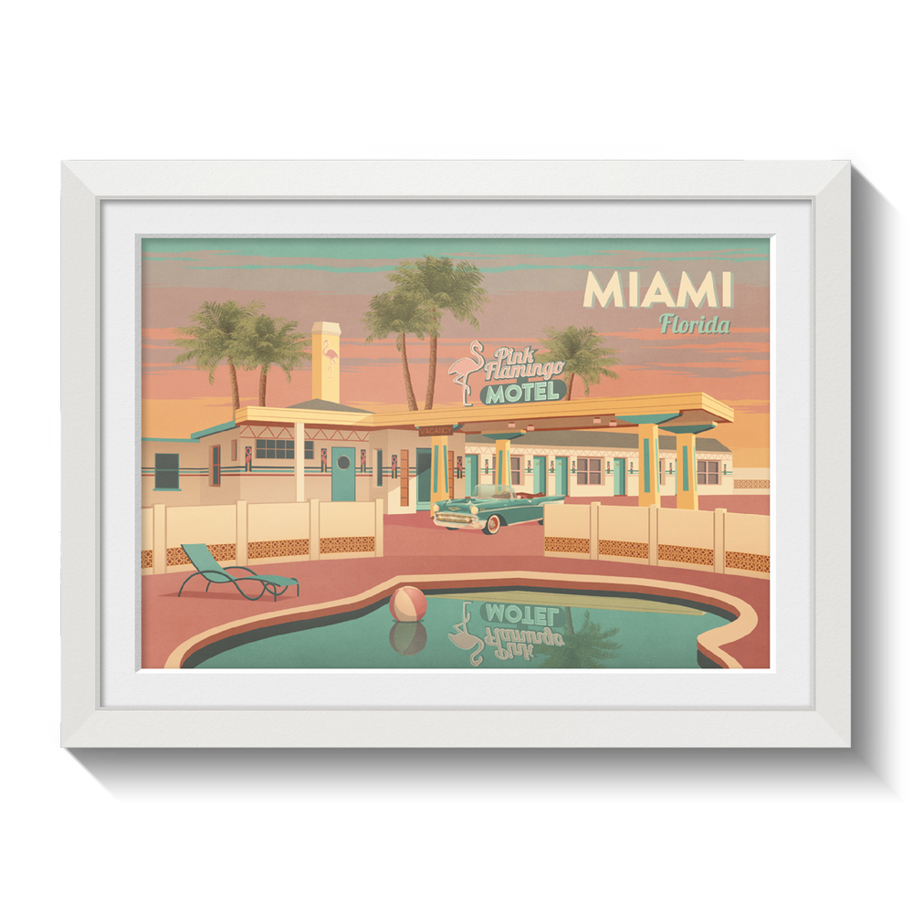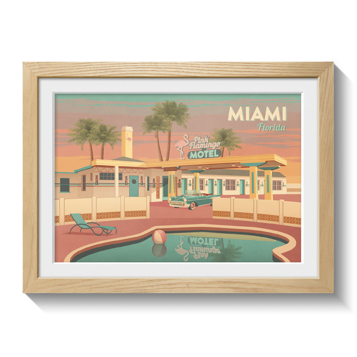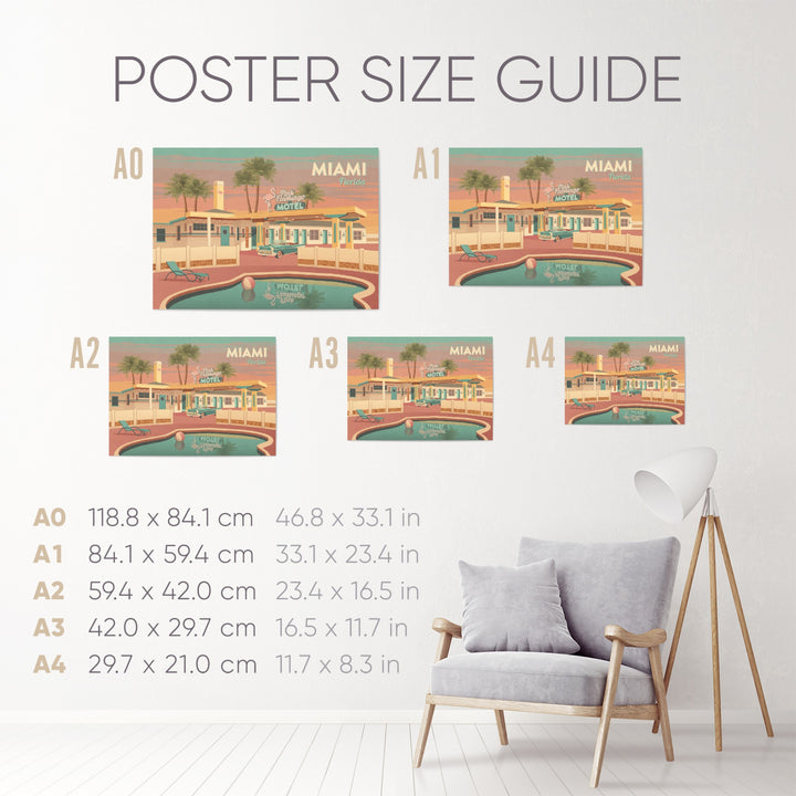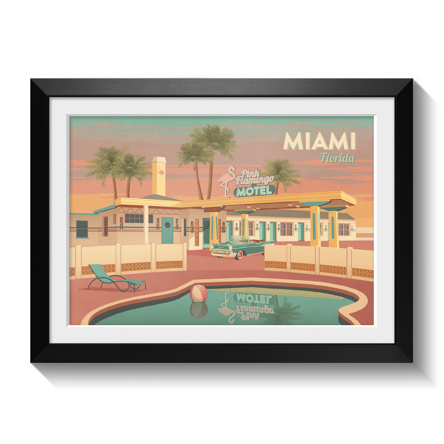 An original travel poster of Miama, Florida. This sepia hued poster features a retro motel building complete with palm trees, swimming pool and a vintage 1950s car.
