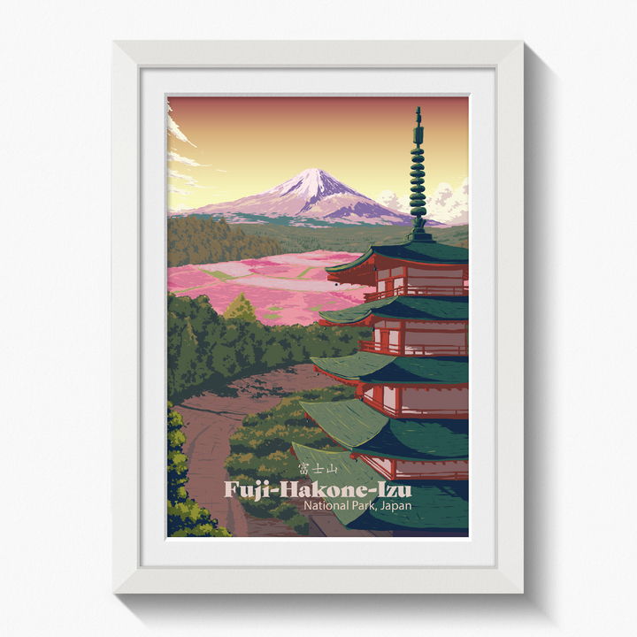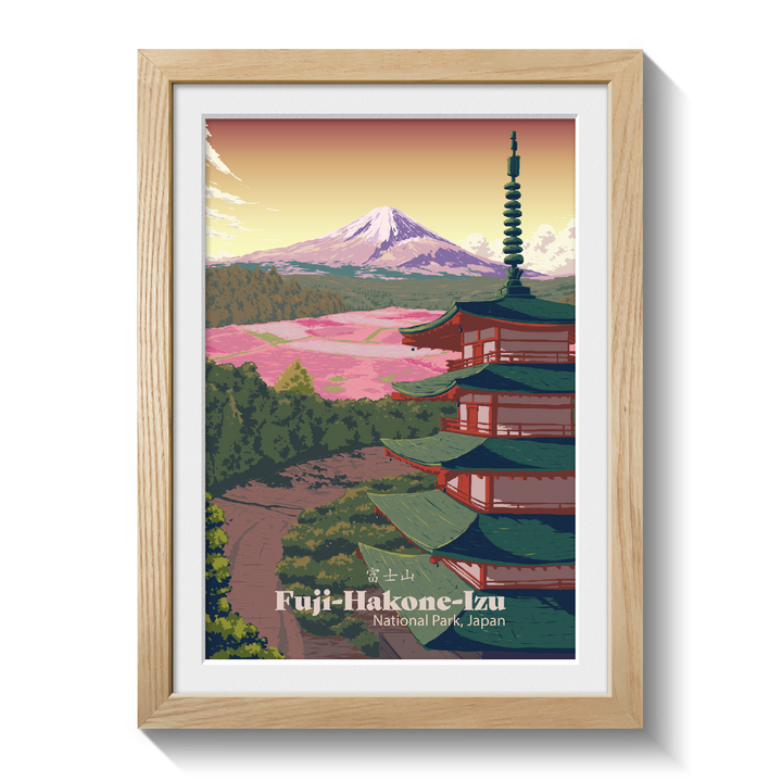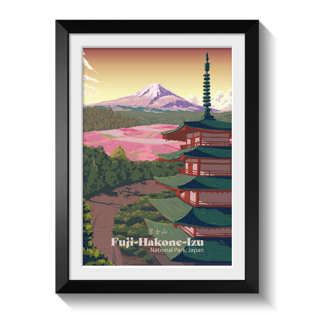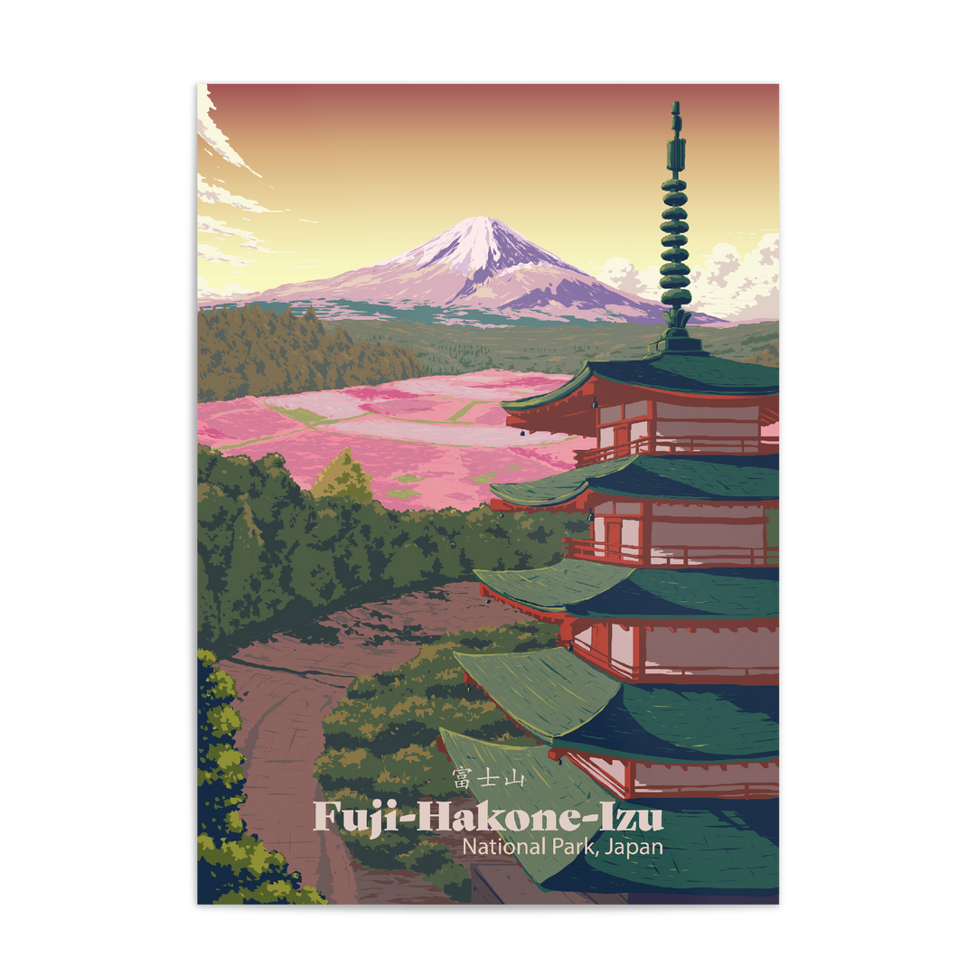 An original travel poster featuring Japan's talled mountain, Mount Fuji, situated in the Fuji Hakone Izu National Park. Just 100km from Tokyo, Fuji Hakone Izu National Park is famous not only for its volcanoes, but also its hot springs and beautiful cherry blossoms.