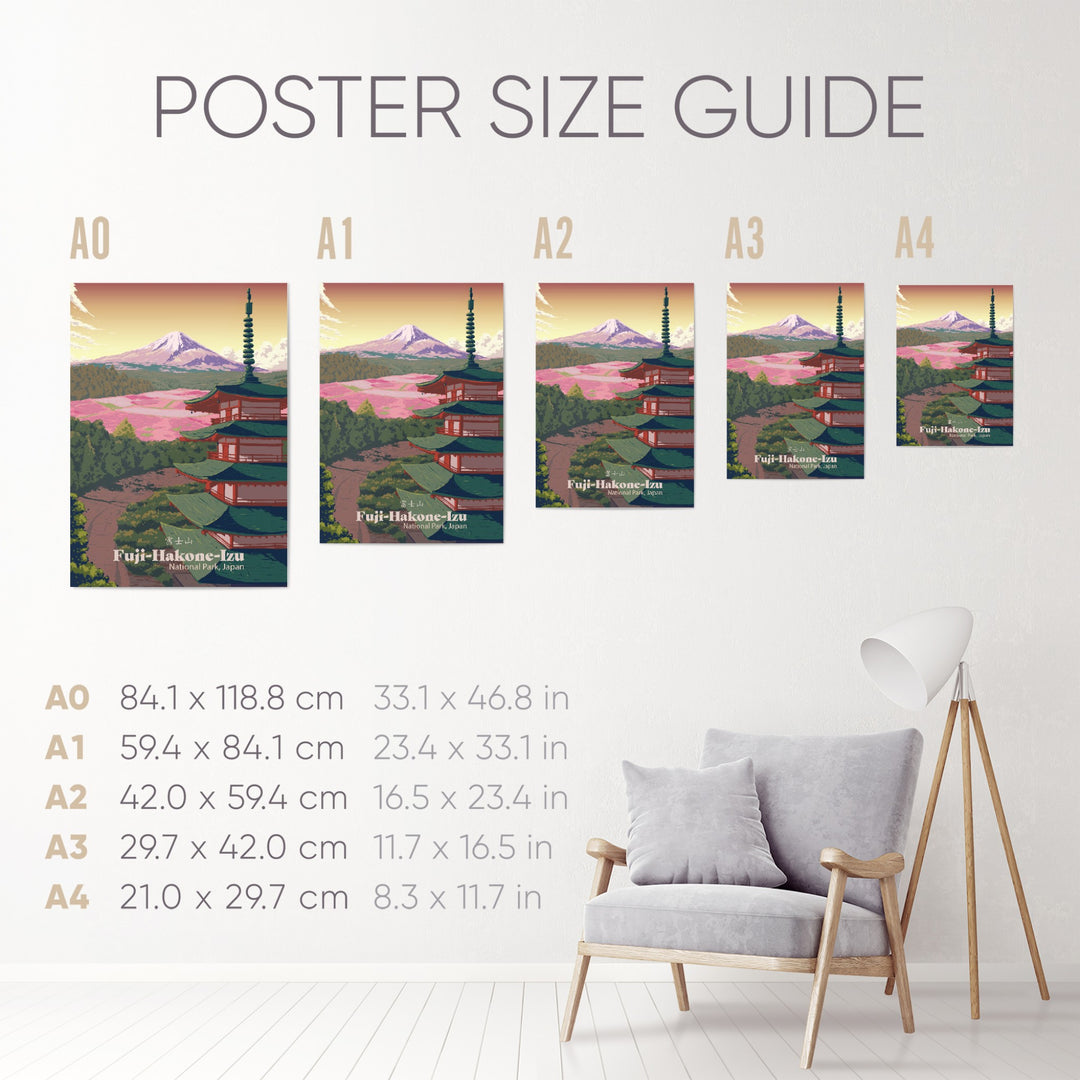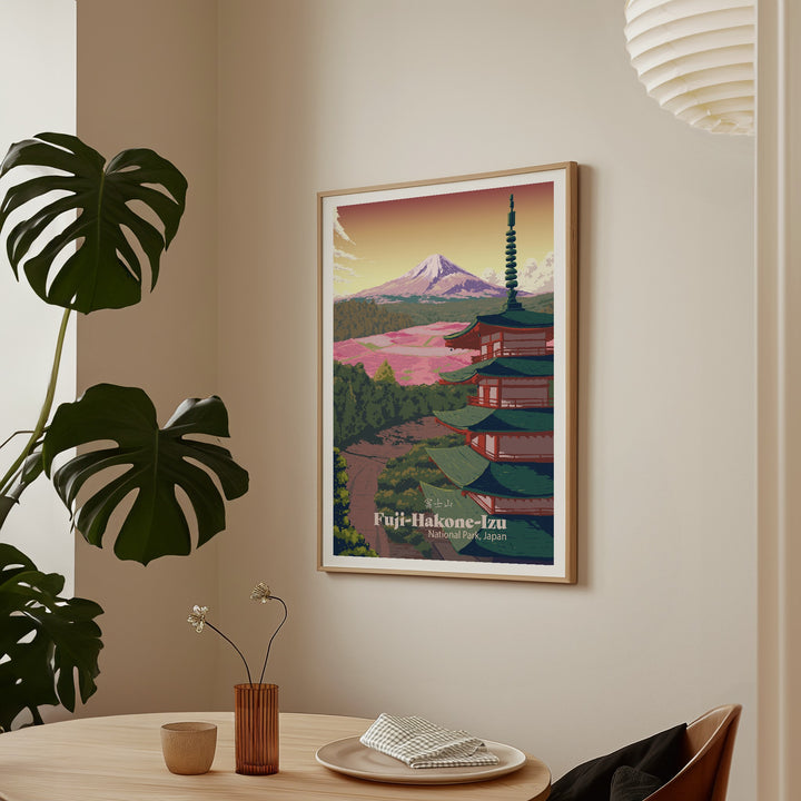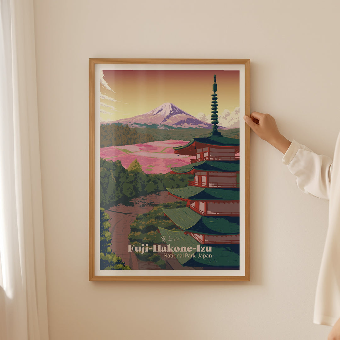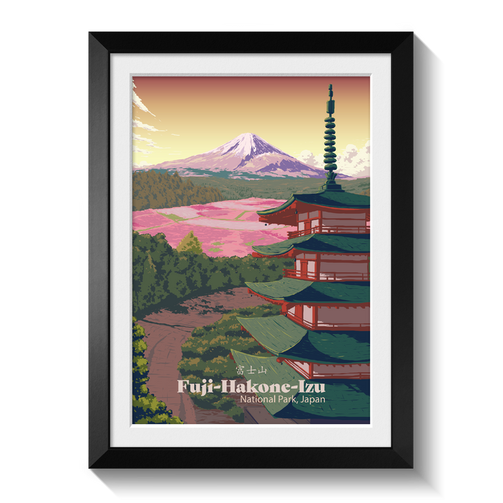 An original travel poster featuring Japan's talled mountain, Mount Fuji, situated in the Fuji Hakone Izu National Park. Just 100km from Tokyo, Fuji Hakone Izu National Park is famous not only for its volcanoes, but also its hot springs and beautiful cherry blossoms.