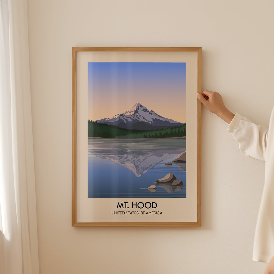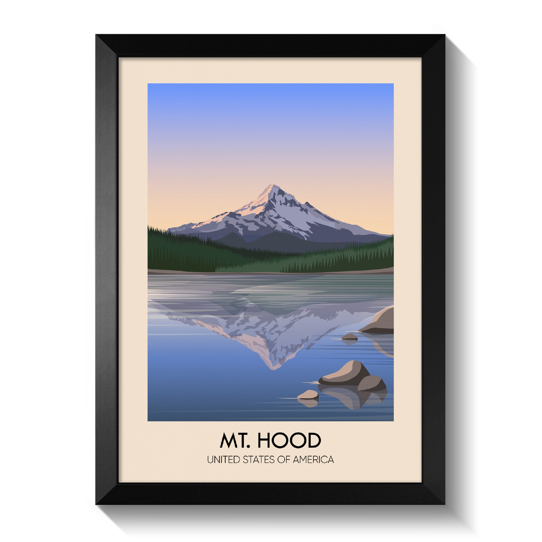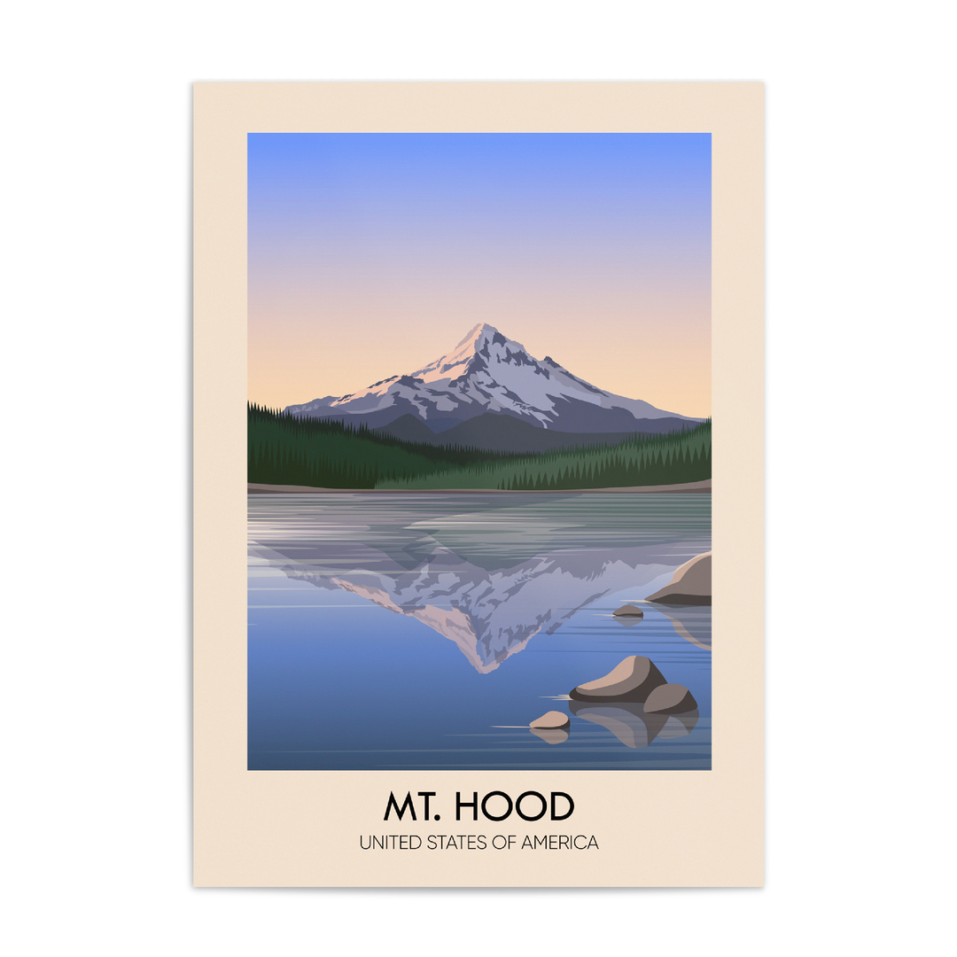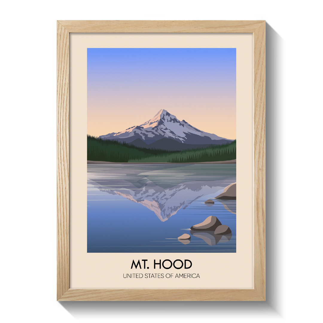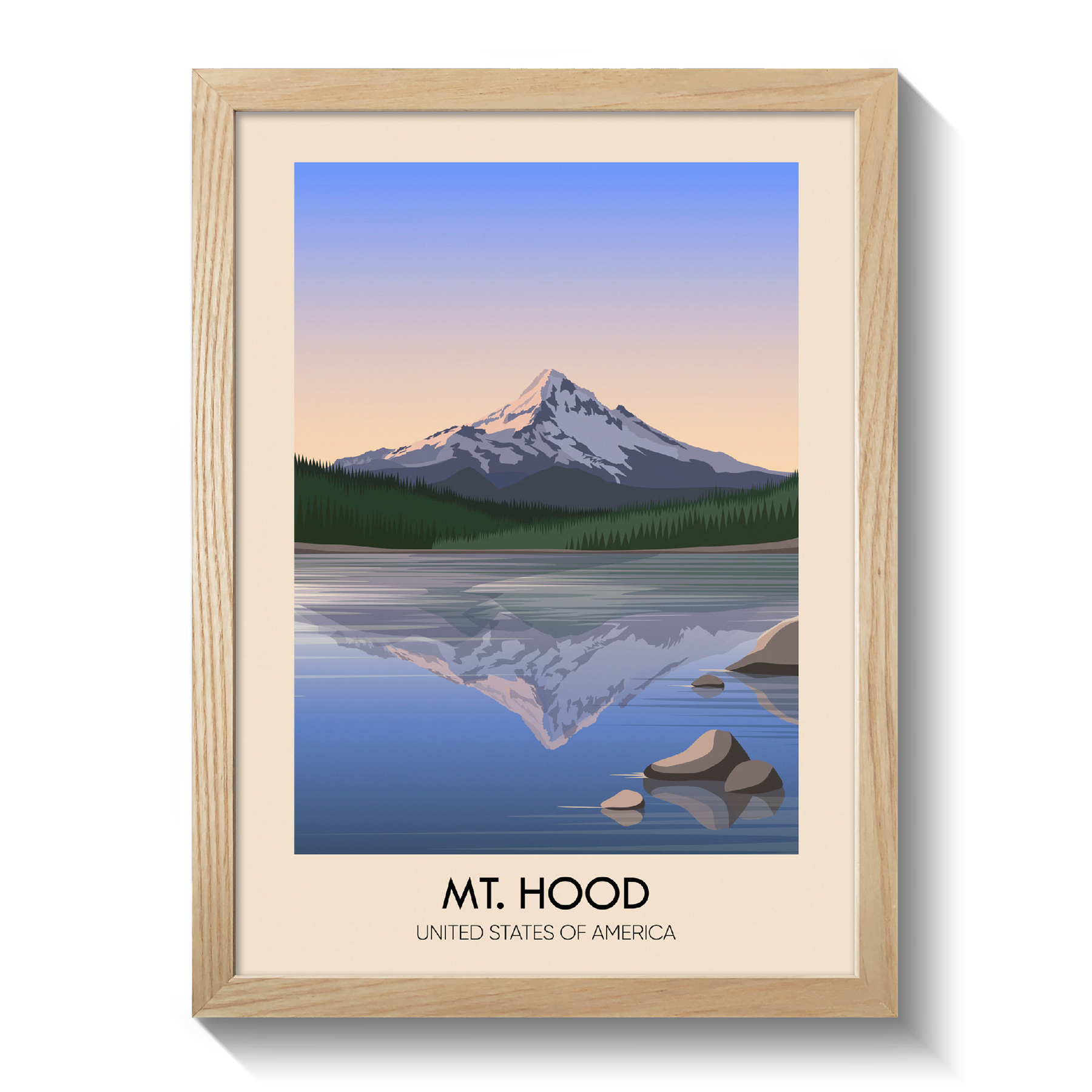 An original travel poster featuring the famous Mt Hood, in Mount Hood National Forest, Oregon. It is  a popular tourist and recreation area that extends along the Cascade Range from the Columbia River. From hiking to wineries to skiing the slopes, Oregon's Mt Hood Territory is a region that's rich in natural beauty, culture, & history.