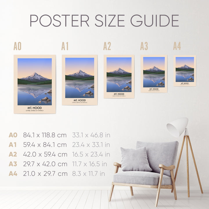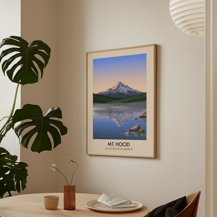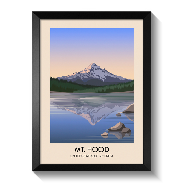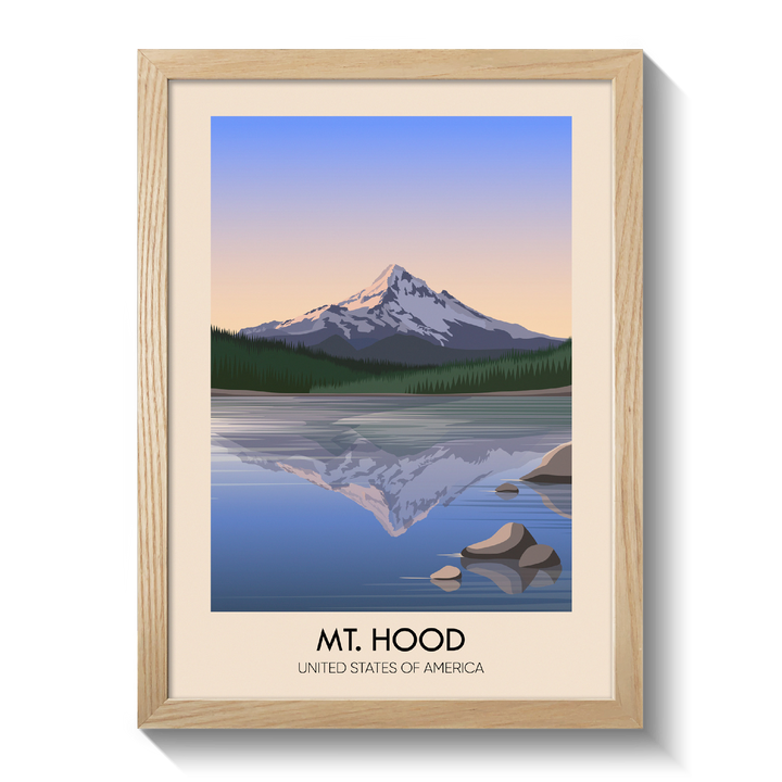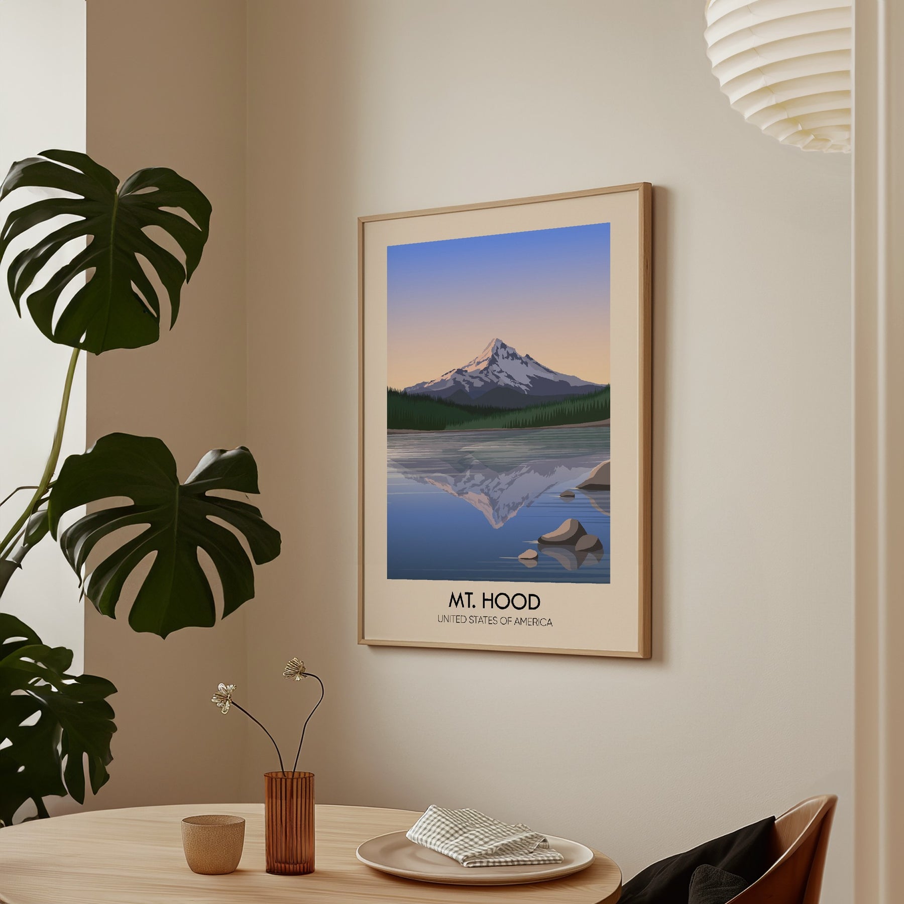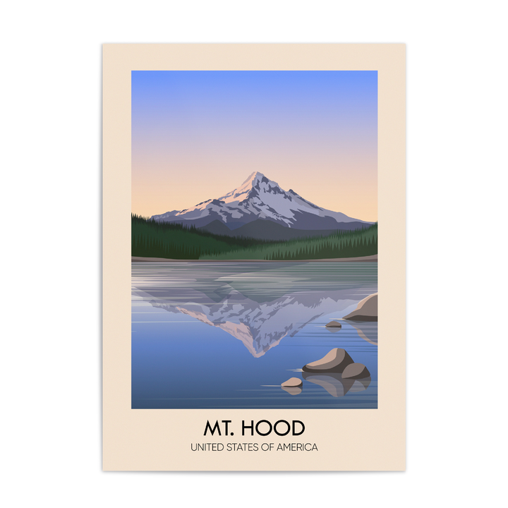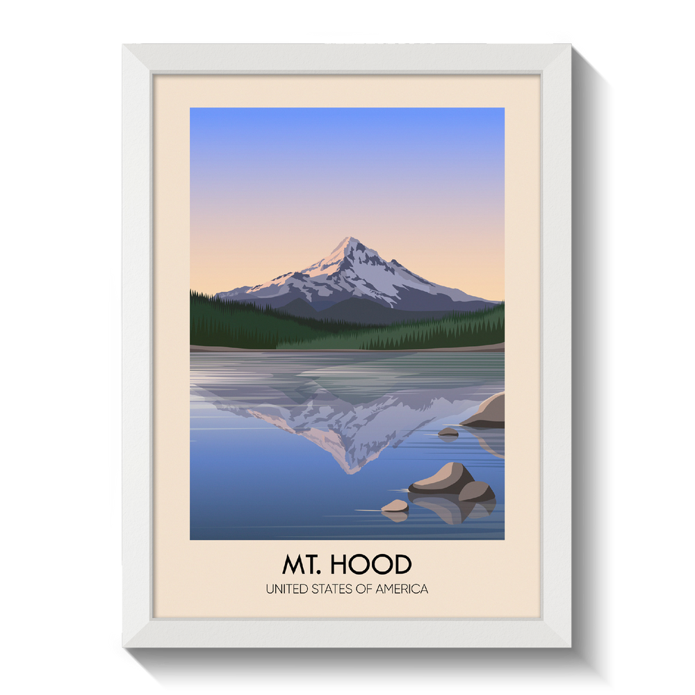 An original travel poster featuring the famous Mt Hood, in Mount Hood National Forest, Oregon. It is  a popular tourist and recreation area that extends along the Cascade Range from the Columbia River. From hiking to wineries to skiing the slopes, Oregon's Mt Hood Territory is a region that's rich in natural beauty, culture, & history.