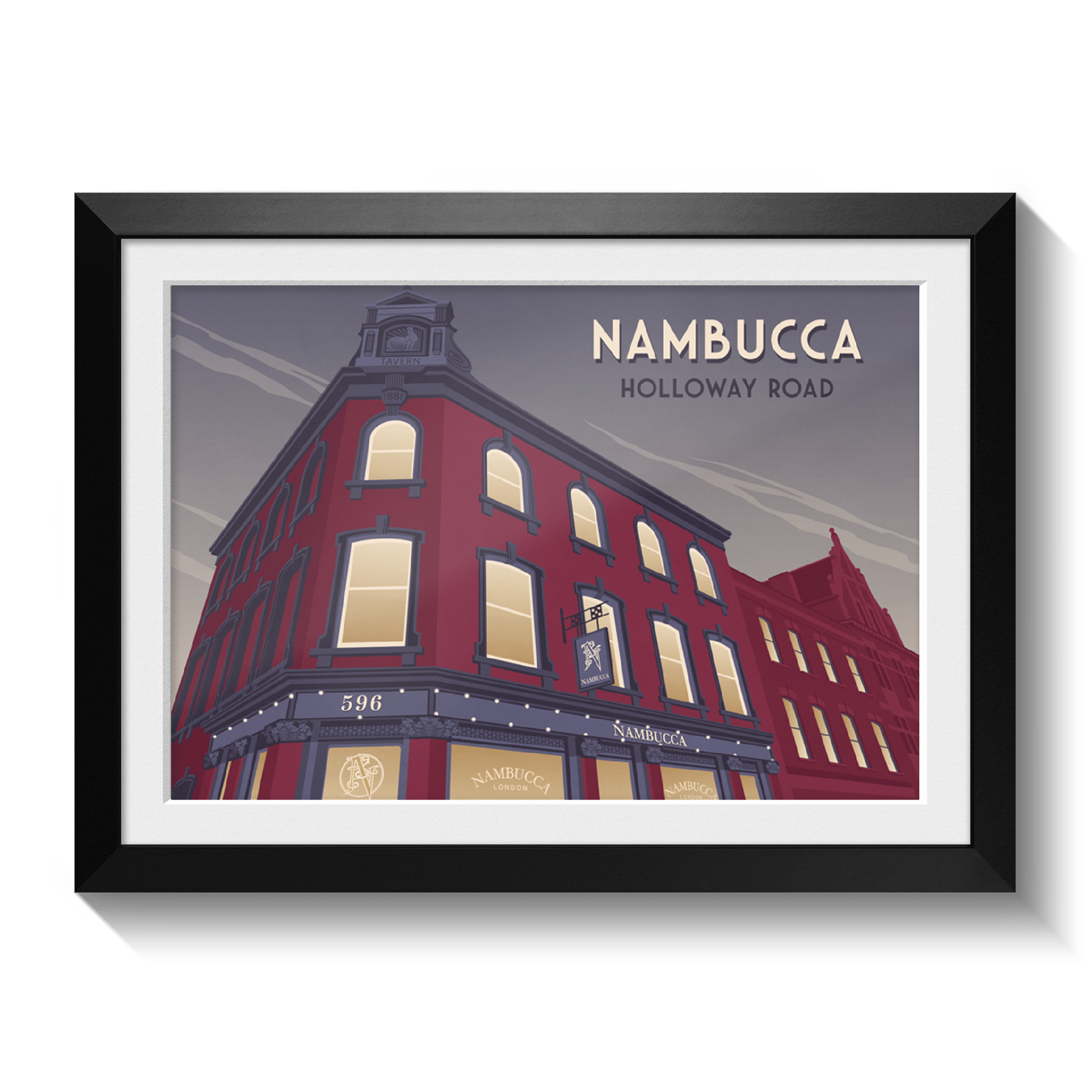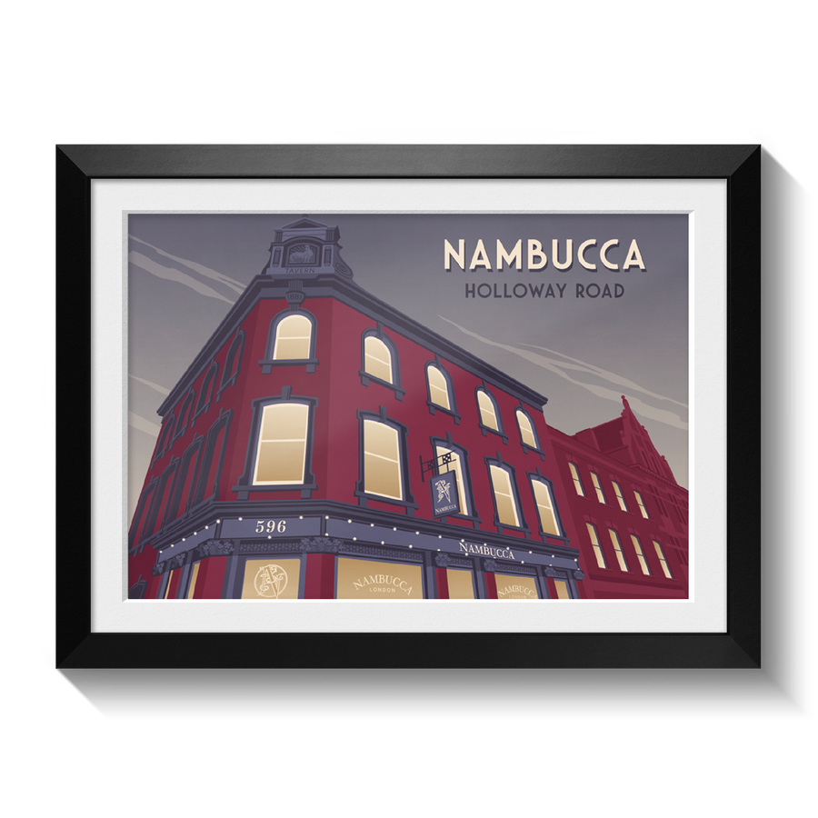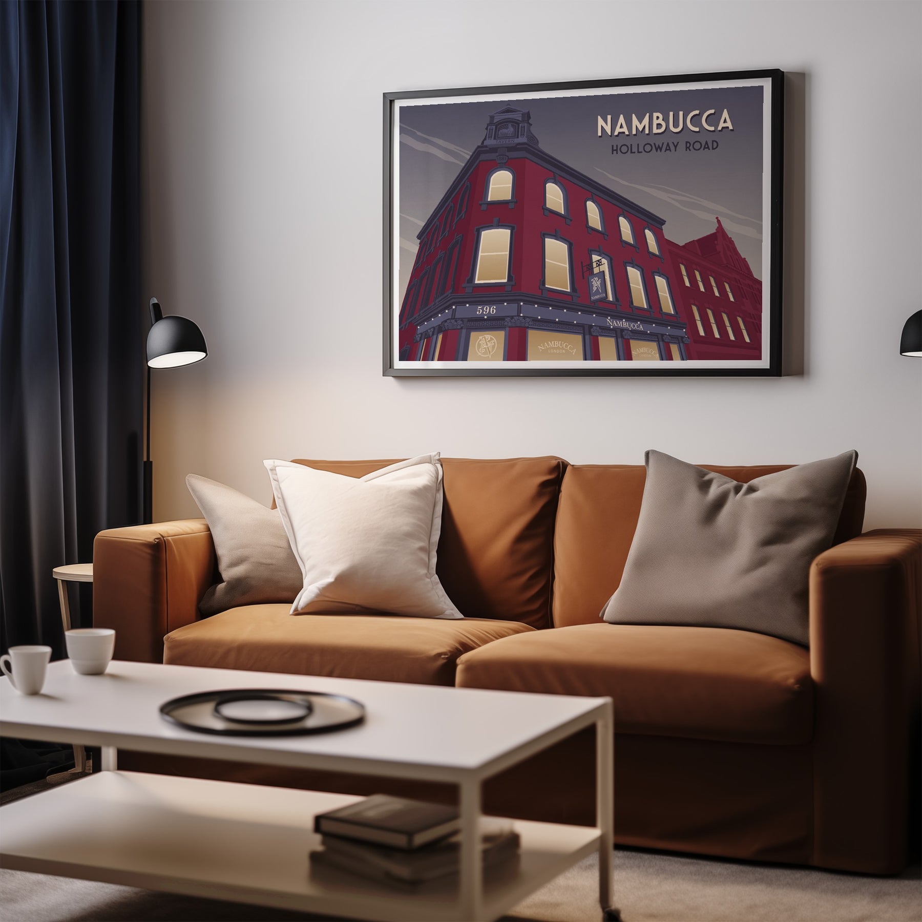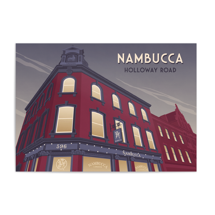 A minimalist music venue travel poster featuring the iconic Nambucca Music venue on Holloway Road, North London.