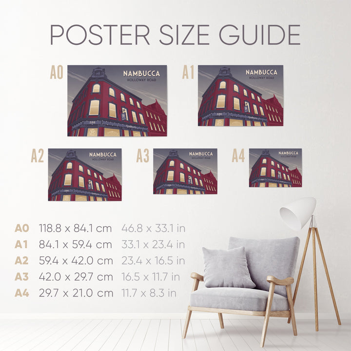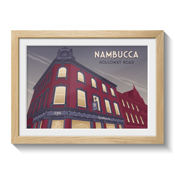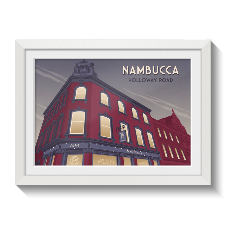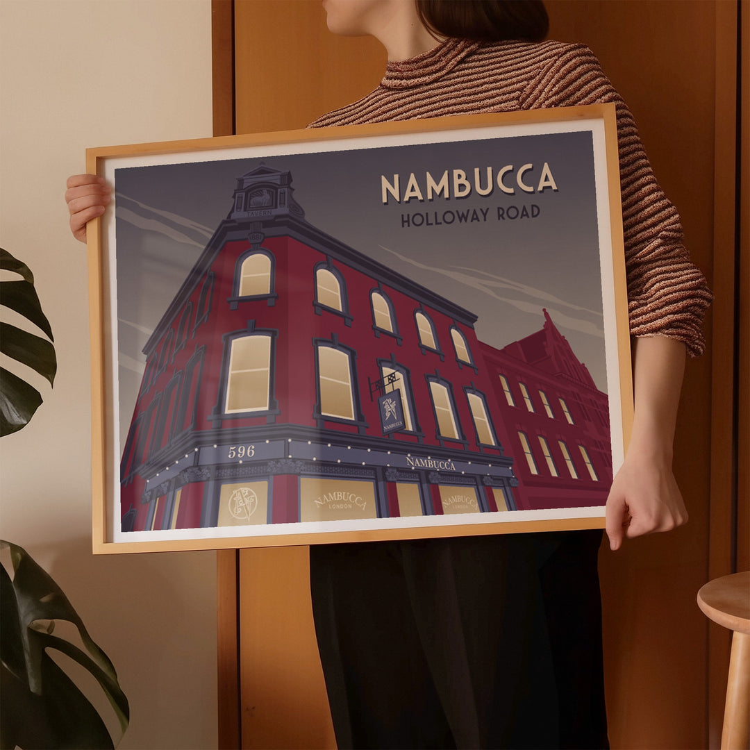 A minimalist music venue travel poster featuring the iconic Nambucca Music venue on Holloway Road, North London.