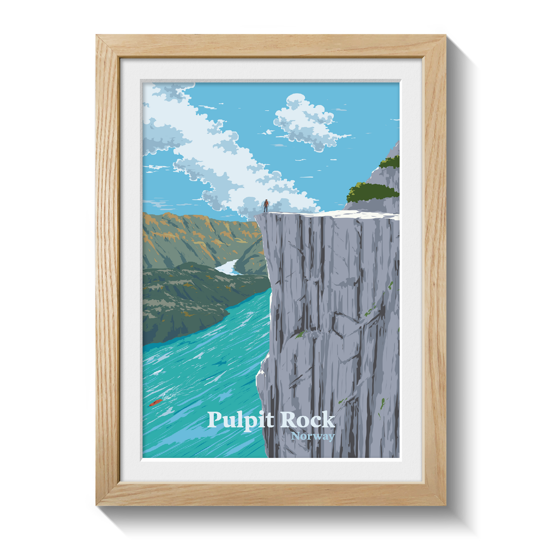 This travel poster features the famous Pulpit Rock aka Preikestolen in the Scandinavian Mountains, Norway.