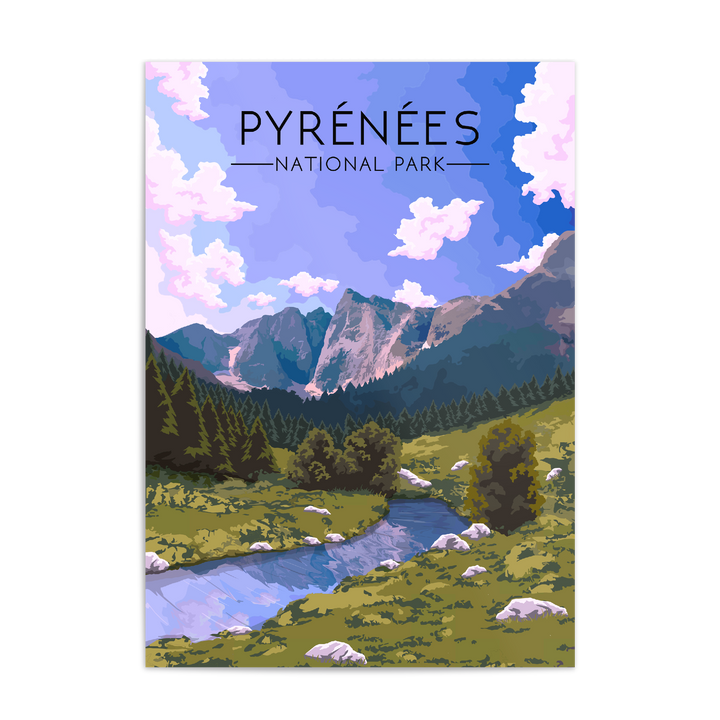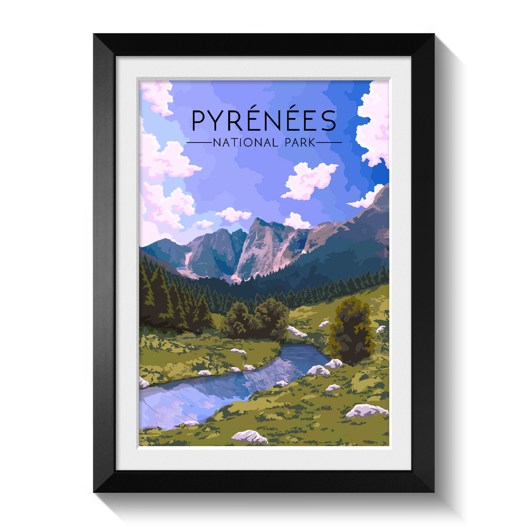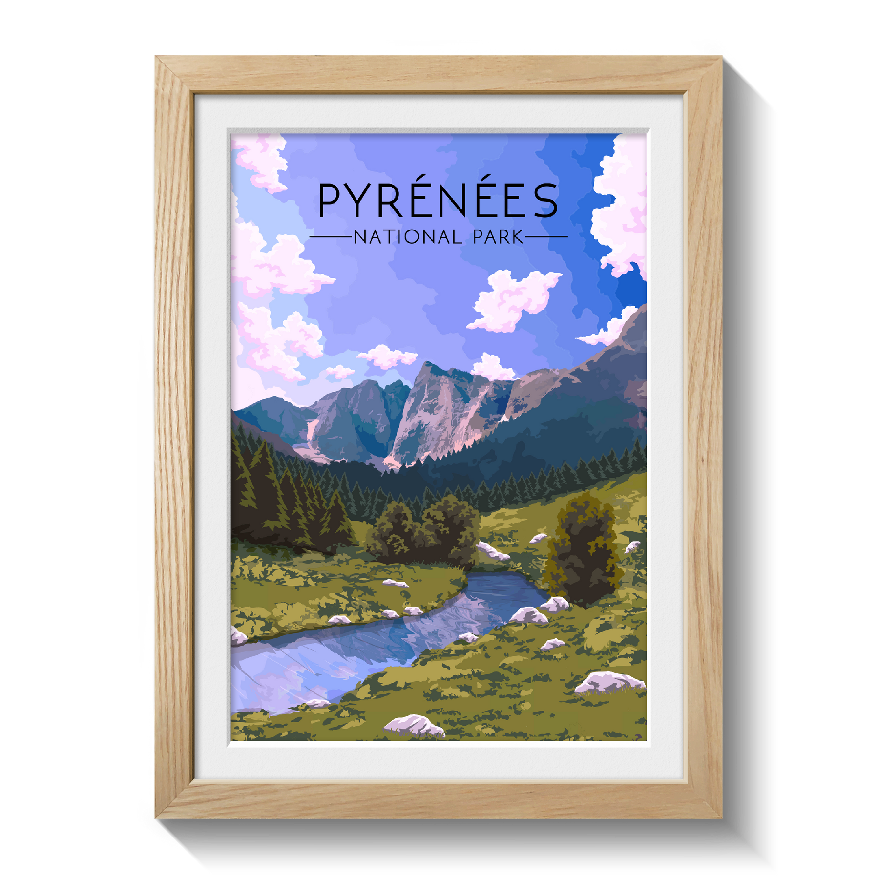 An original travel poster featuring Pyrenees National Park in France, on the border with Spain.