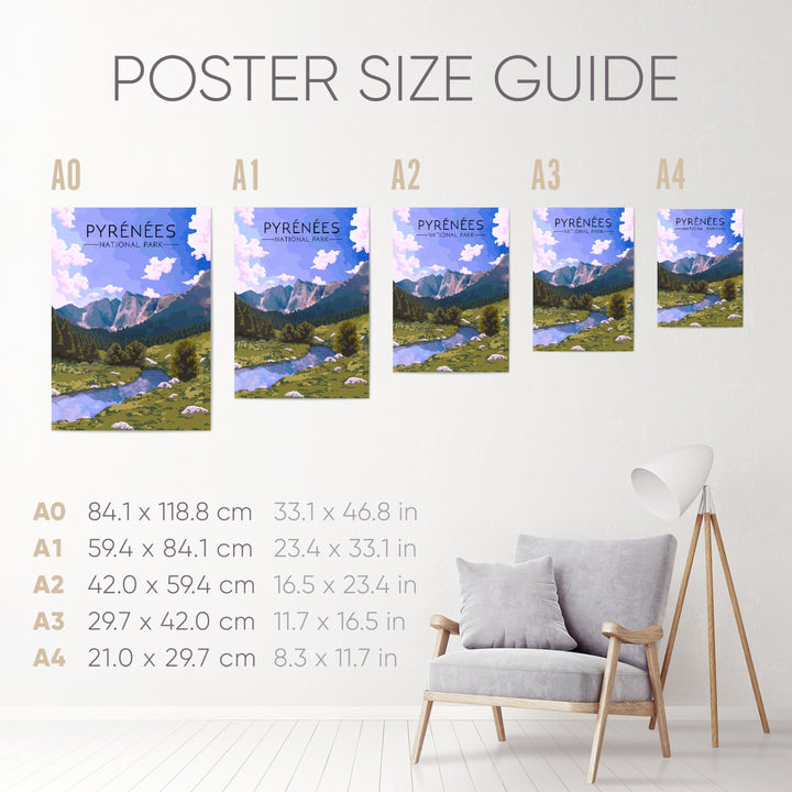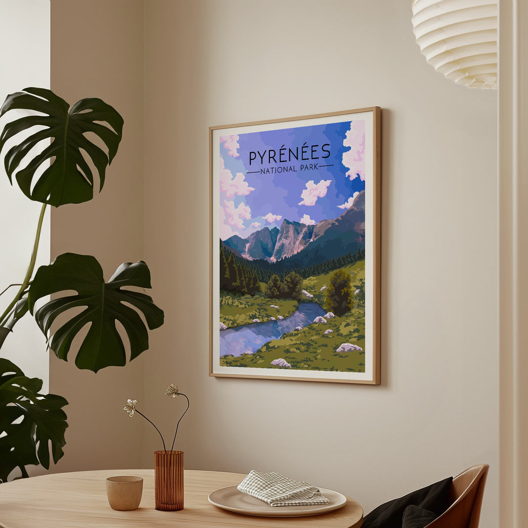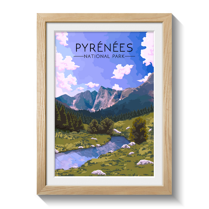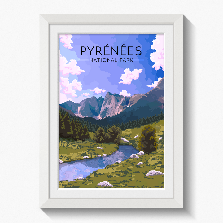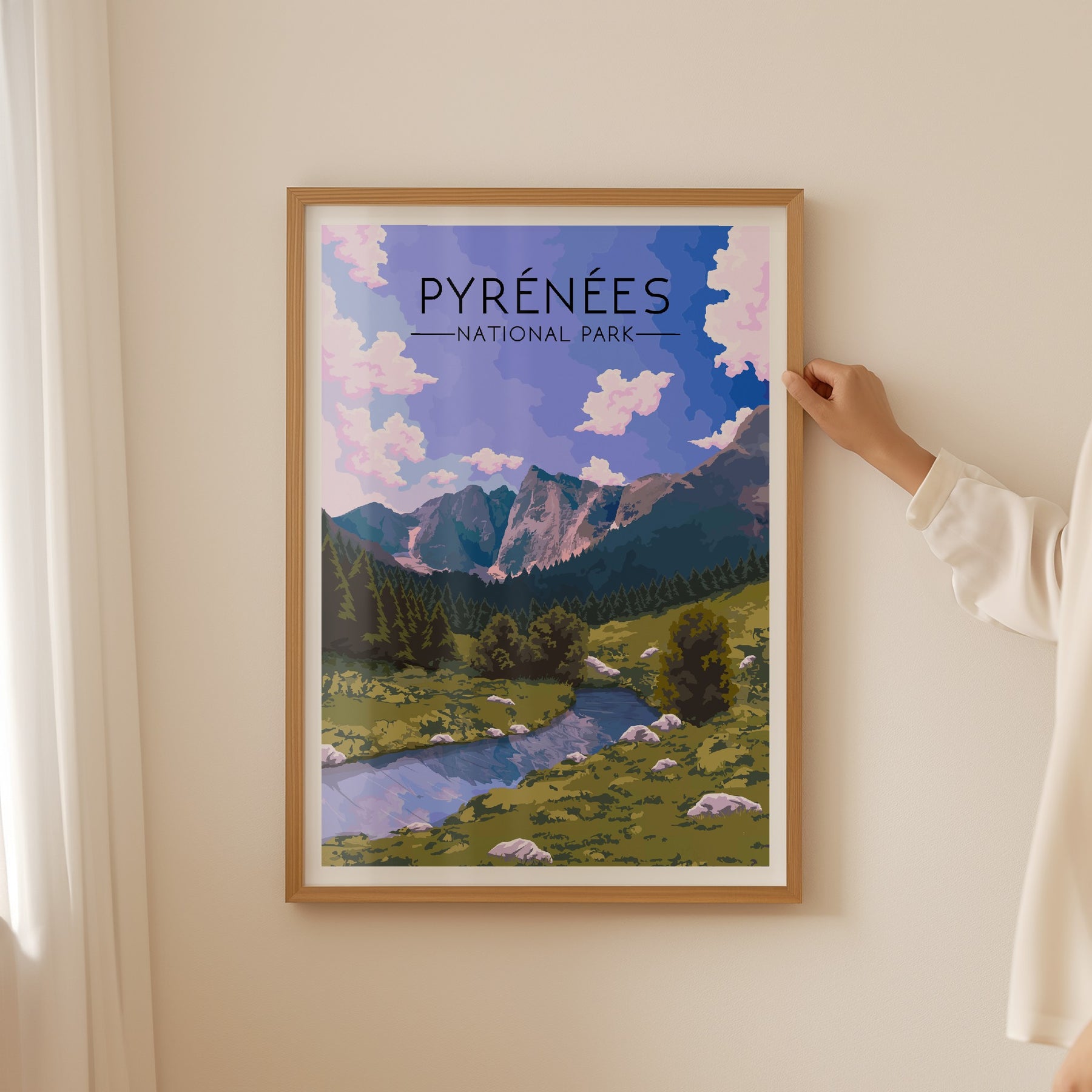 An original travel poster featuring Pyrenees National Park in France, on the border with Spain.