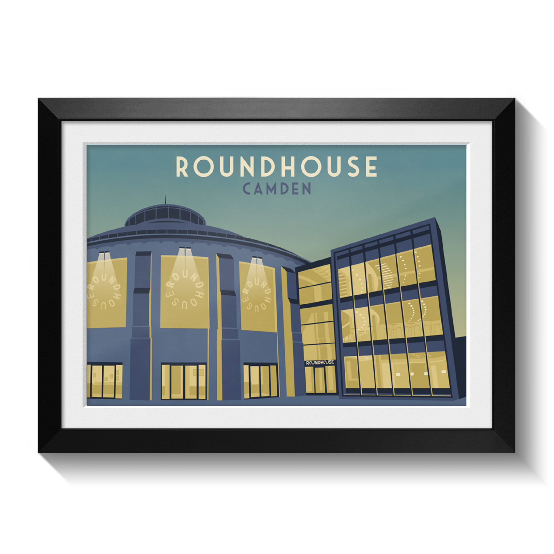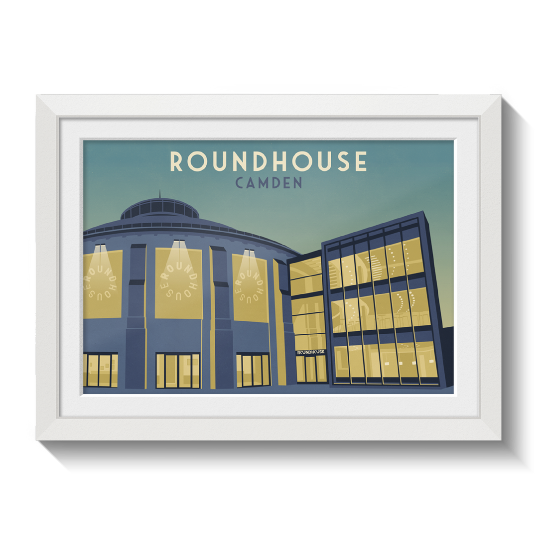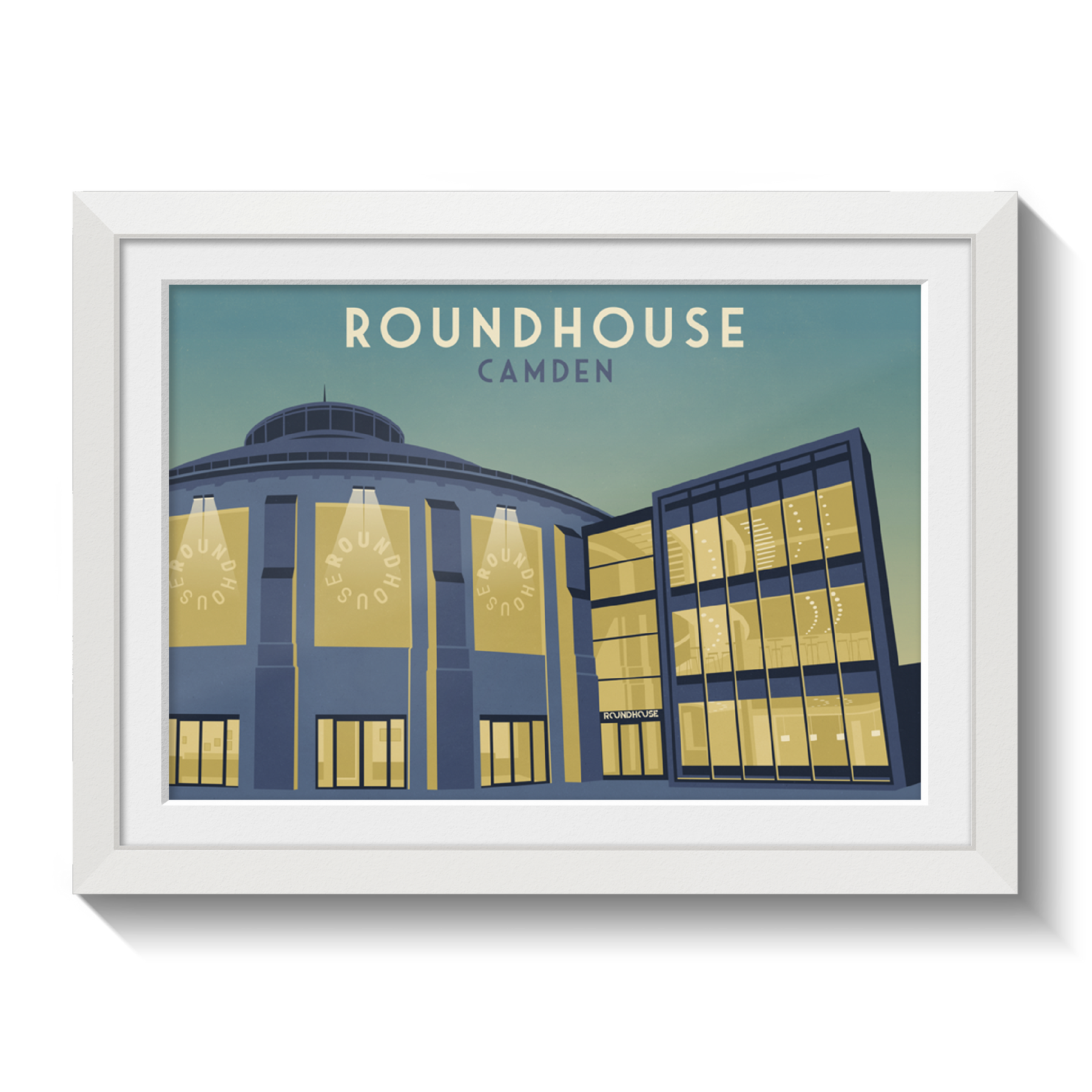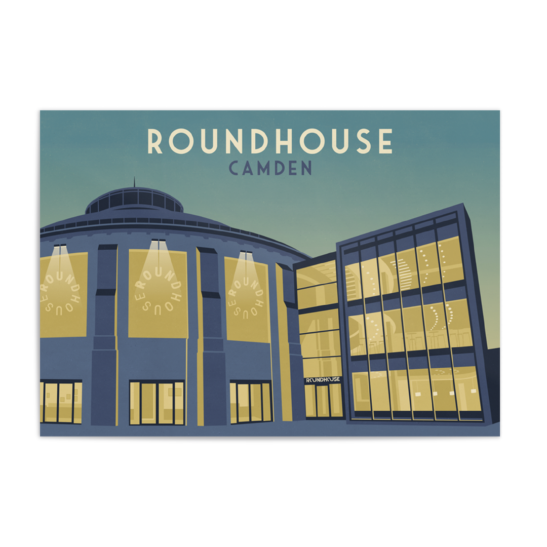 A minimalist music venue travel poster featuring the iconic Roundhouse Music venue in Camden.