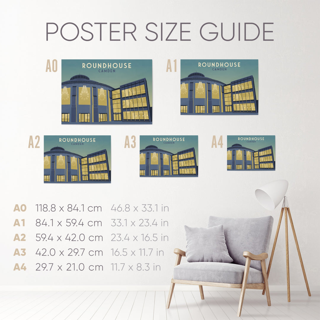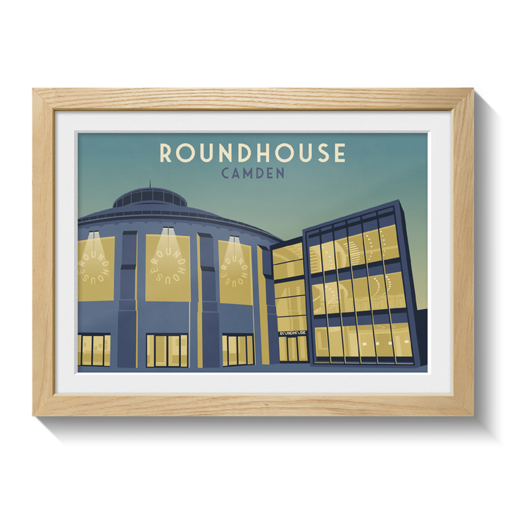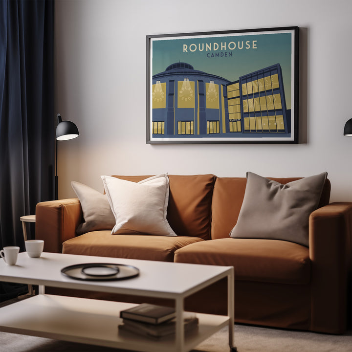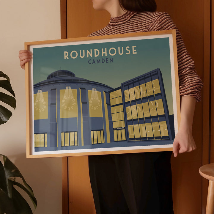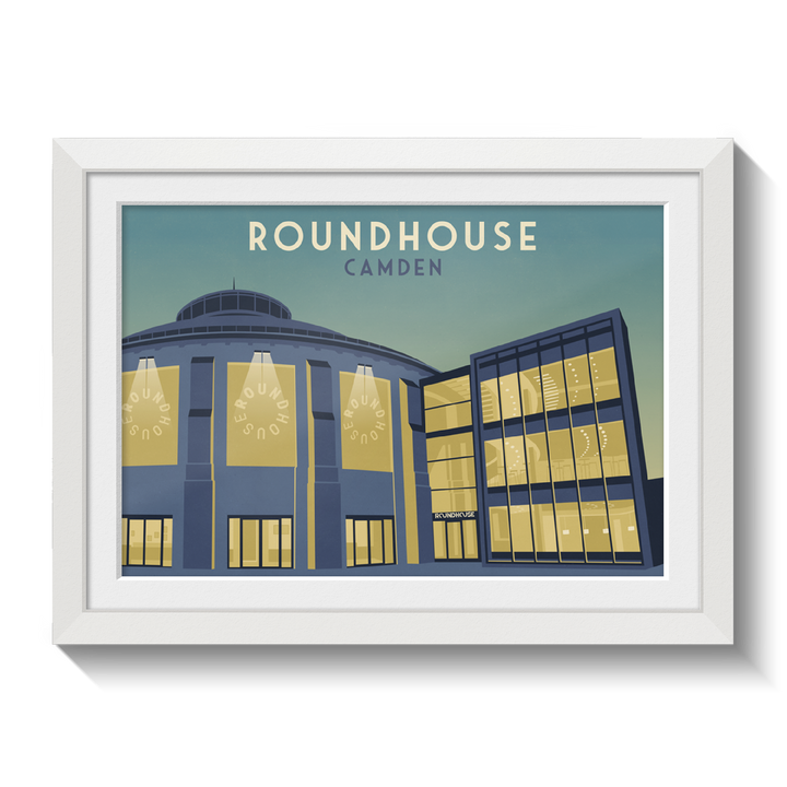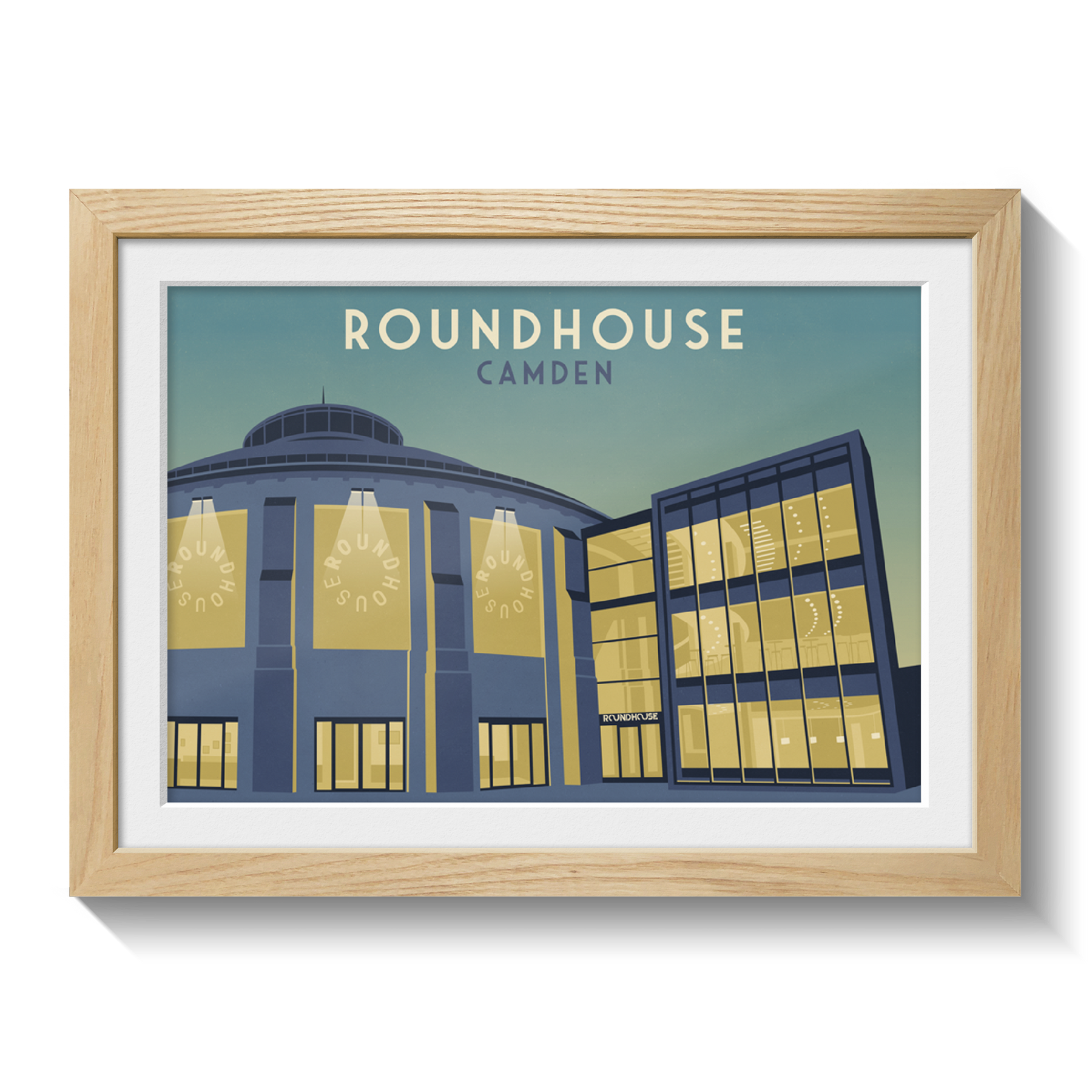 A minimalist music venue travel poster featuring the iconic Roundhouse Music venue in Camden.