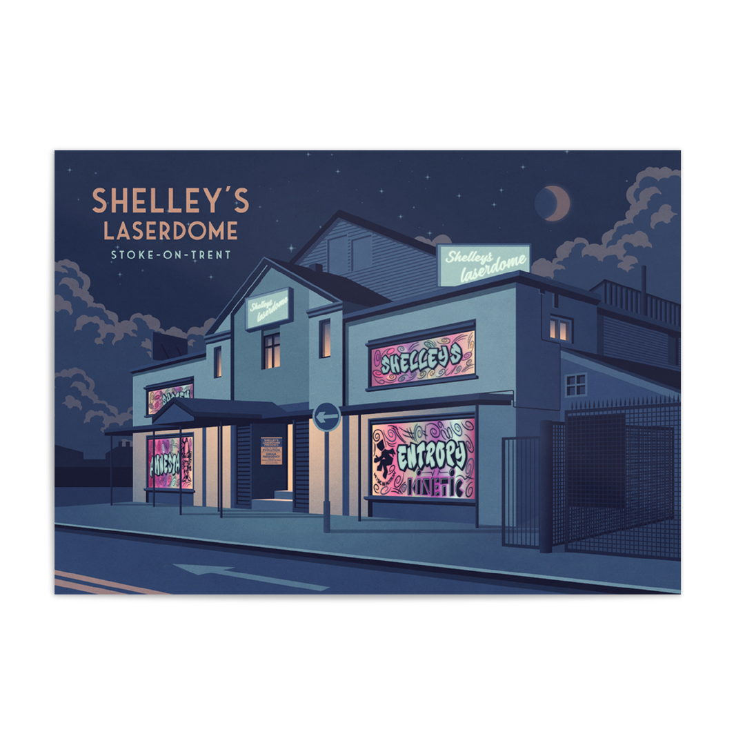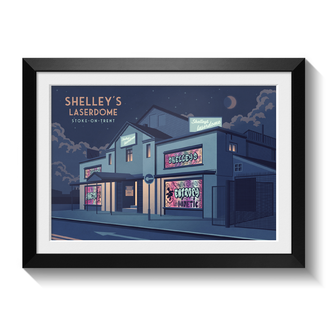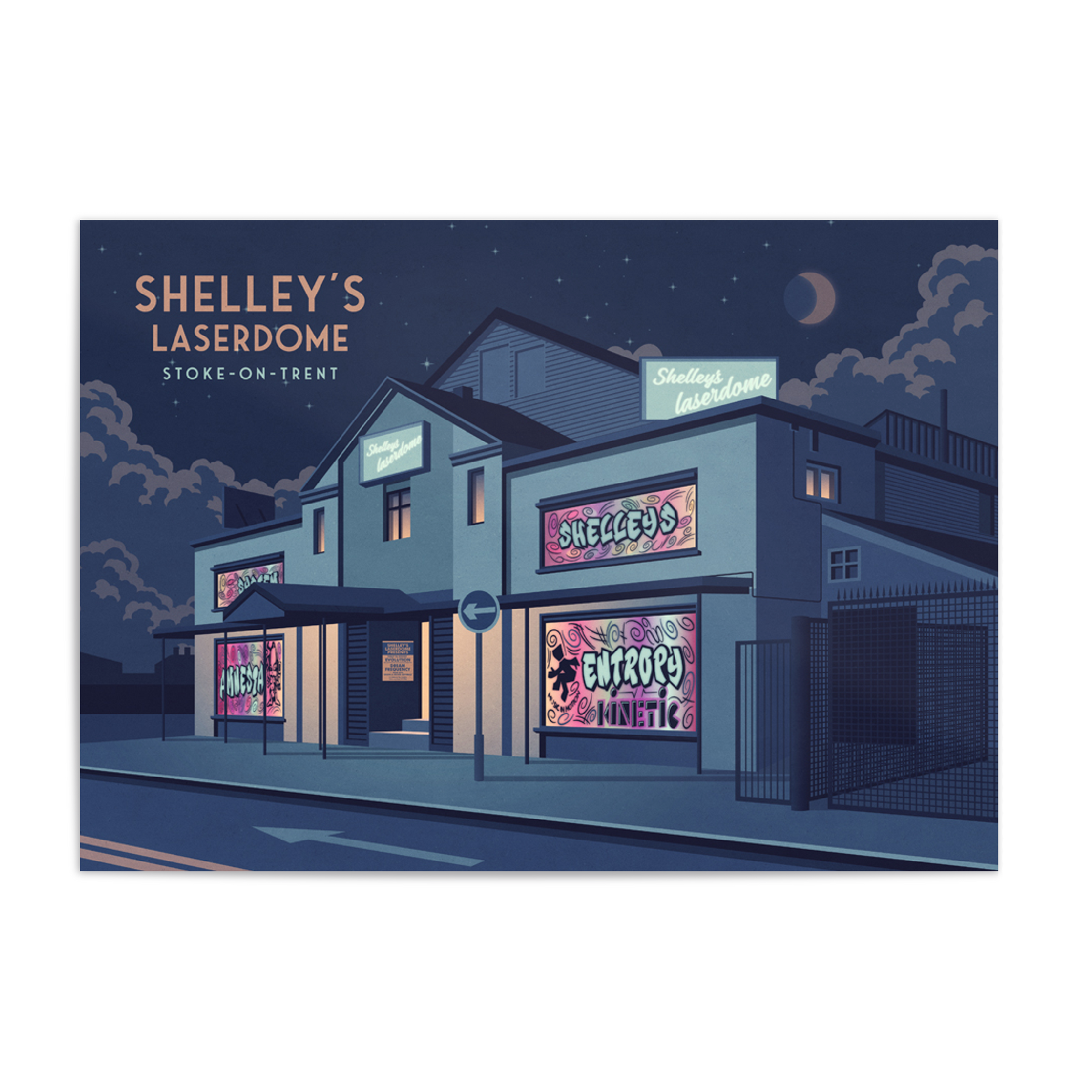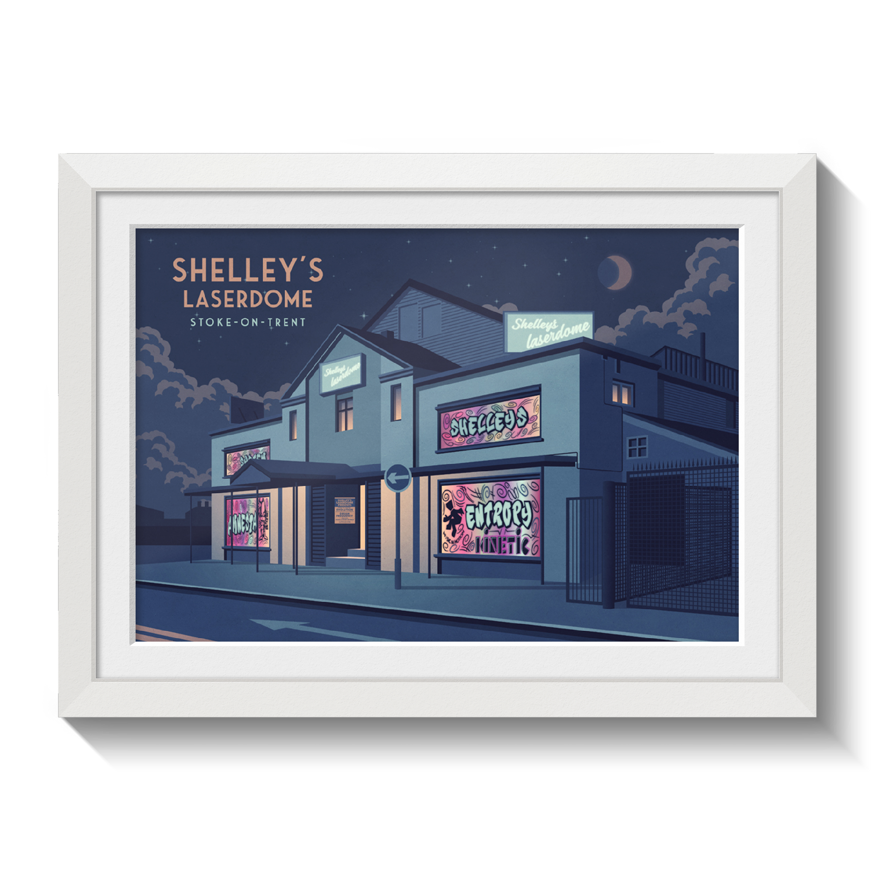 An original travel poster featuring iconic 90s rave club, Shelley's Laserdome.