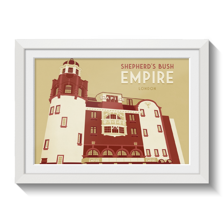 An original travel poster featuring legendary live music venue Shepherd's Bush Empire in West London.