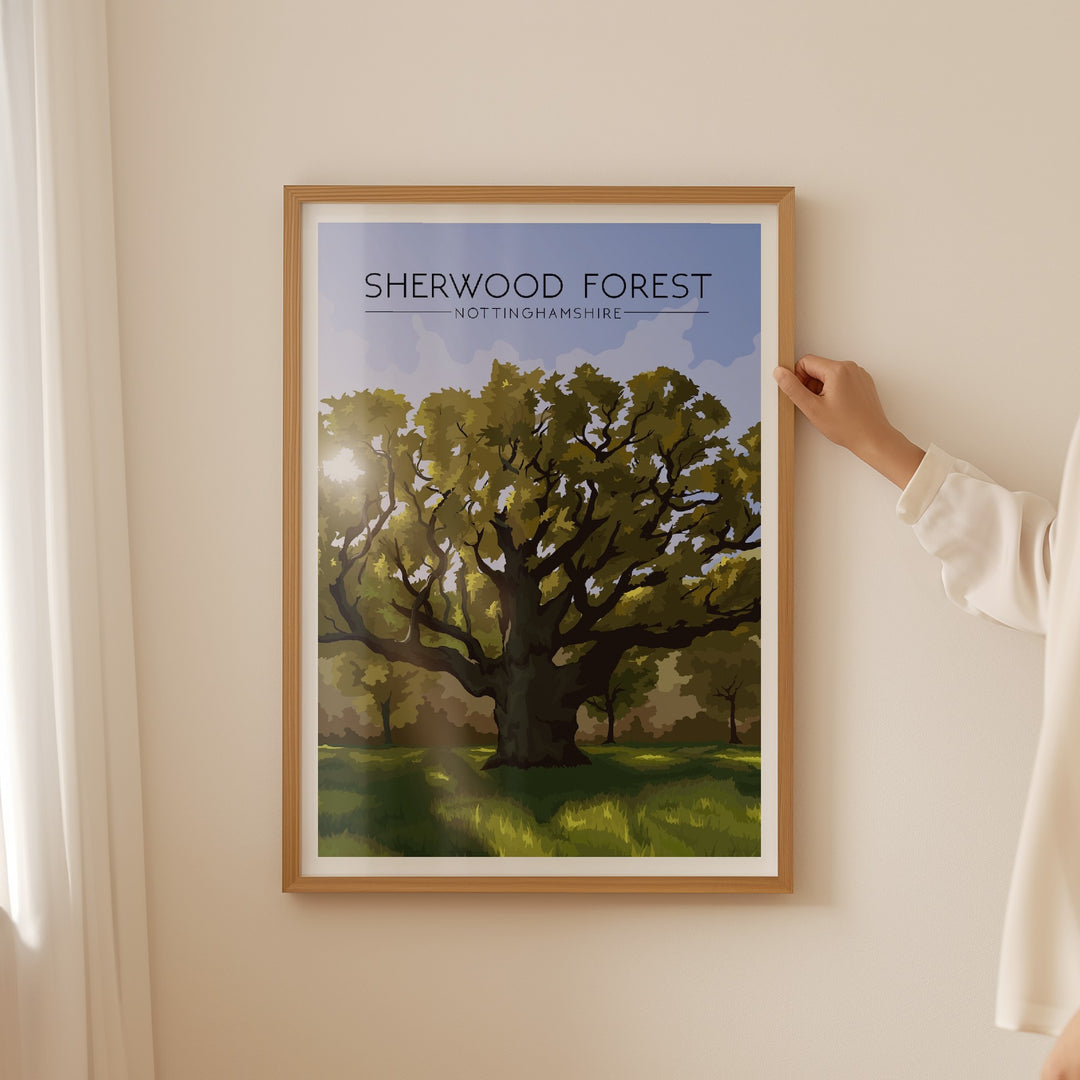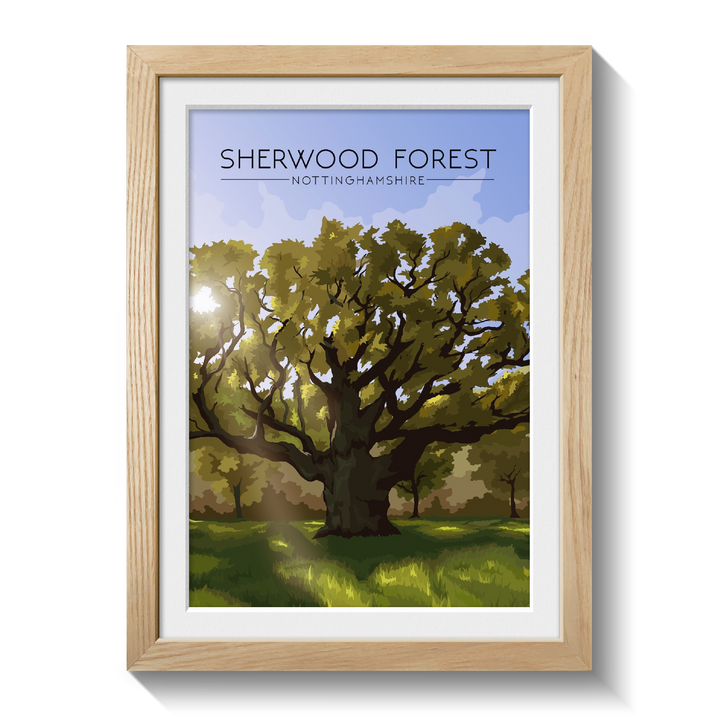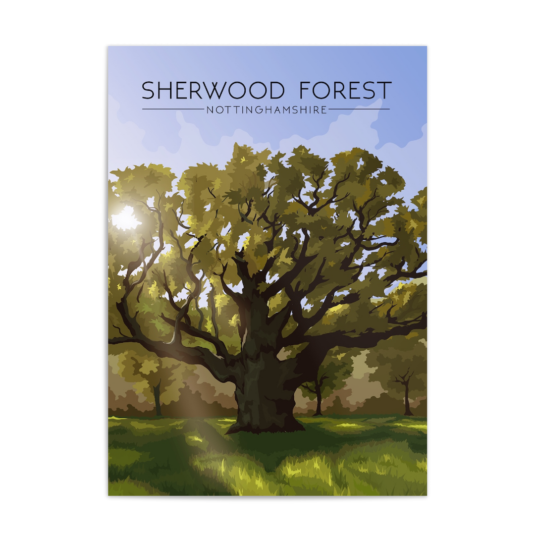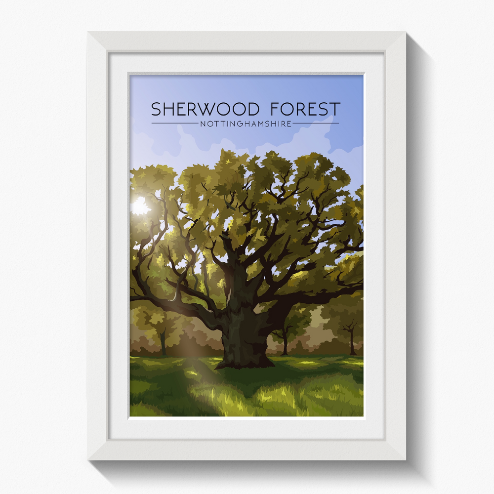 An original travel poster featuring the famous Sherwood Forest in Nottinghamshire. Sherwood Forest is most famous for its association with Robin Hood. The poster features the 'Major Oak'. Thought to be the oldest living tree in the forest at over 1000 years old, legend has it that Robin Hood and his Merry Men would have sheltered underneath this tree in their day.