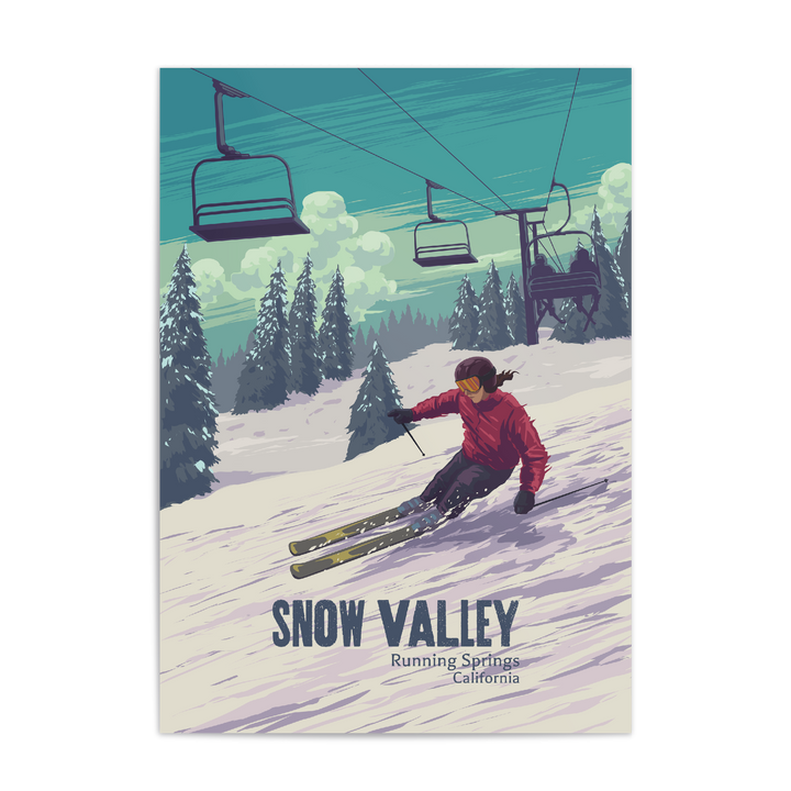 An original skiing print featuring the resort of Snow Valley. Snow Valley mountain resort is located in Running Springs in the San Bernardino National Forest, Southern California. It was originally called Fish Camp due to the pond located in the area.