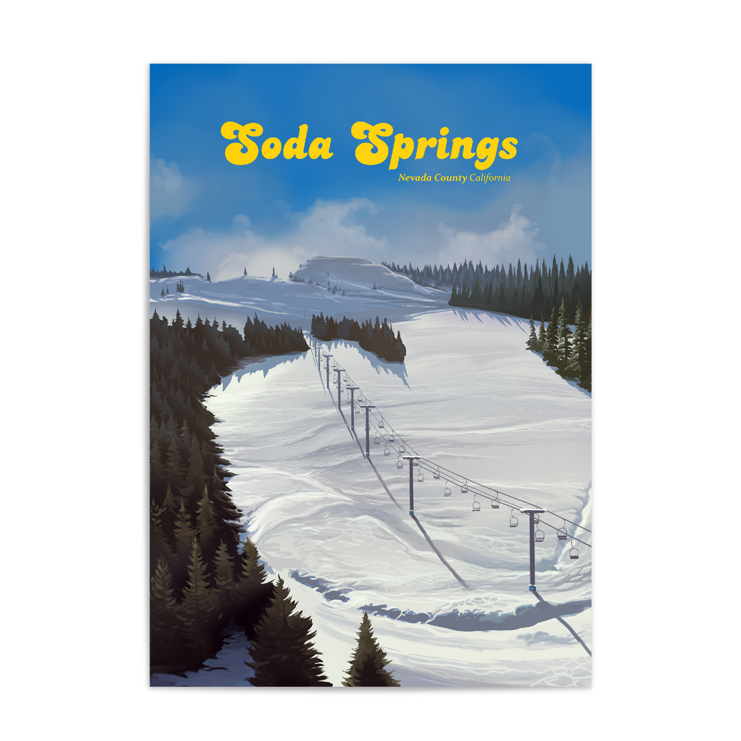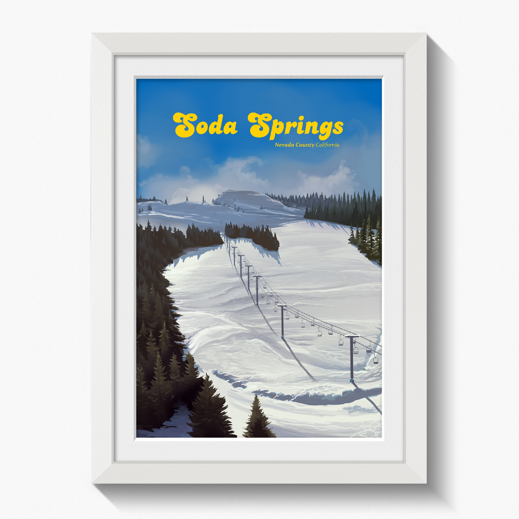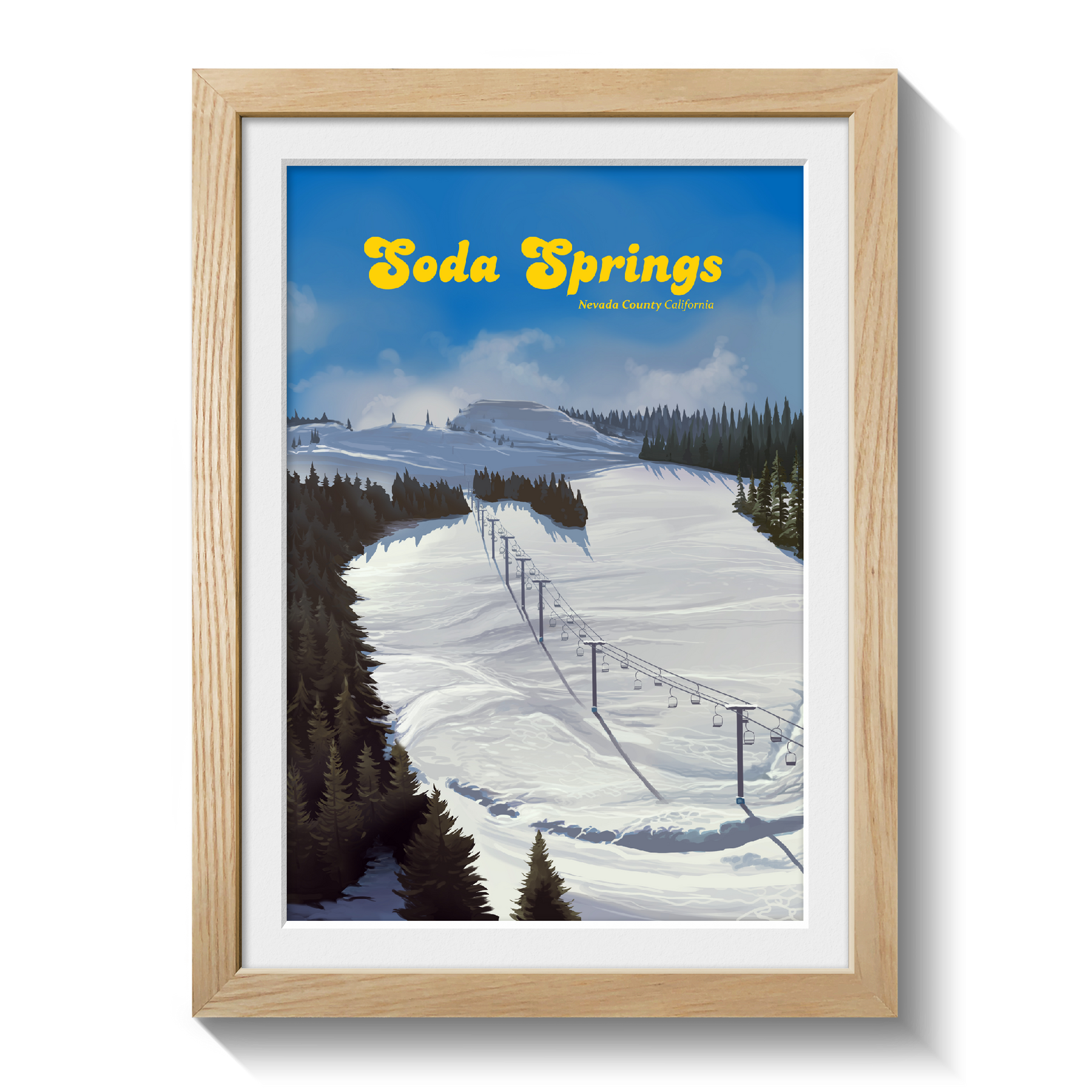 An original skiing print featuring the resort of Soda Springs, located in the Sierra Nevada mountain range in California. Soda Springs is one of closest ski areas to the San Francisco Bay Area.