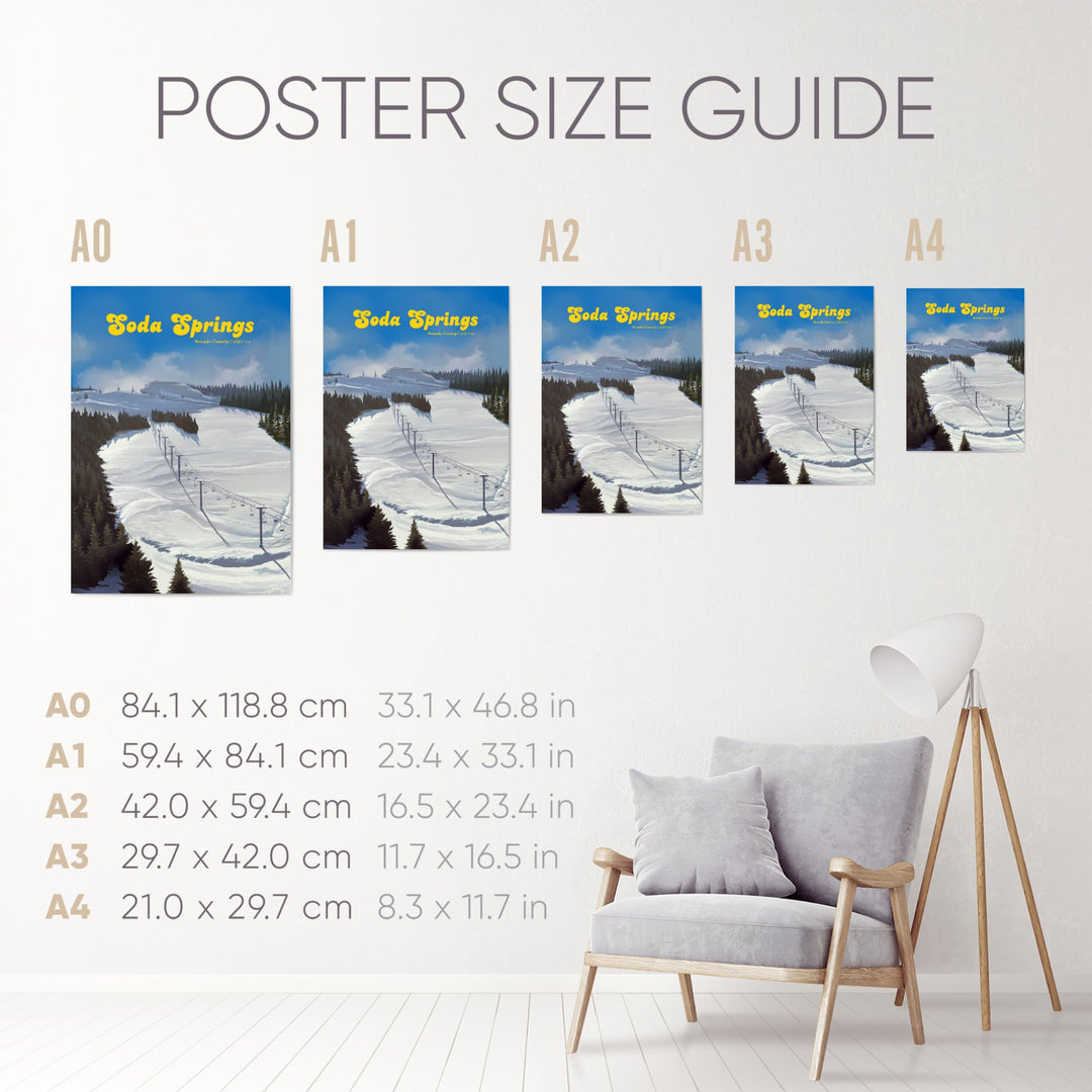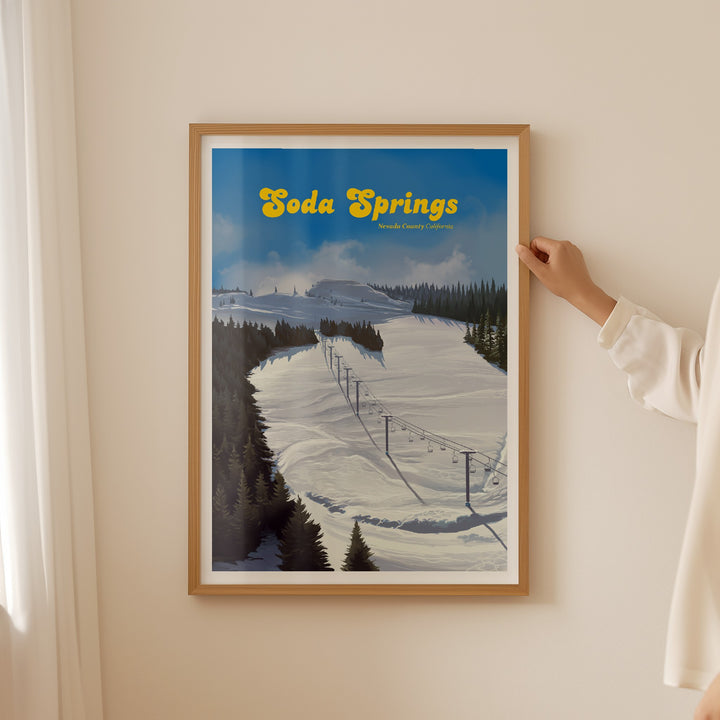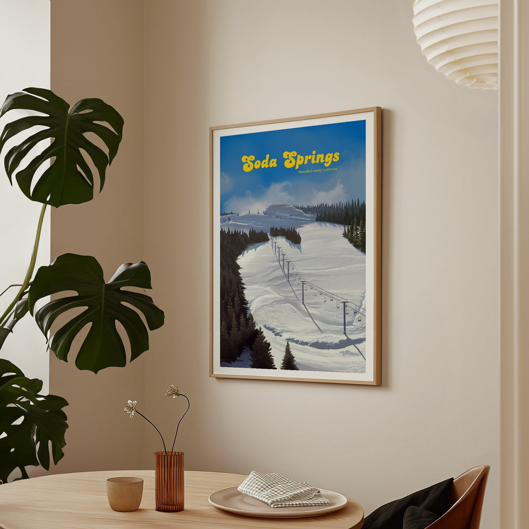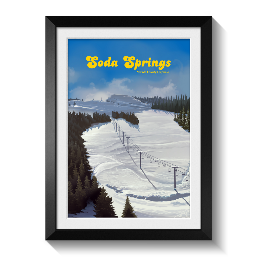 An original skiing print featuring the resort of Soda Springs, located in the Sierra Nevada mountain range in California. Soda Springs is one of closest ski areas to the San Francisco Bay Area.