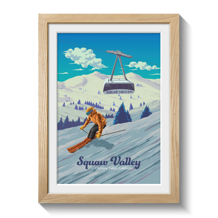 This is an original travel poster featuring popular Californian ski resort of Squaw Valley, situated in the Lake Tahoe area of California.