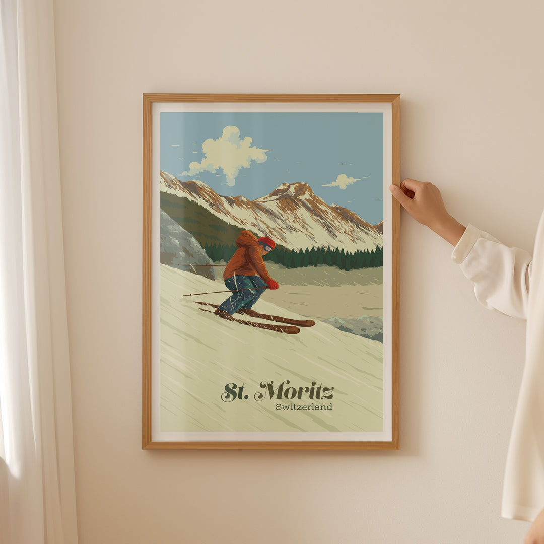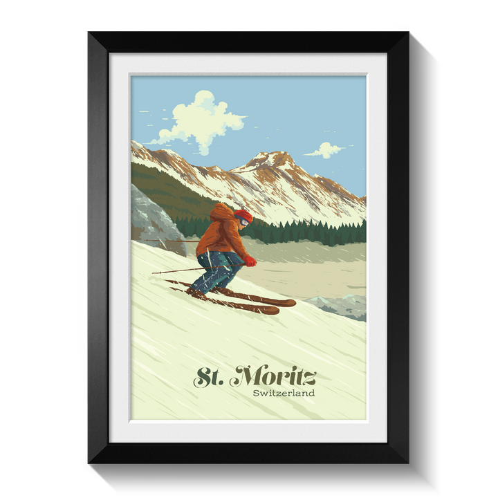 This is an original travel poster featuring the famous Swiss ski resort of St Moritz in the Engadin Valley in the Swiss Alps. St Moritz is home to the world famous Cresta Run; a bobsled run made of natural ice.