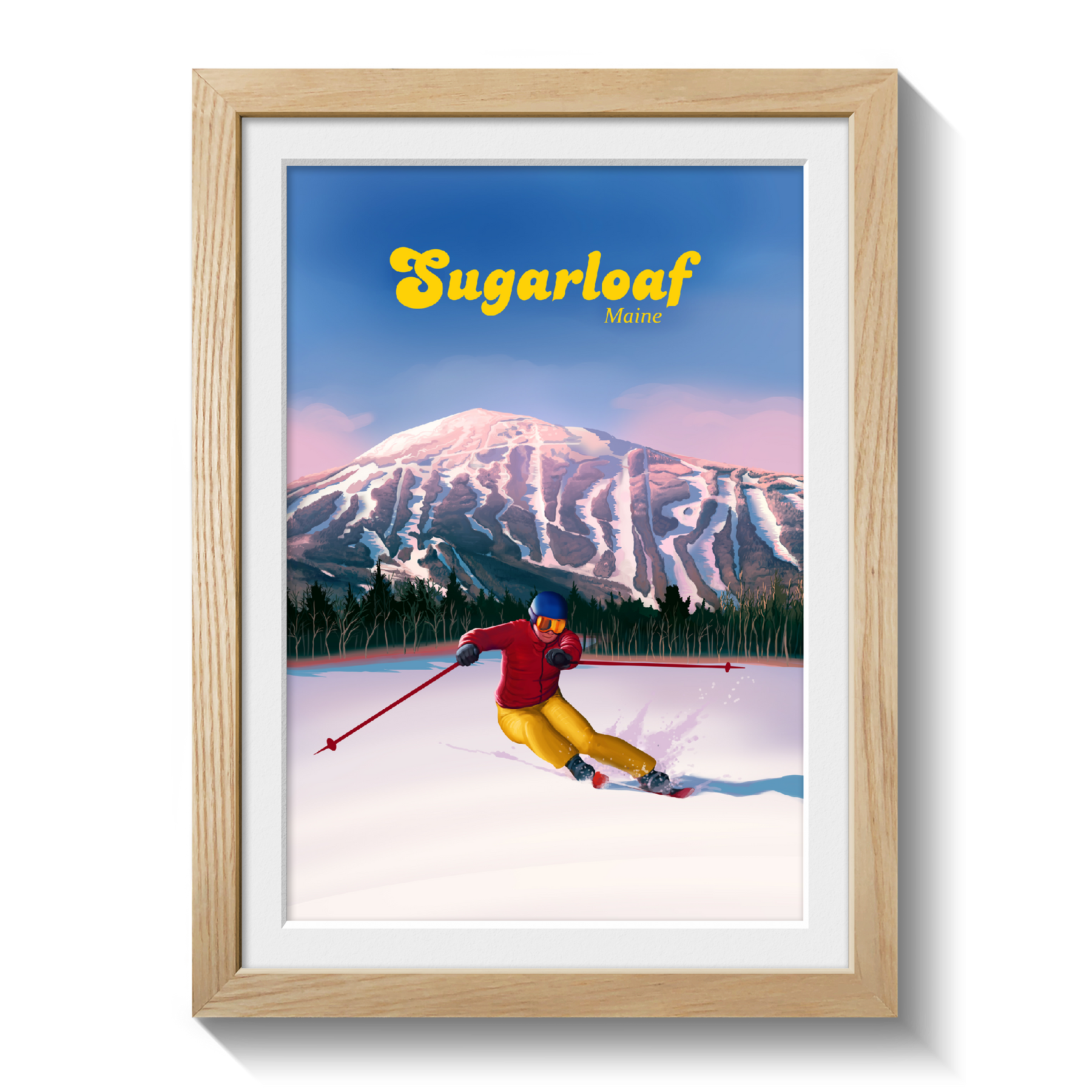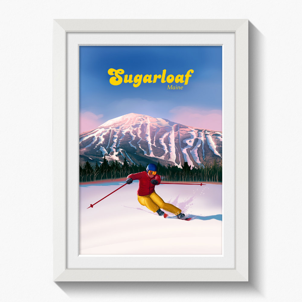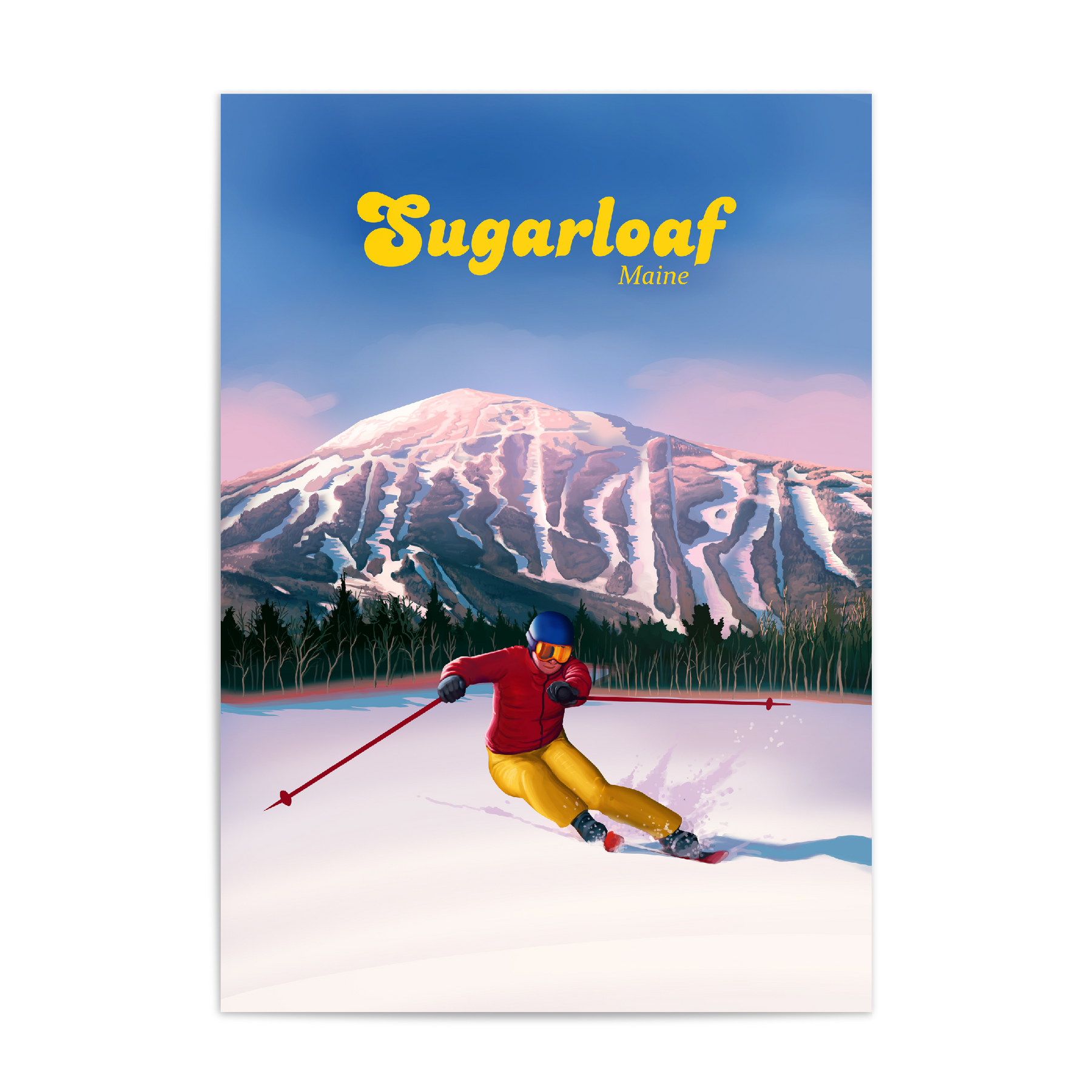 This is an original travel poster featuring Sugarloaf ski resort located on Sugarloaf Mountain in Carrabassett Valley, western Maine. It is one of New England's most famous resorts.