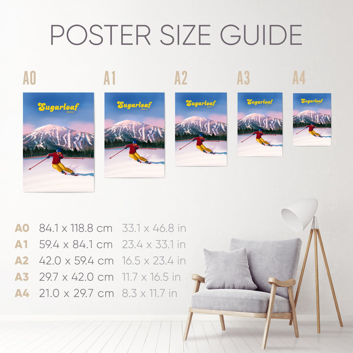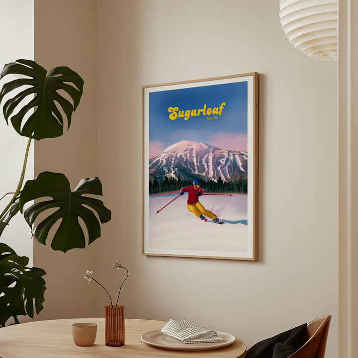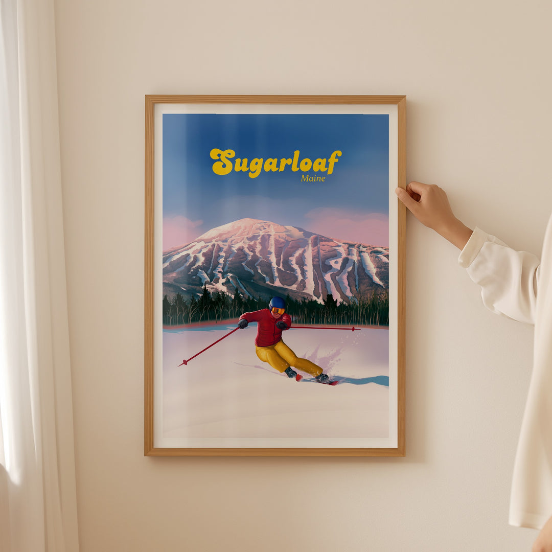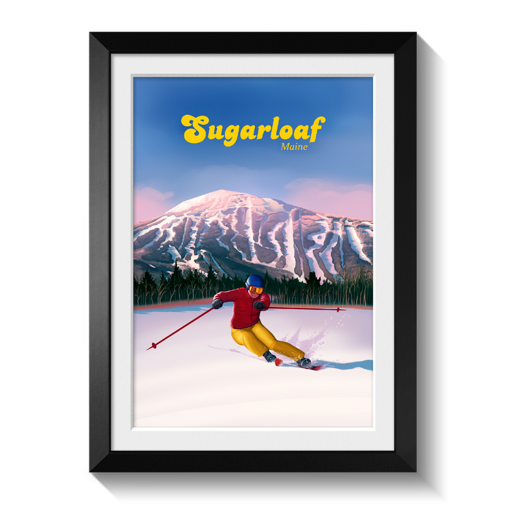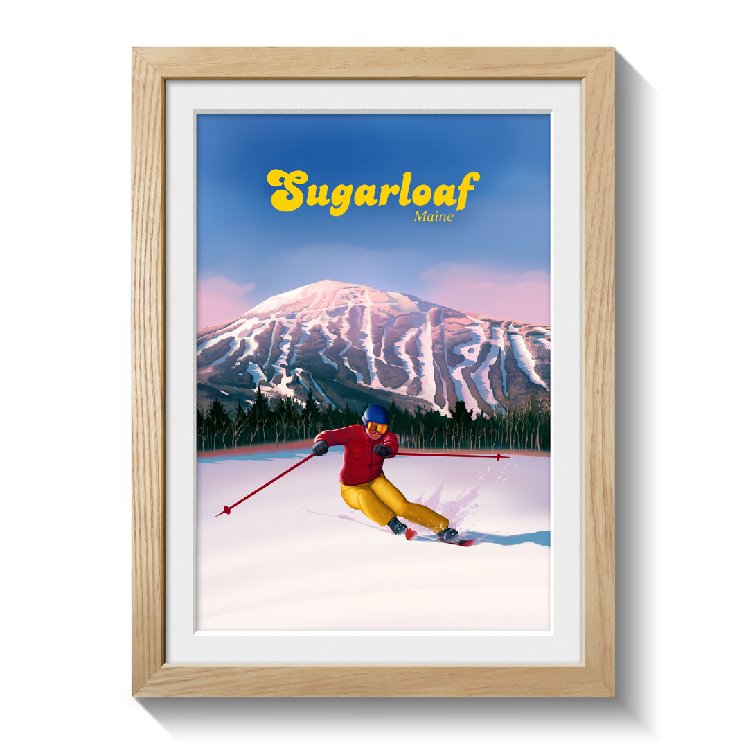 This is an original travel poster featuring Sugarloaf ski resort located on Sugarloaf Mountain in Carrabassett Valley, western Maine. It is one of New England's most famous resorts.
