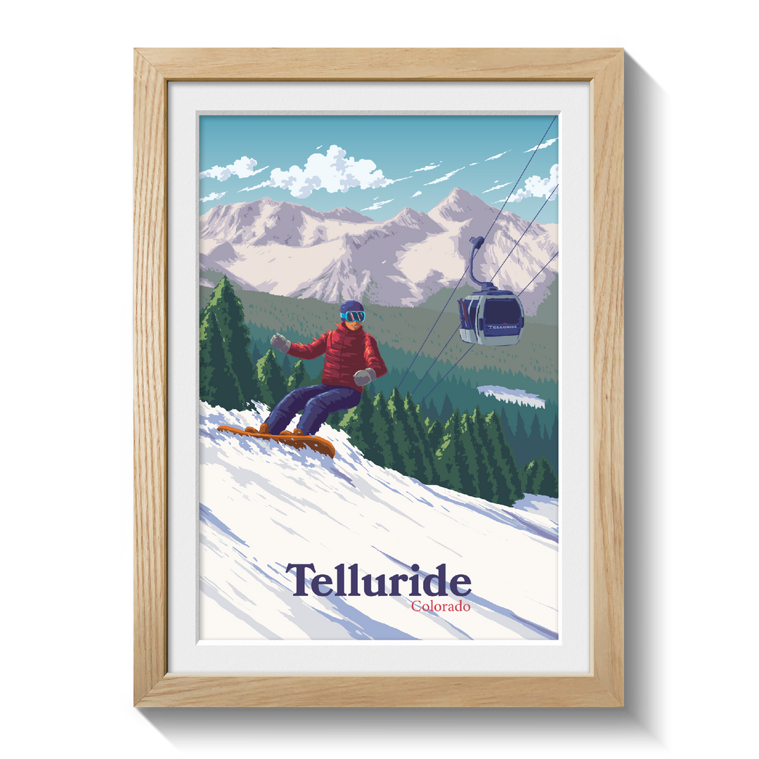 An original skiing print featuring the popular ski resort of Telluride, Colorado.