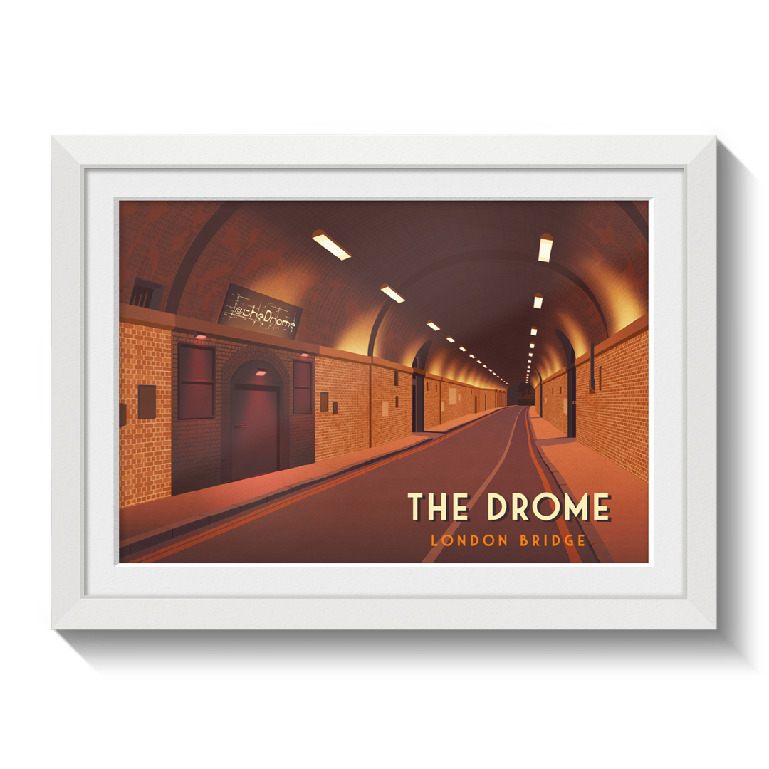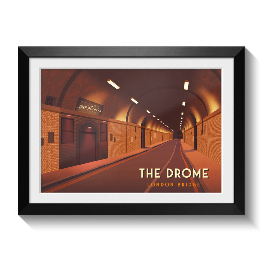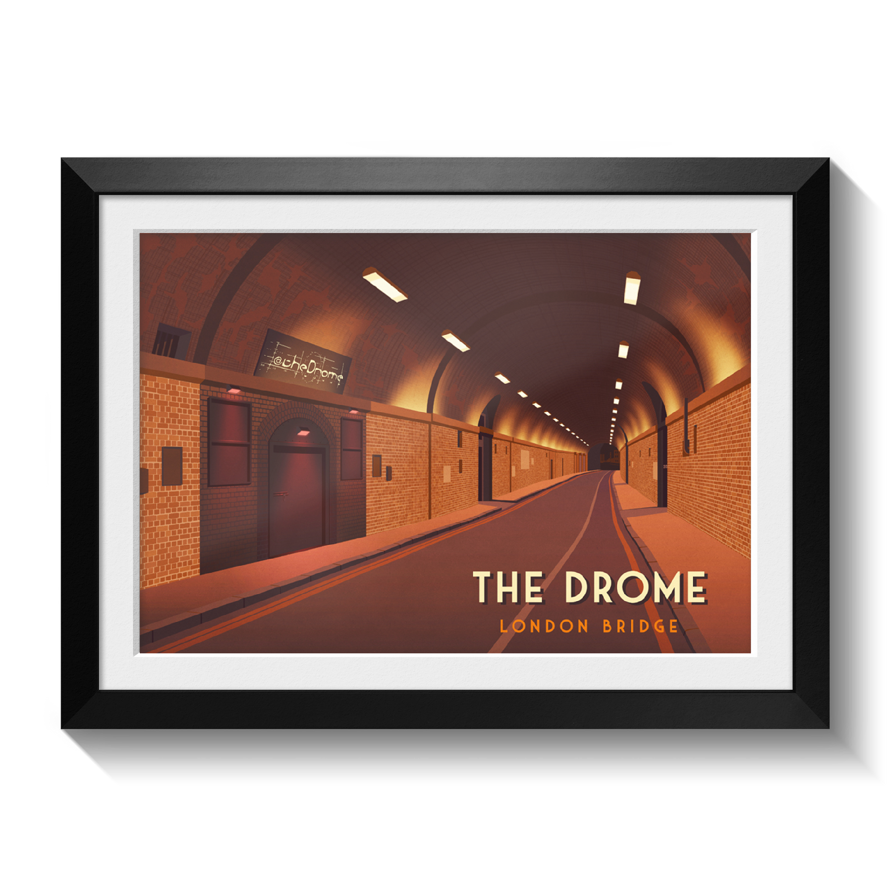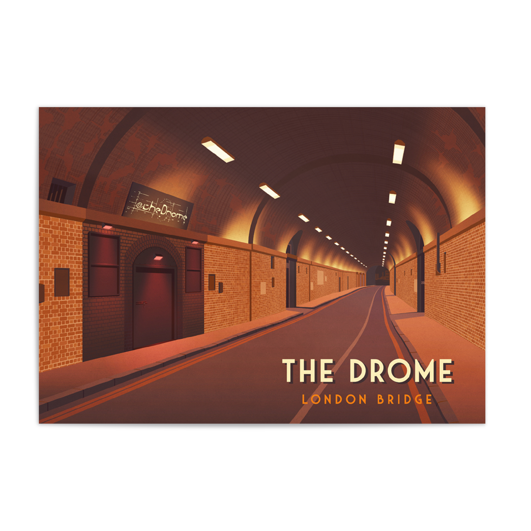 An original travel poster featuring London nightclub, The Drome. This Club was one of the largest clubs in London in the early 2000's with a capacity of 3000+ it was situated under London Bridge station in a labyrinth of arches. At later closed and was reopened as SeOne.