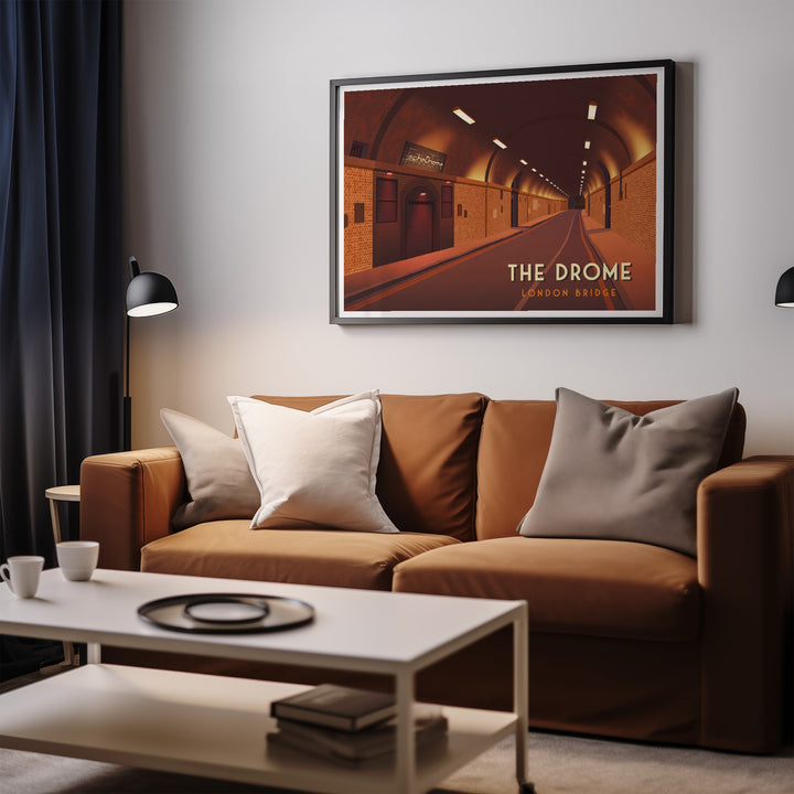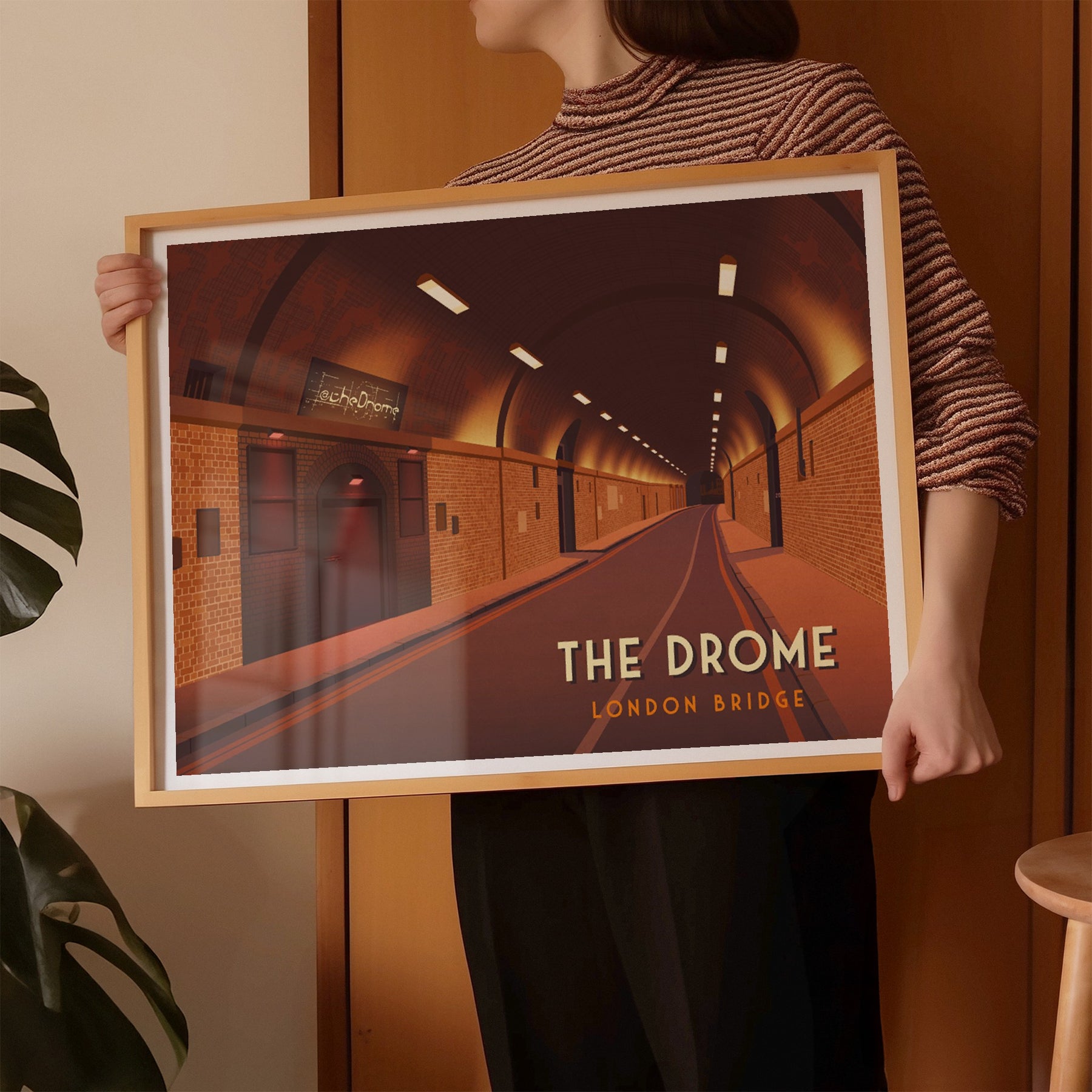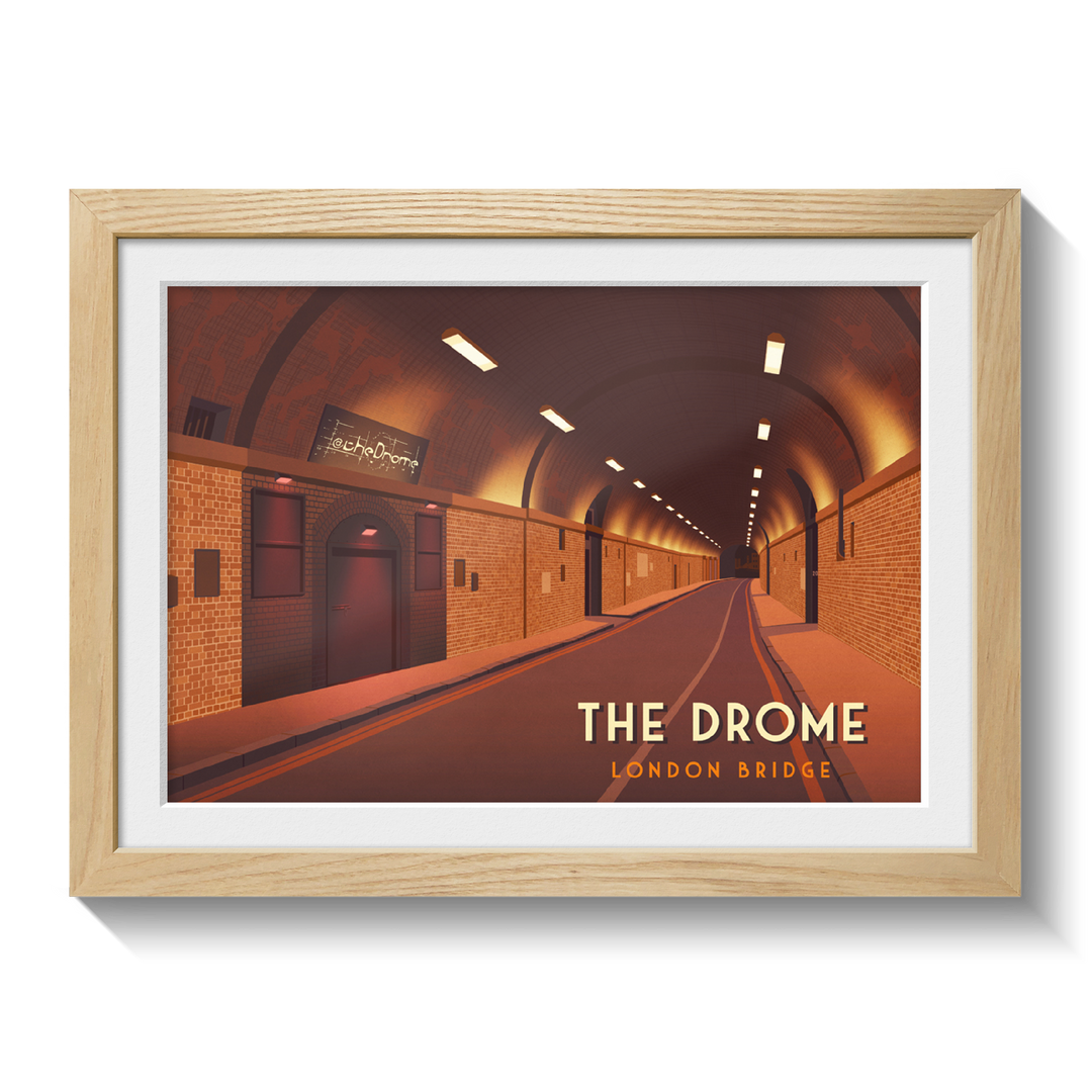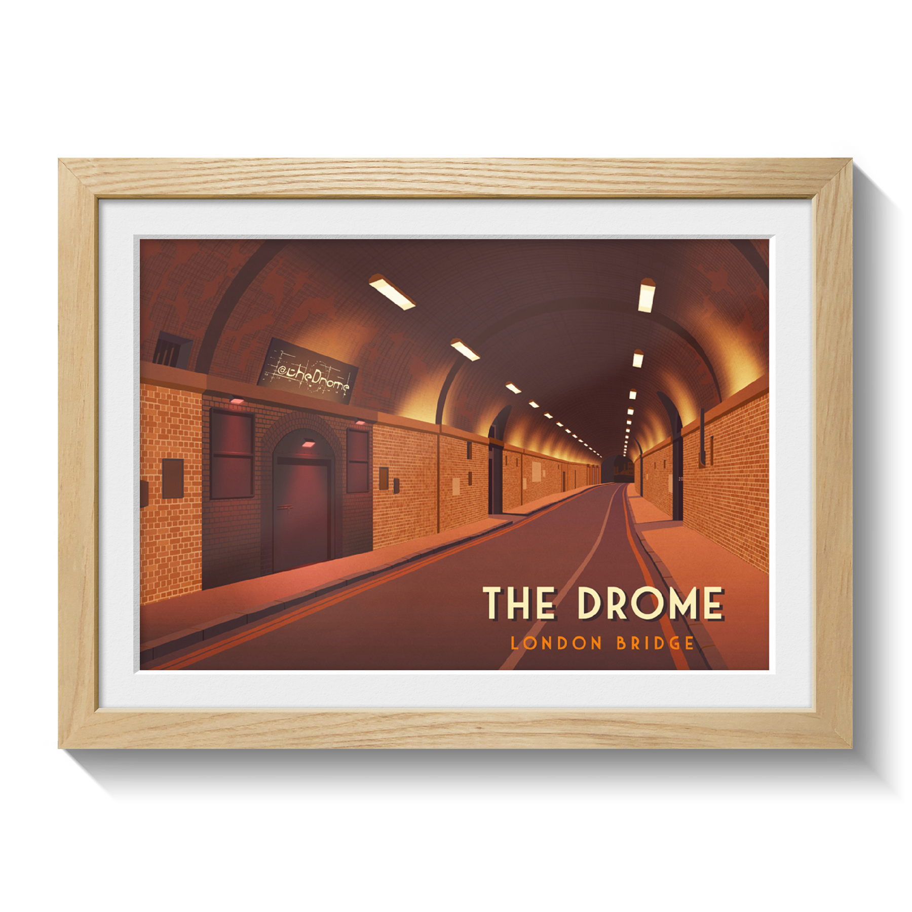 An original travel poster featuring London nightclub, The Drome. This Club was one of the largest clubs in London in the early 2000's with a capacity of 3000+ it was situated under London Bridge station in a labyrinth of arches. At later closed and was reopened as SeOne.