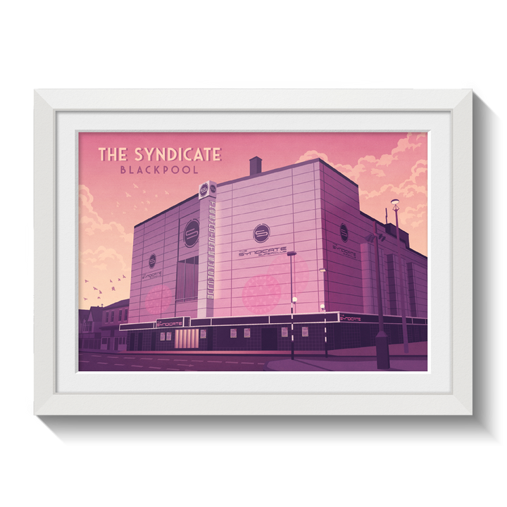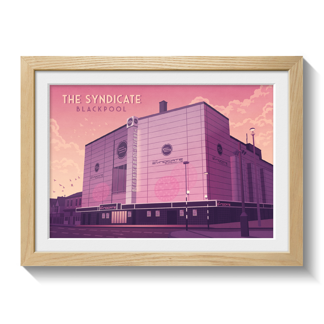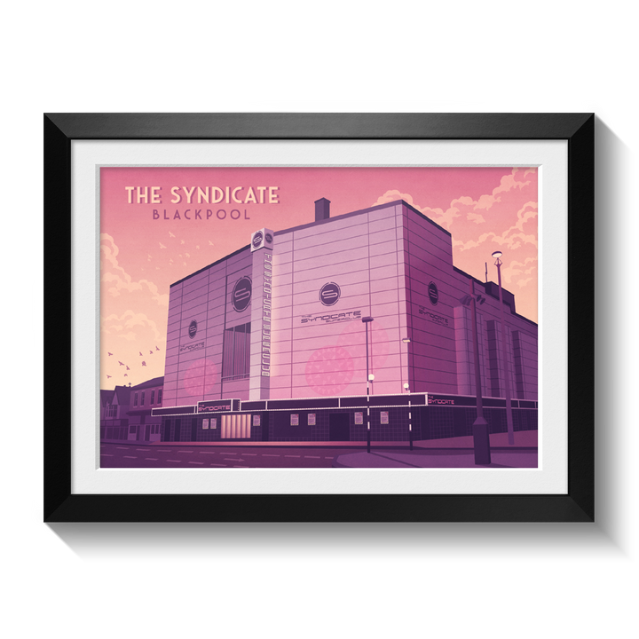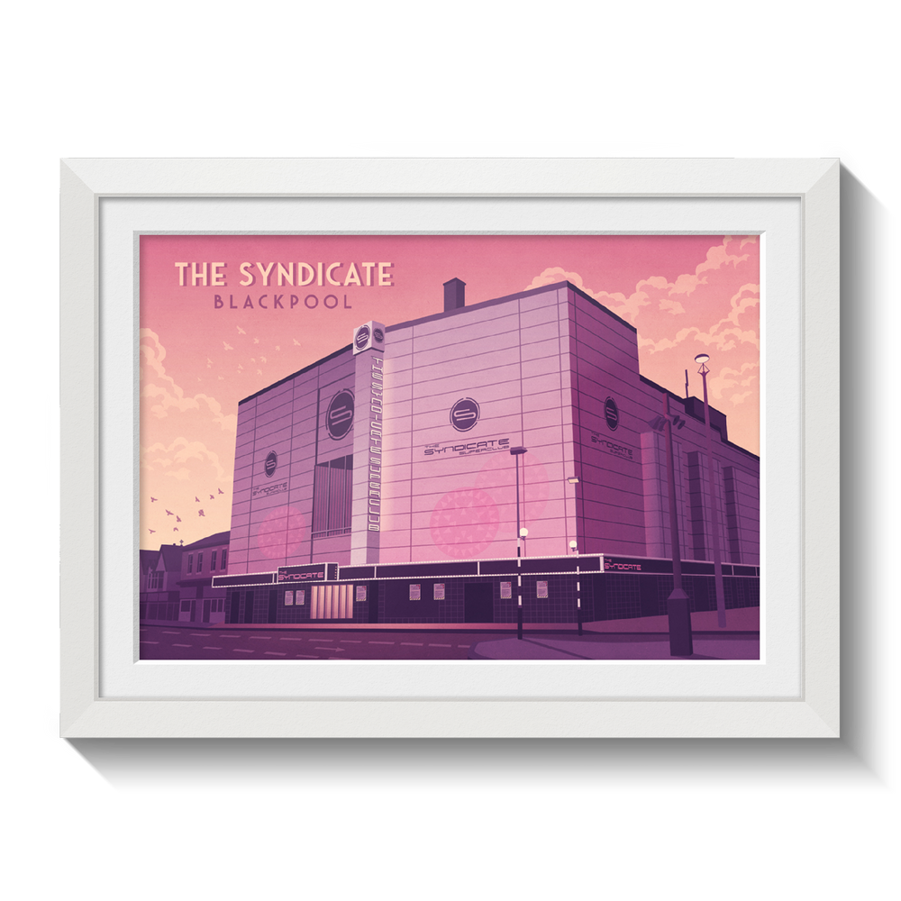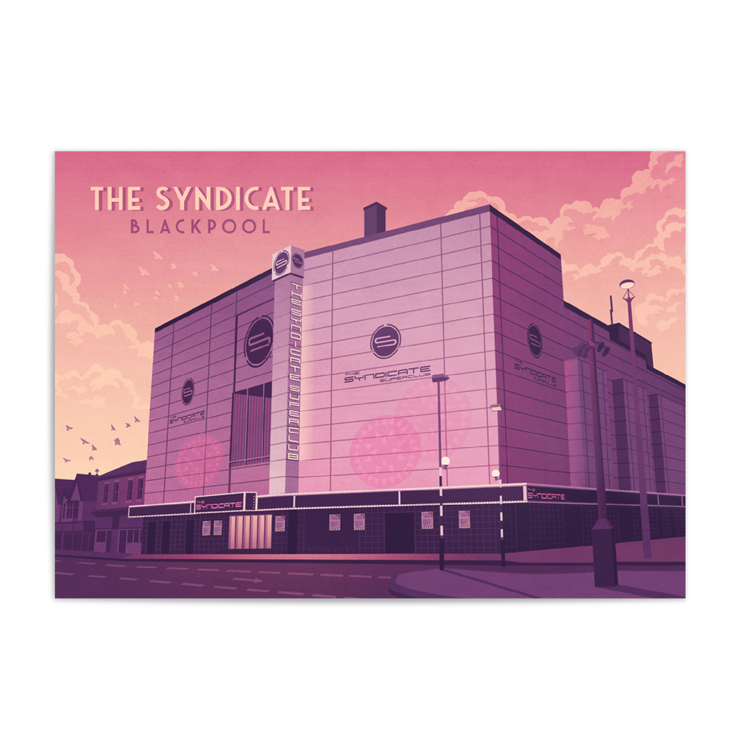 An original travel poster featuring legendary Blackpool superclub, The Syndicate. formally the Empire, Hippodrome and ABC Theatre, it became The Syndicate nightclub in 2002 holding up to 5000 people but later closed due to licensing issues. It was eventually demolished in 2014.
