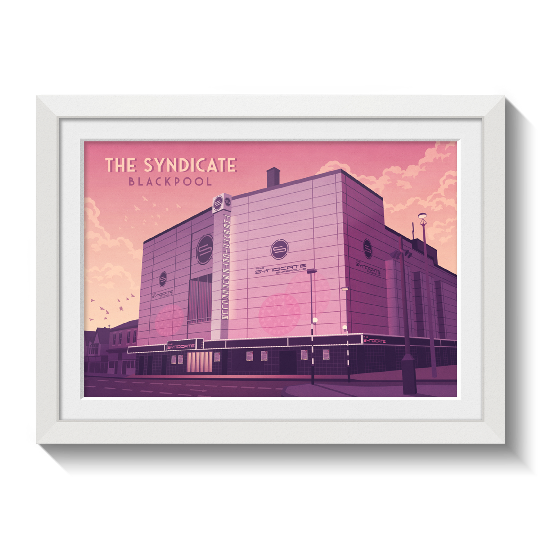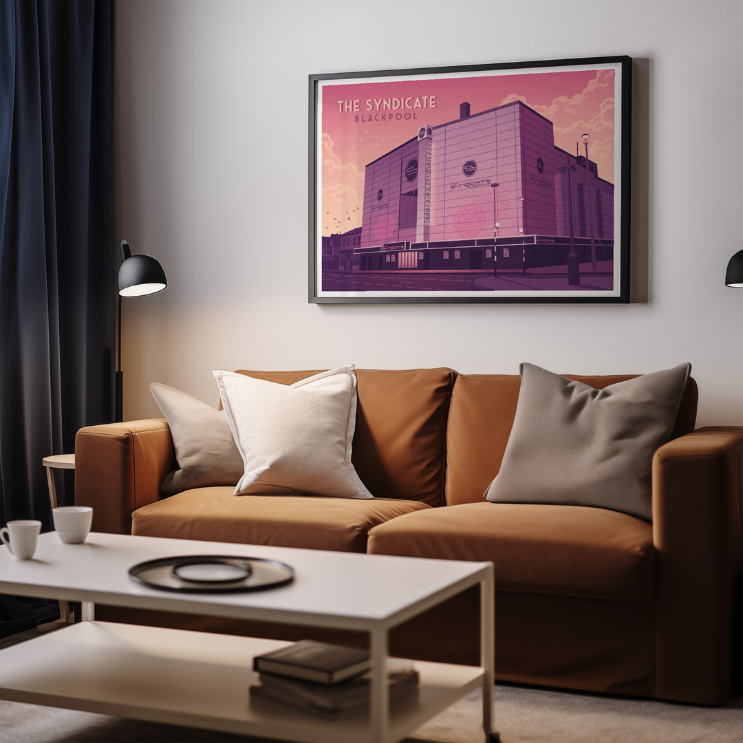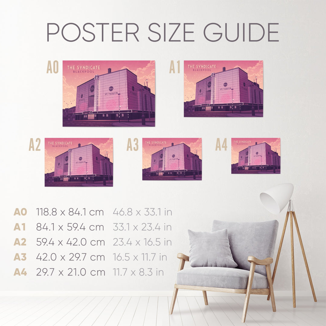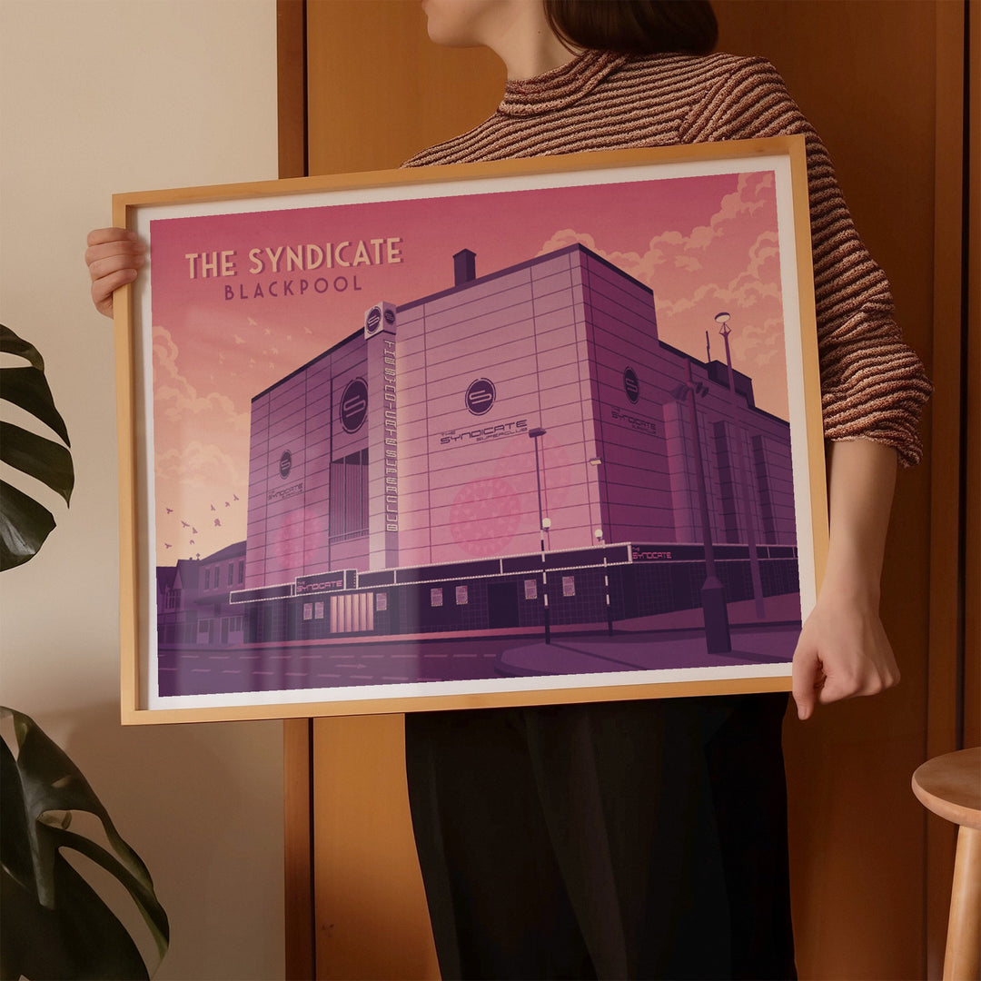 An original travel poster featuring legendary Blackpool superclub, The Syndicate. formally the Empire, Hippodrome and ABC Theatre, it became The Syndicate nightclub in 2002 holding up to 5000 people but later closed due to licensing issues. It was eventually demolished in 2014.