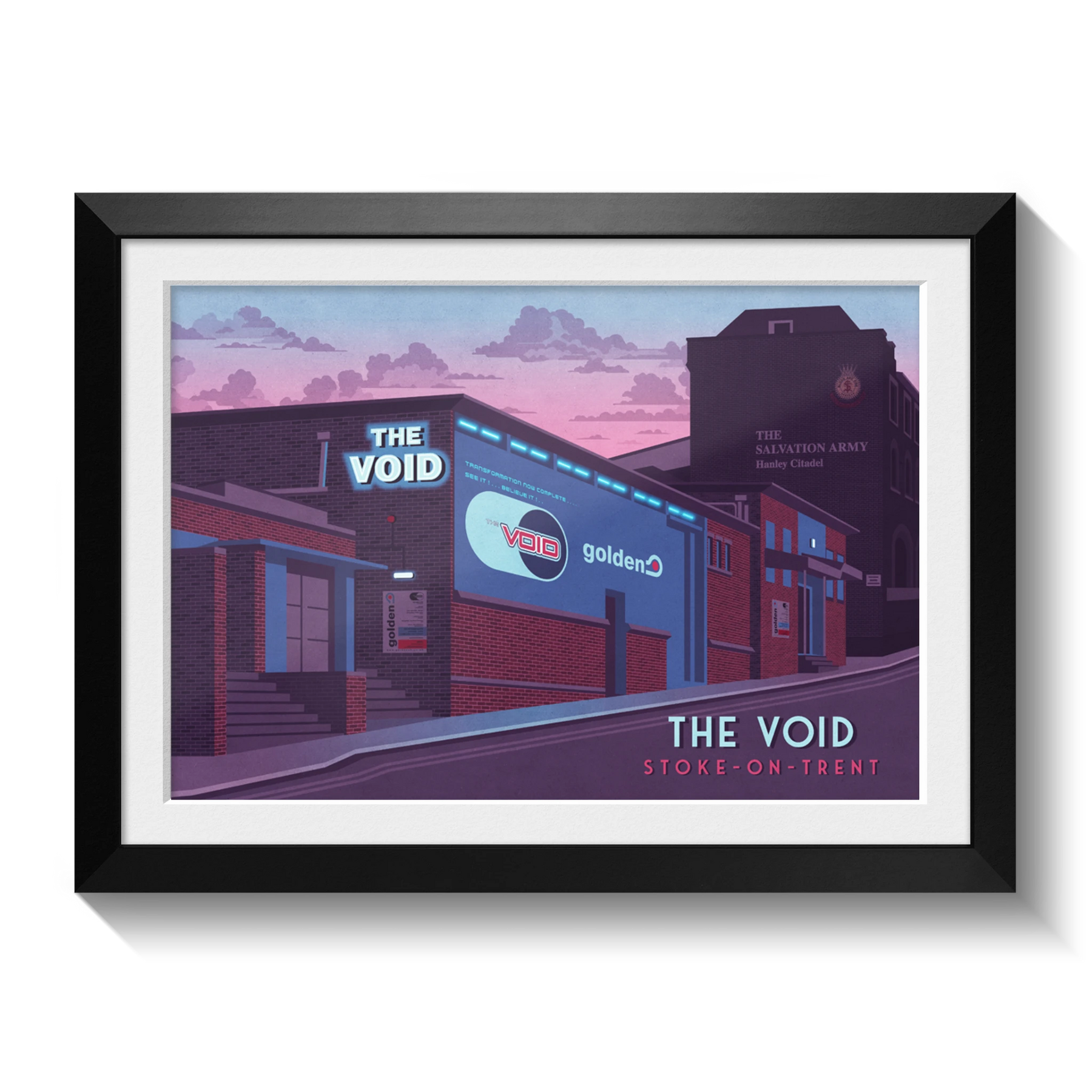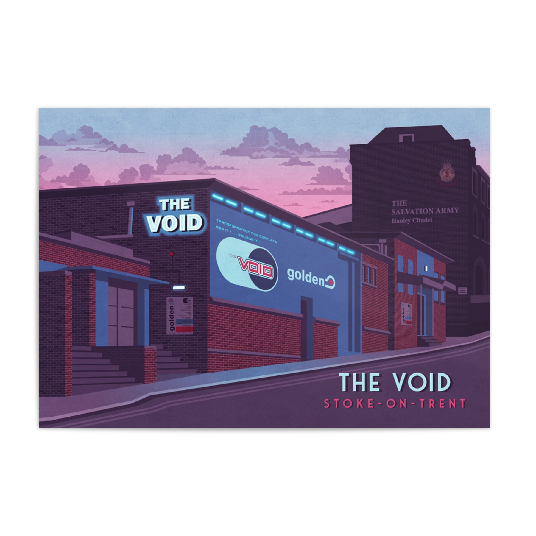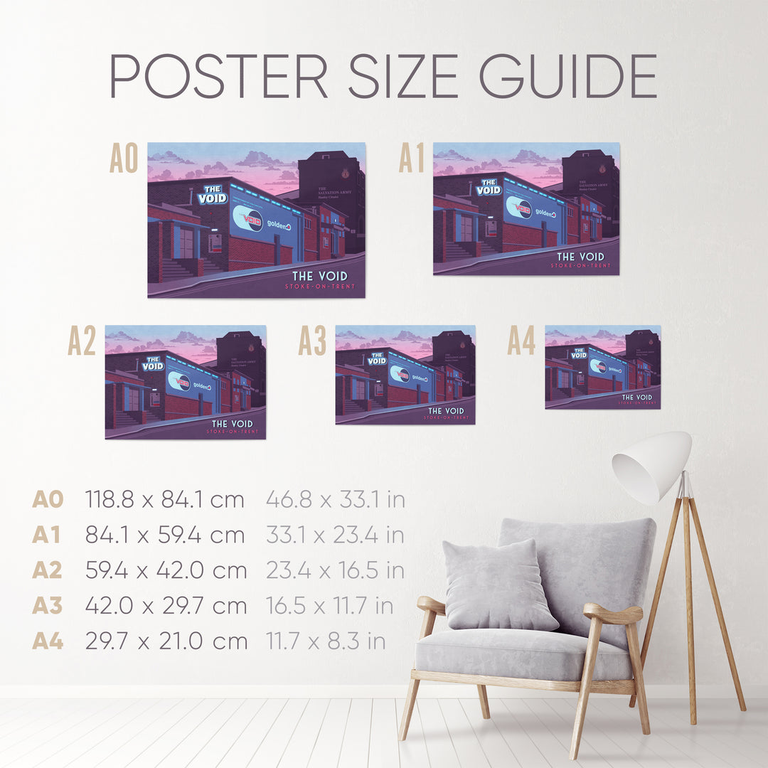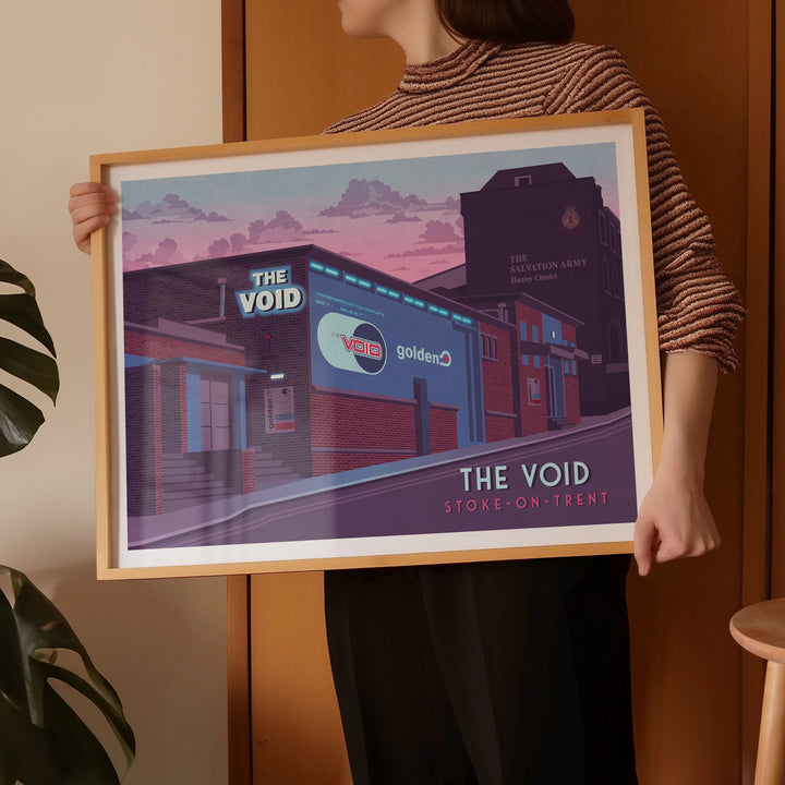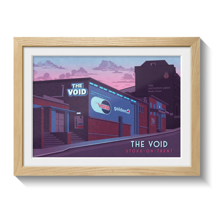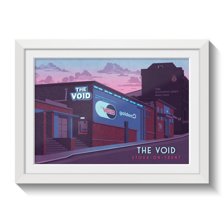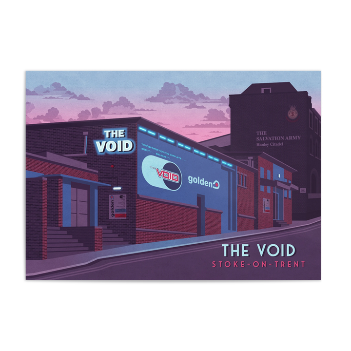 This poster of The Void nightclub in Stoke-on-Trent celebrates the iconic venue that hosted the legendary club night Golden. Perfect for dance music fans and nostalgia lovers, it captures the energy and cultural impact of a 90s nightlife landmark. A stylish tribute to a defining era in UK club history.