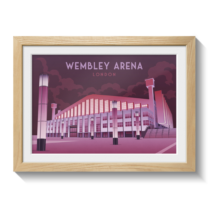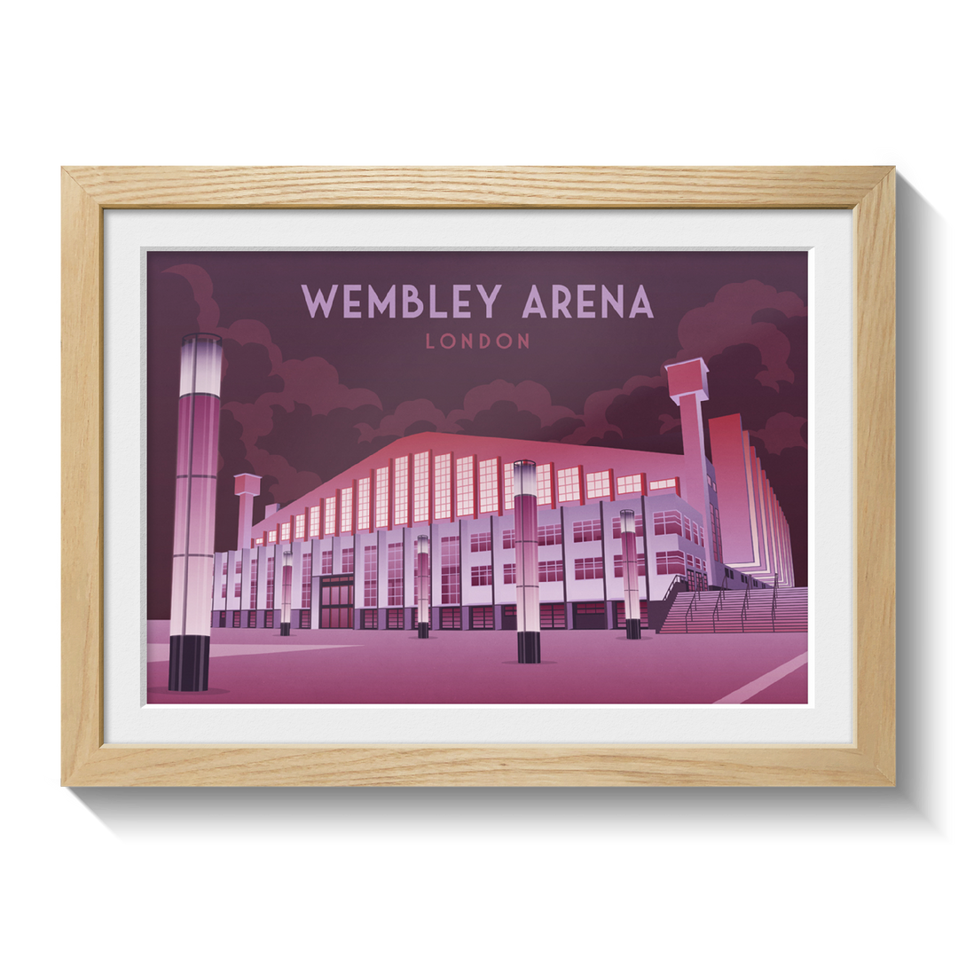 An original travel poster featuring London's second largest indoor arena (after the O2 arena). Currently known as the SSE Arena, Wembley Arena sits adjacent to Wembley Stadium and over the years has played host to the biggest names in music and entertainment.