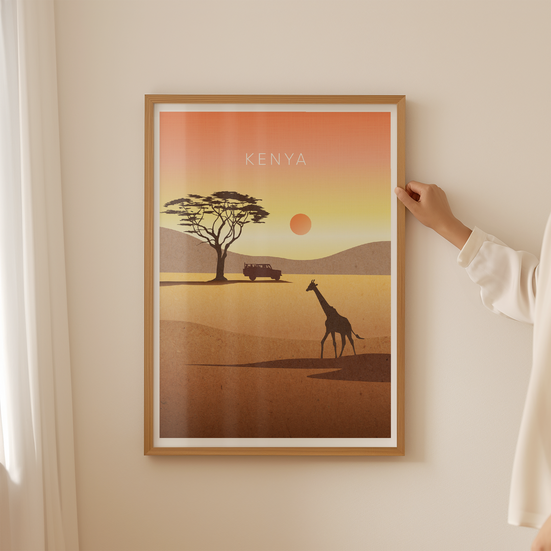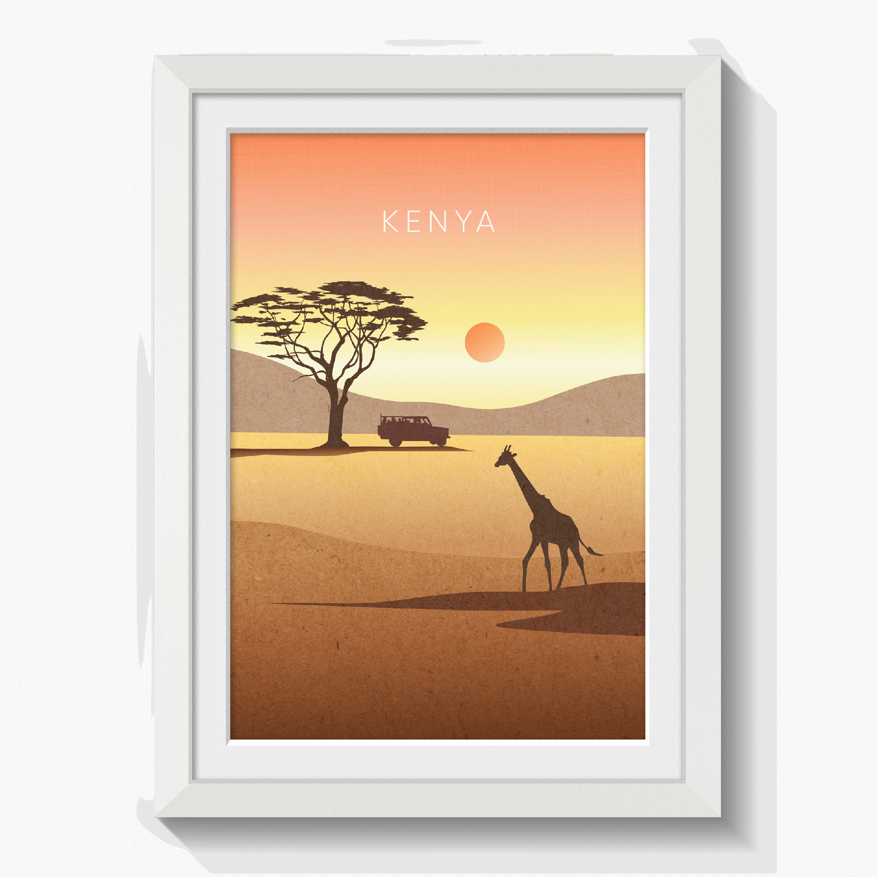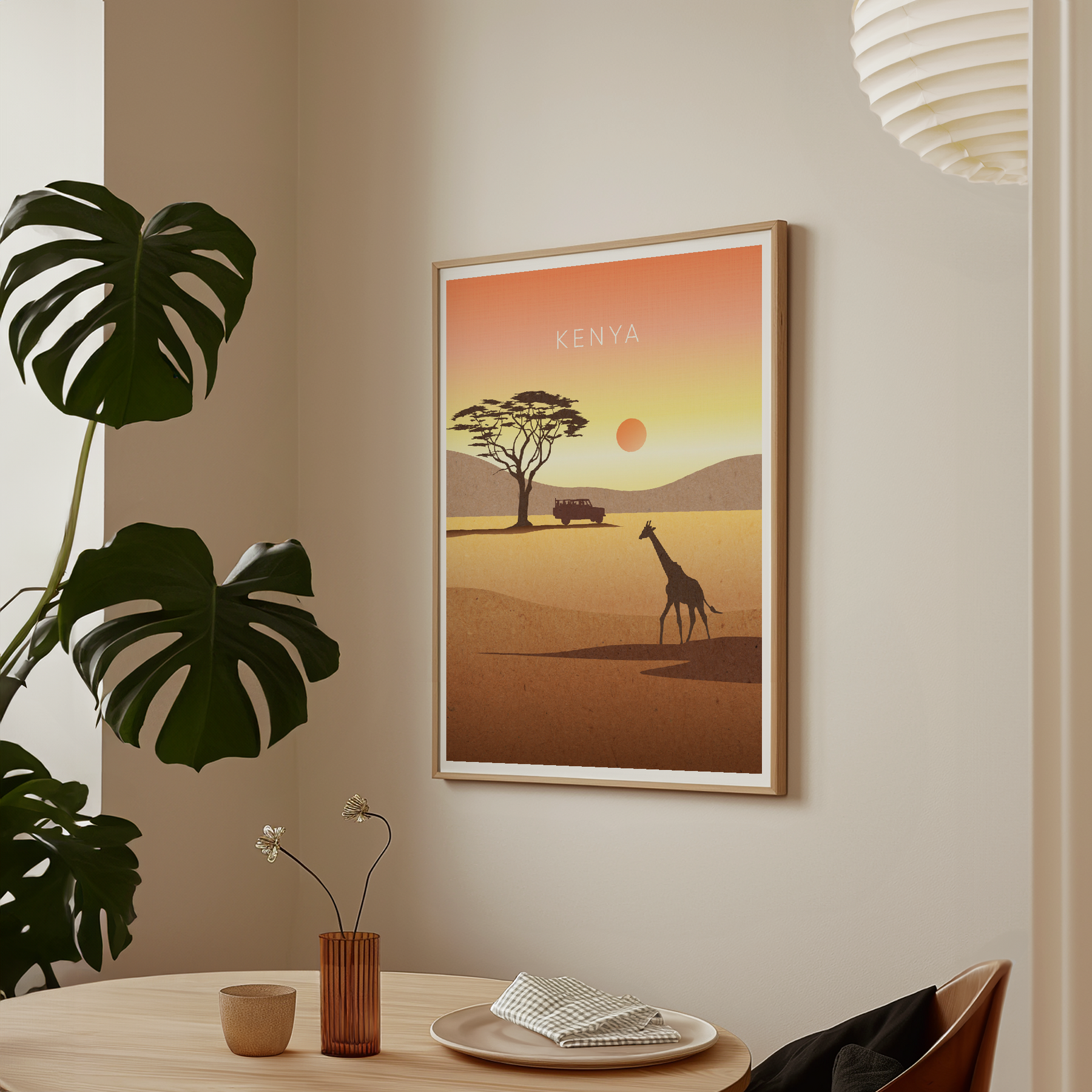 Original minimalist travel poster for Kenya. Showcasing the country’s stunning landscapes and rich wildlife, Kenya is a top destination for safari adventures and cultural exploration. From the savannah to the coast, it offers unforgettable experiences for nature lovers and travellers seeking adventure.