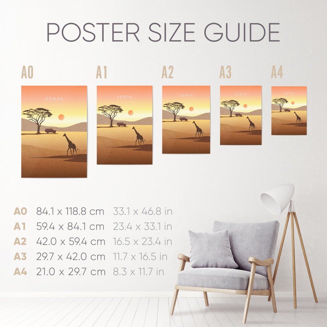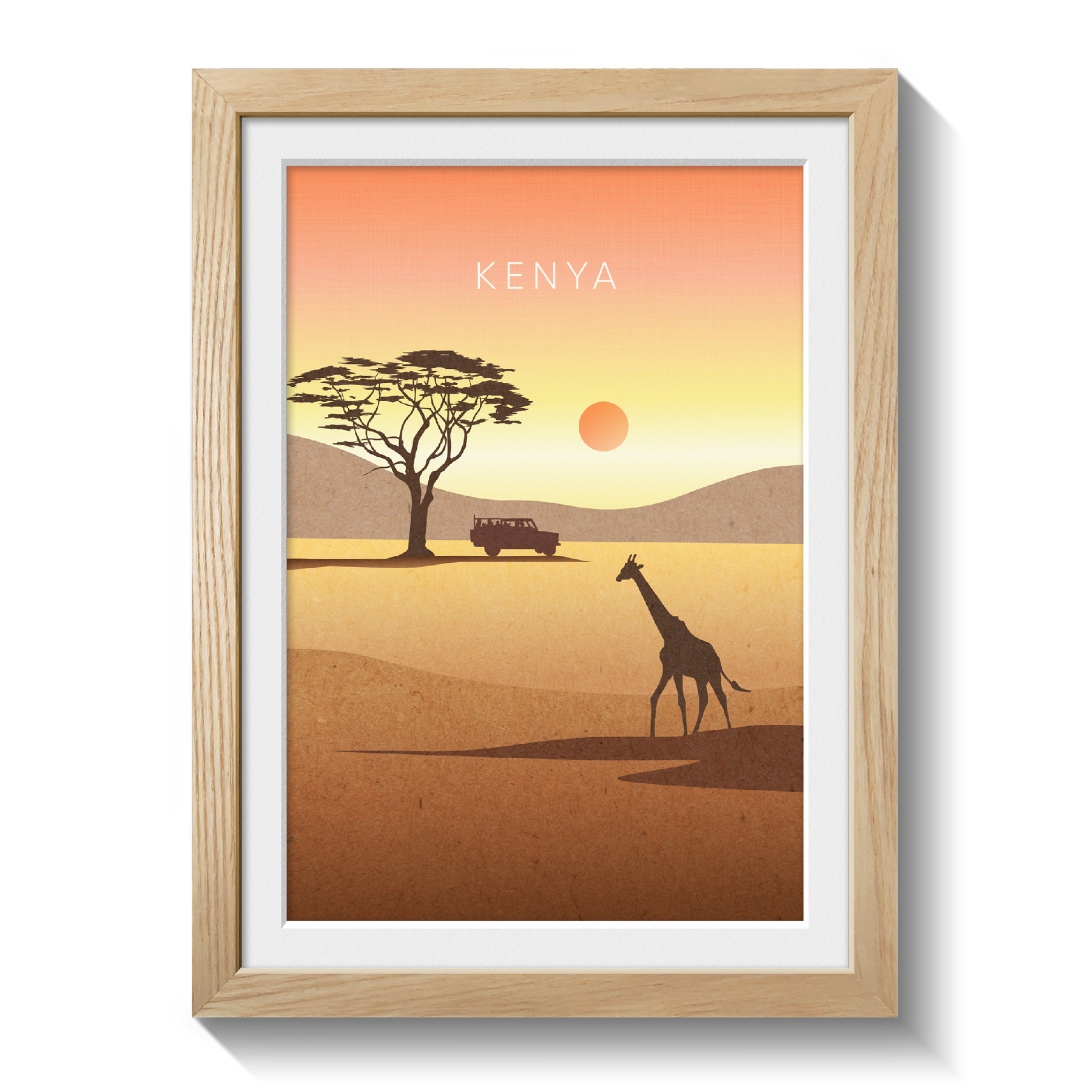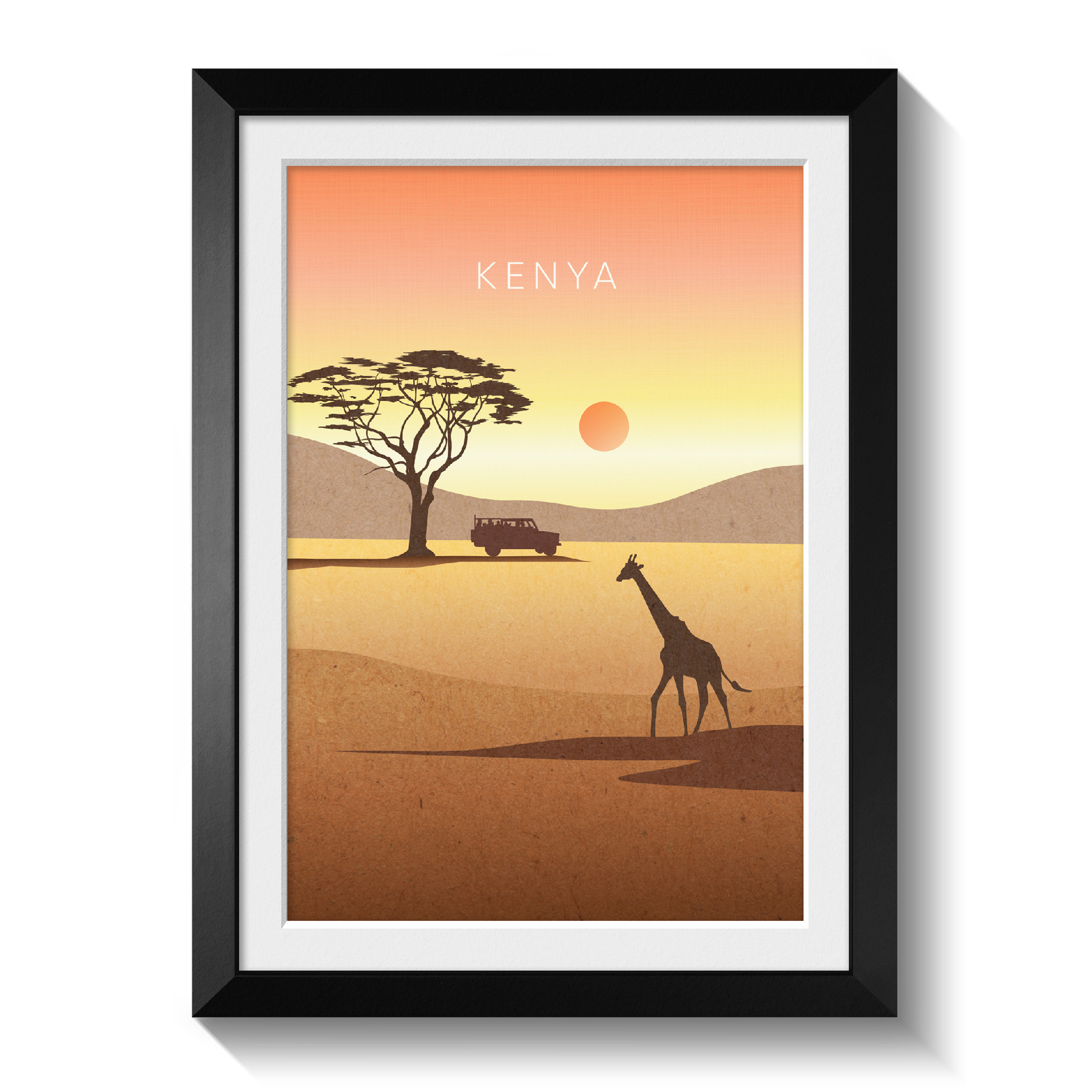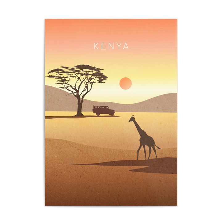 Original minimalist travel poster for Kenya. Showcasing the country’s stunning landscapes and rich wildlife, Kenya is a top destination for safari adventures and cultural exploration. From the savannah to the coast, it offers unforgettable experiences for nature lovers and travellers seeking adventure.