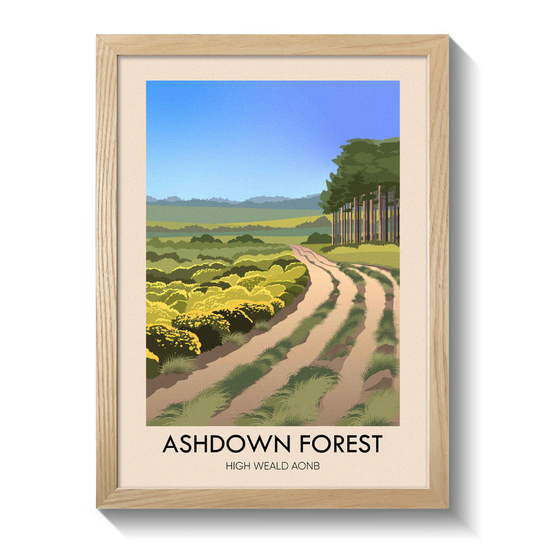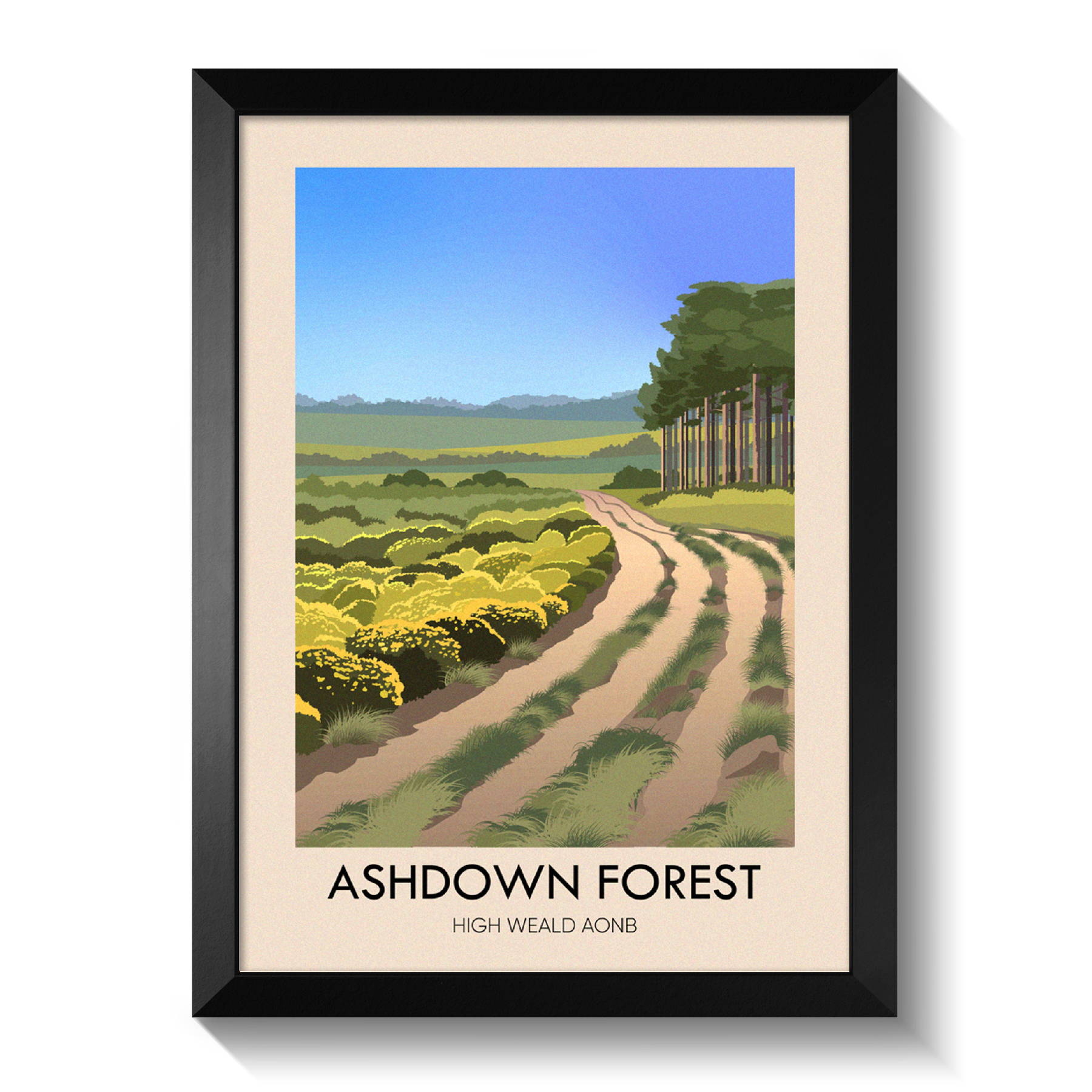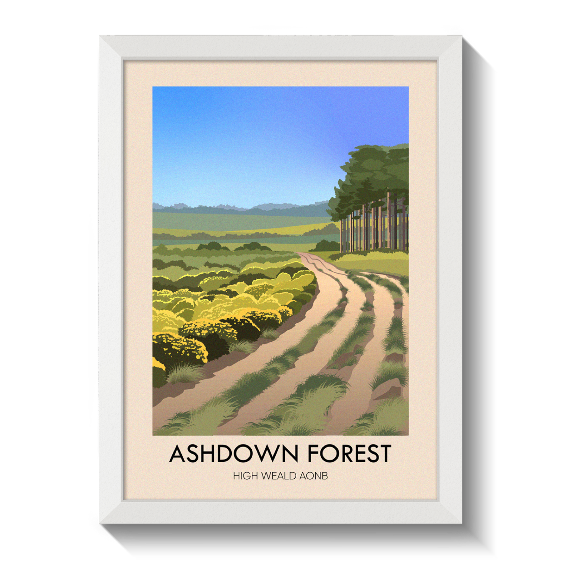 An original travel poster featuring the Ashdown Forest in Sussex, the famous setting of A. A. Milne's Hundred Acre Wood, as featured in the Winnie the Pooh books. Ashdown Forest is situated in the High Weald Area of Outstanding Natural Beauty.