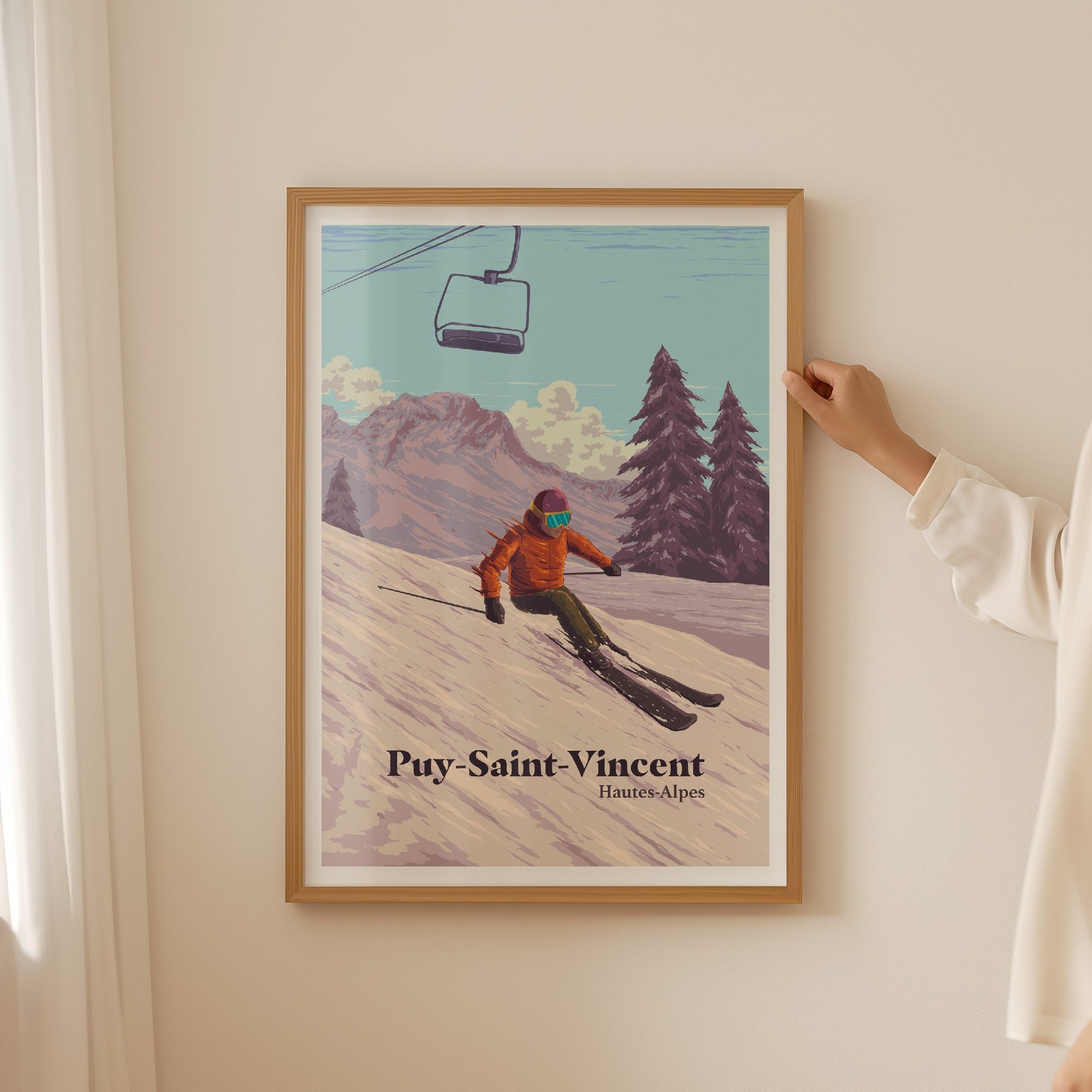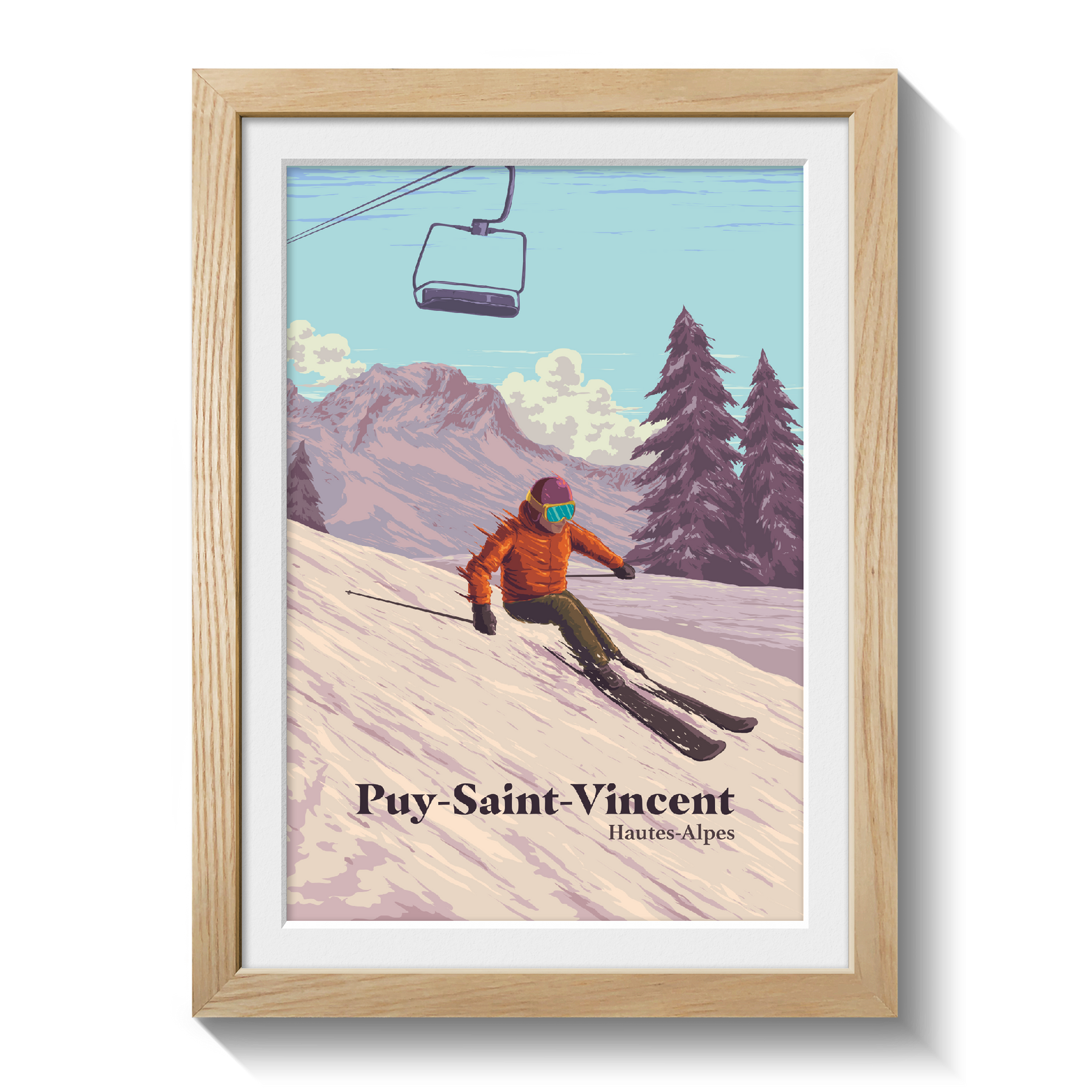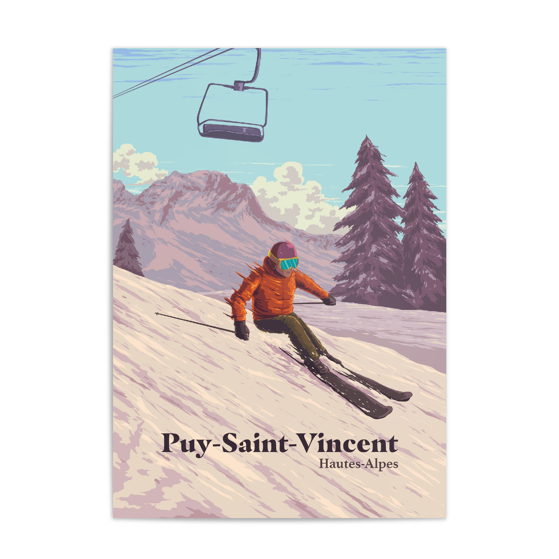 This is an original travel poster features the ski resort of Puy St Vincent which sits at 1600m of altitude, at the edge of Les Ecrins National Park.