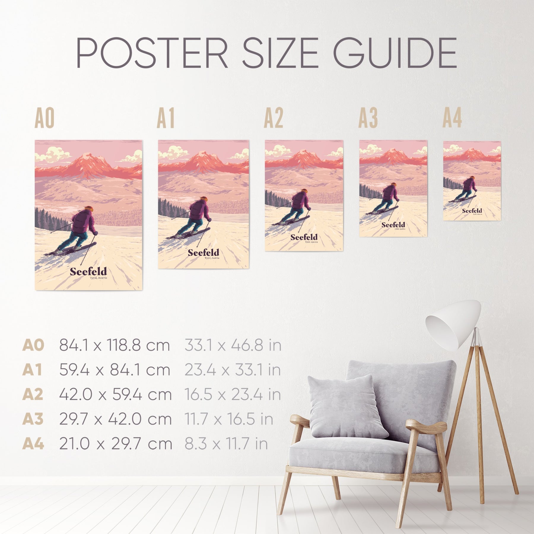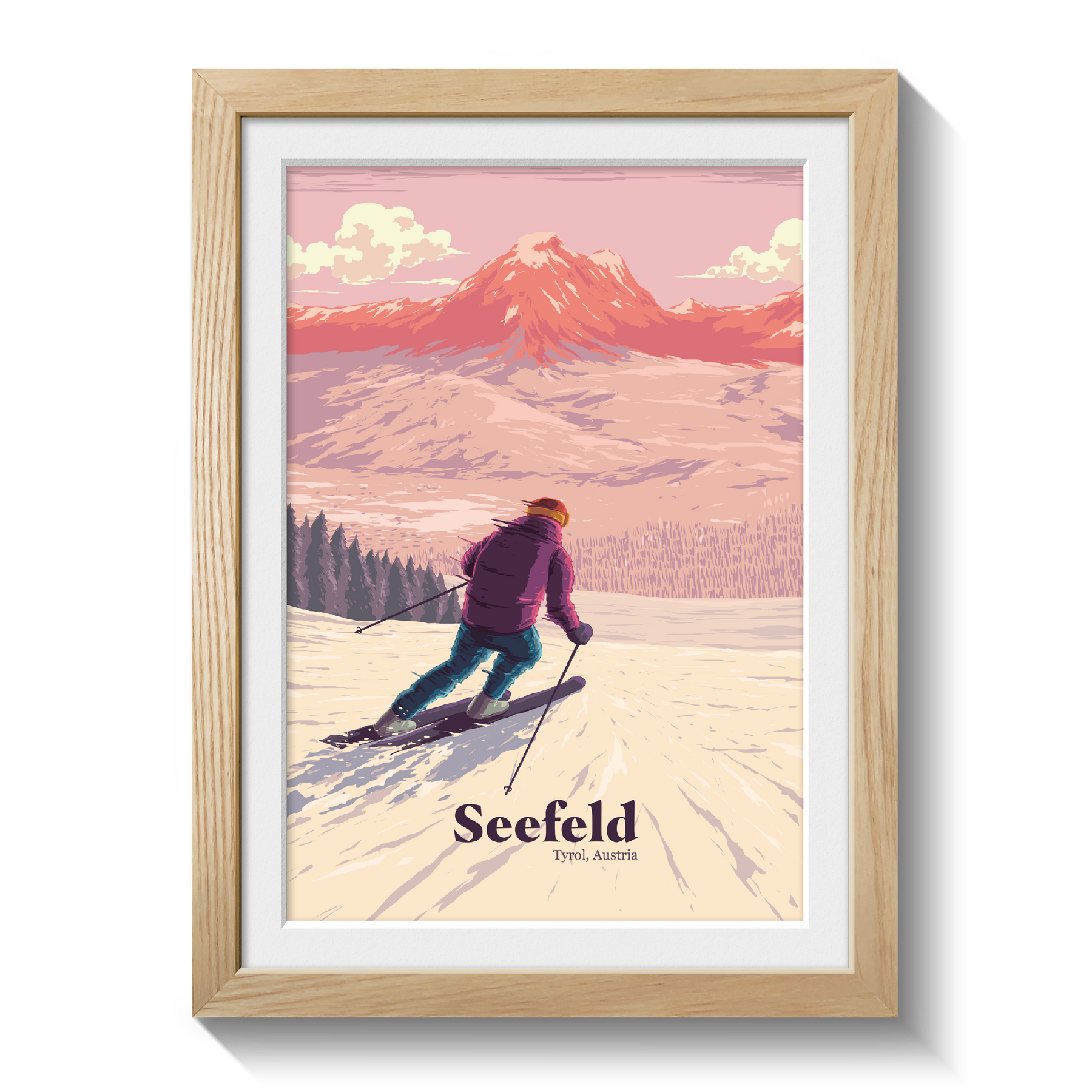 This is an original travel poster featuring the Austrian ski resort of Seefeld, located just outside of Innsbruck. Seefeld is made up of two smaller ski areas Gschwandtkopf and the larger Rosshütte.
