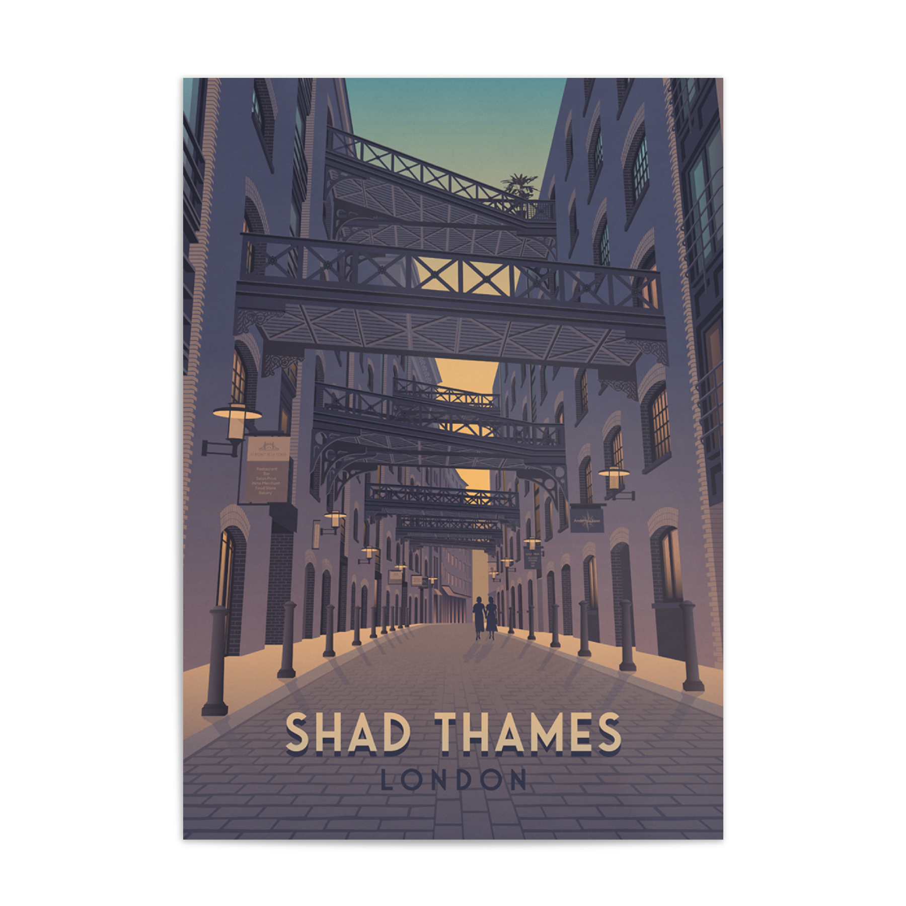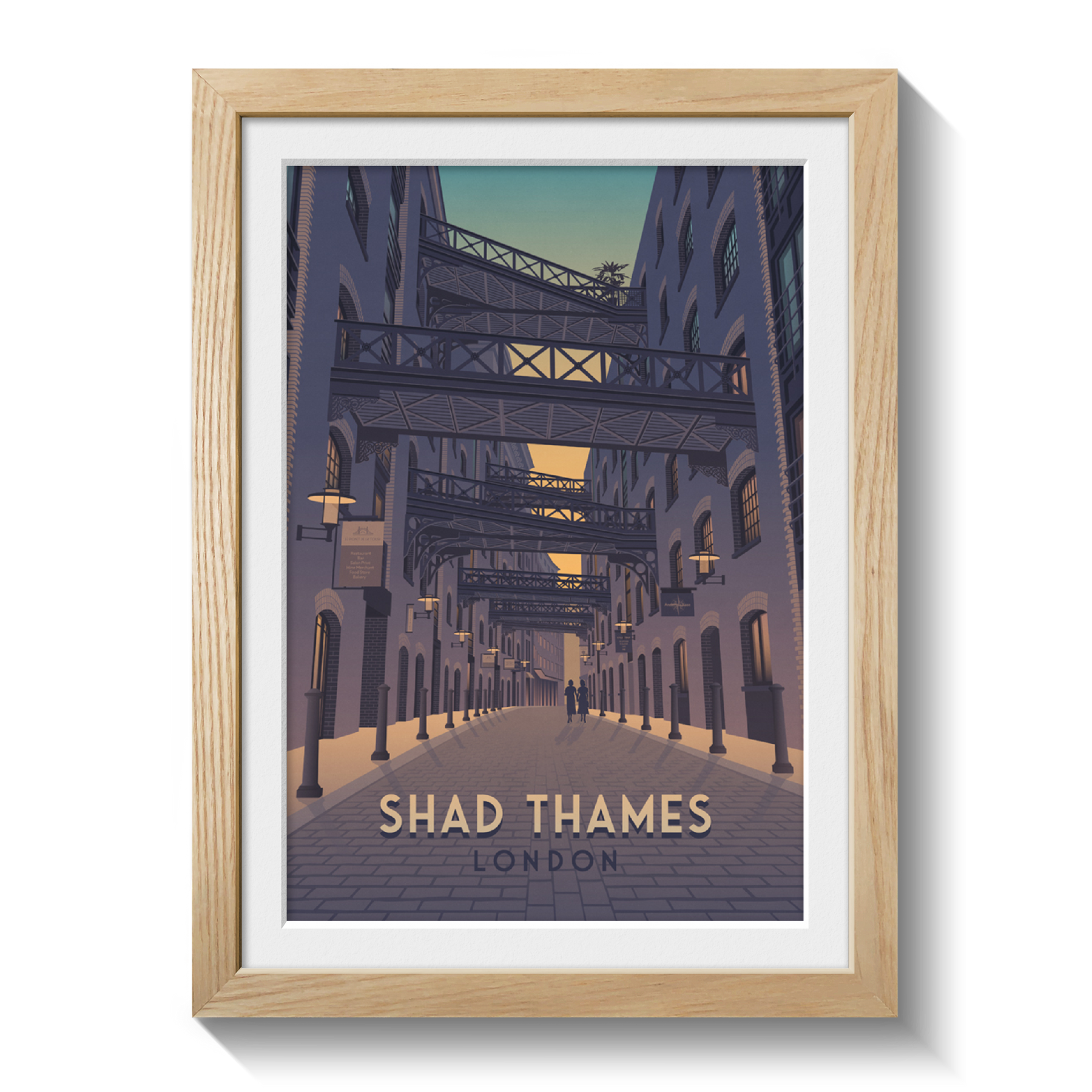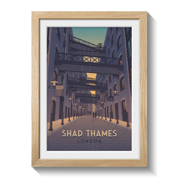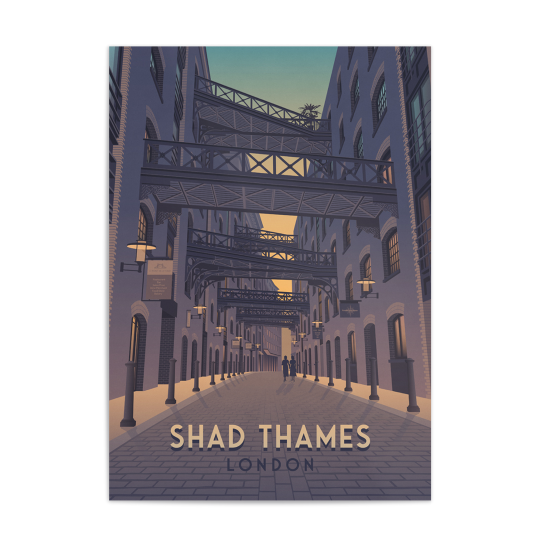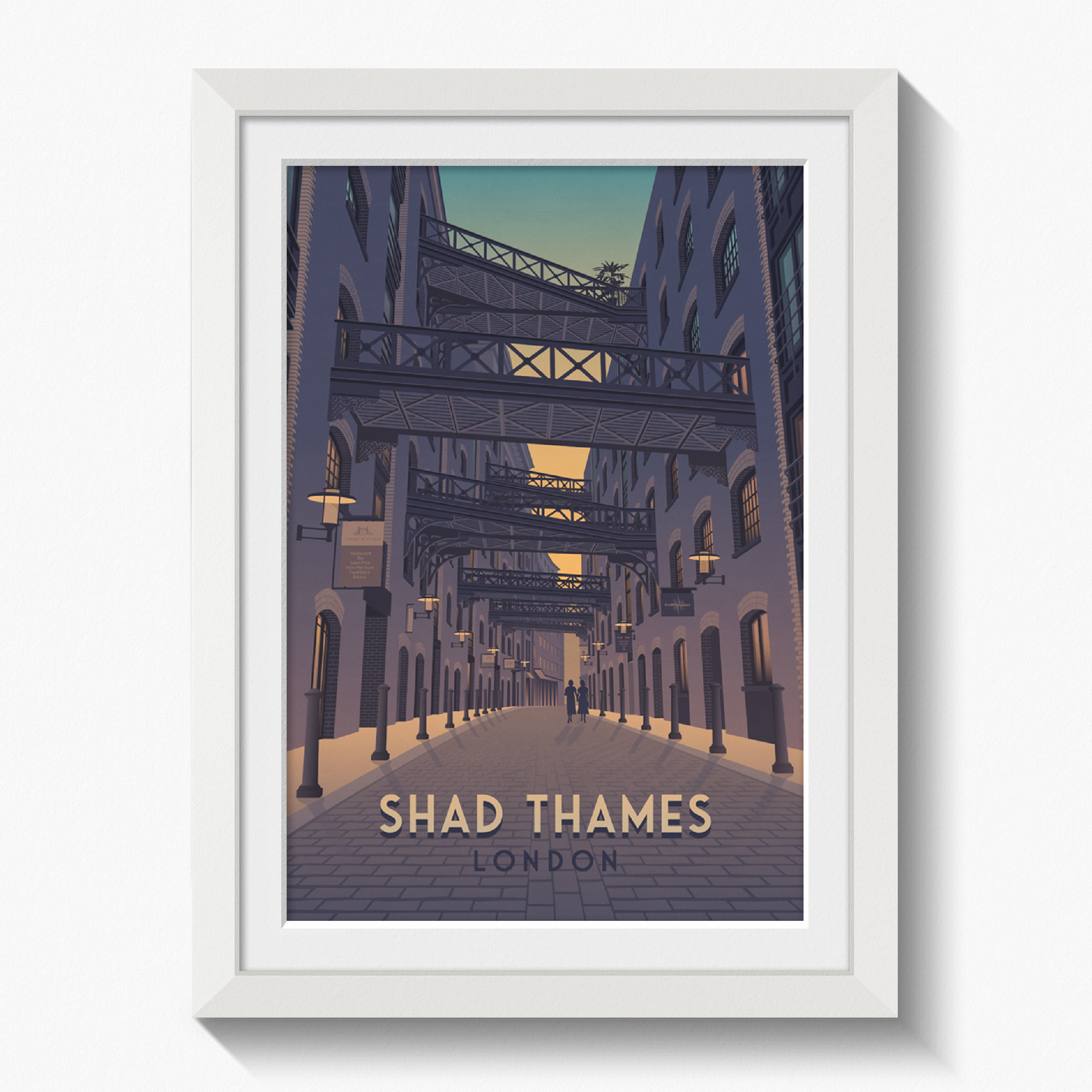 An original travel poster featuring the unmistakable 'Shad Thames' in Bermondsey, London, close to Tower Bridge on the River Thames. This Victorian Warehouse district was once the largest warehouse complex in London.