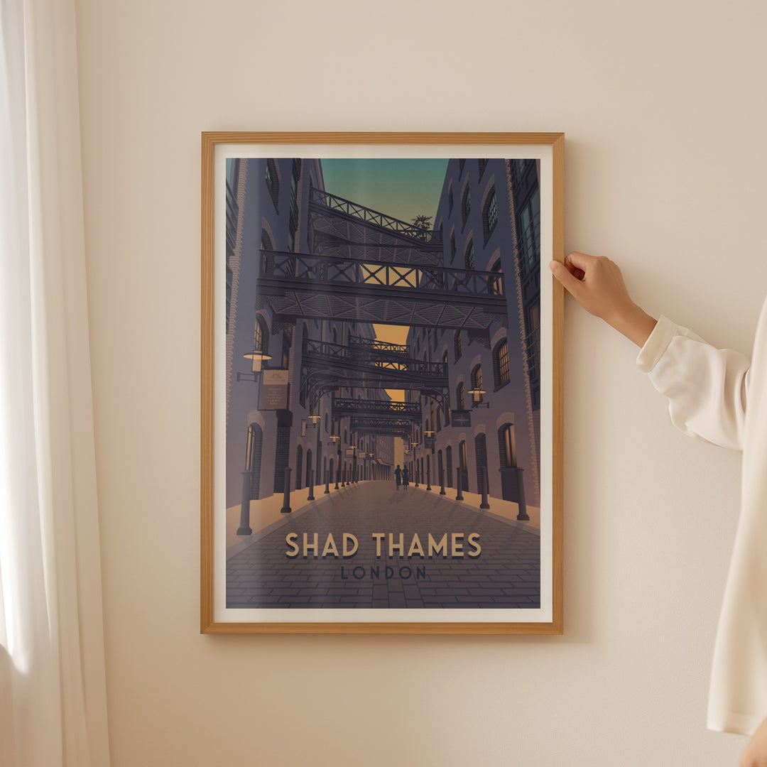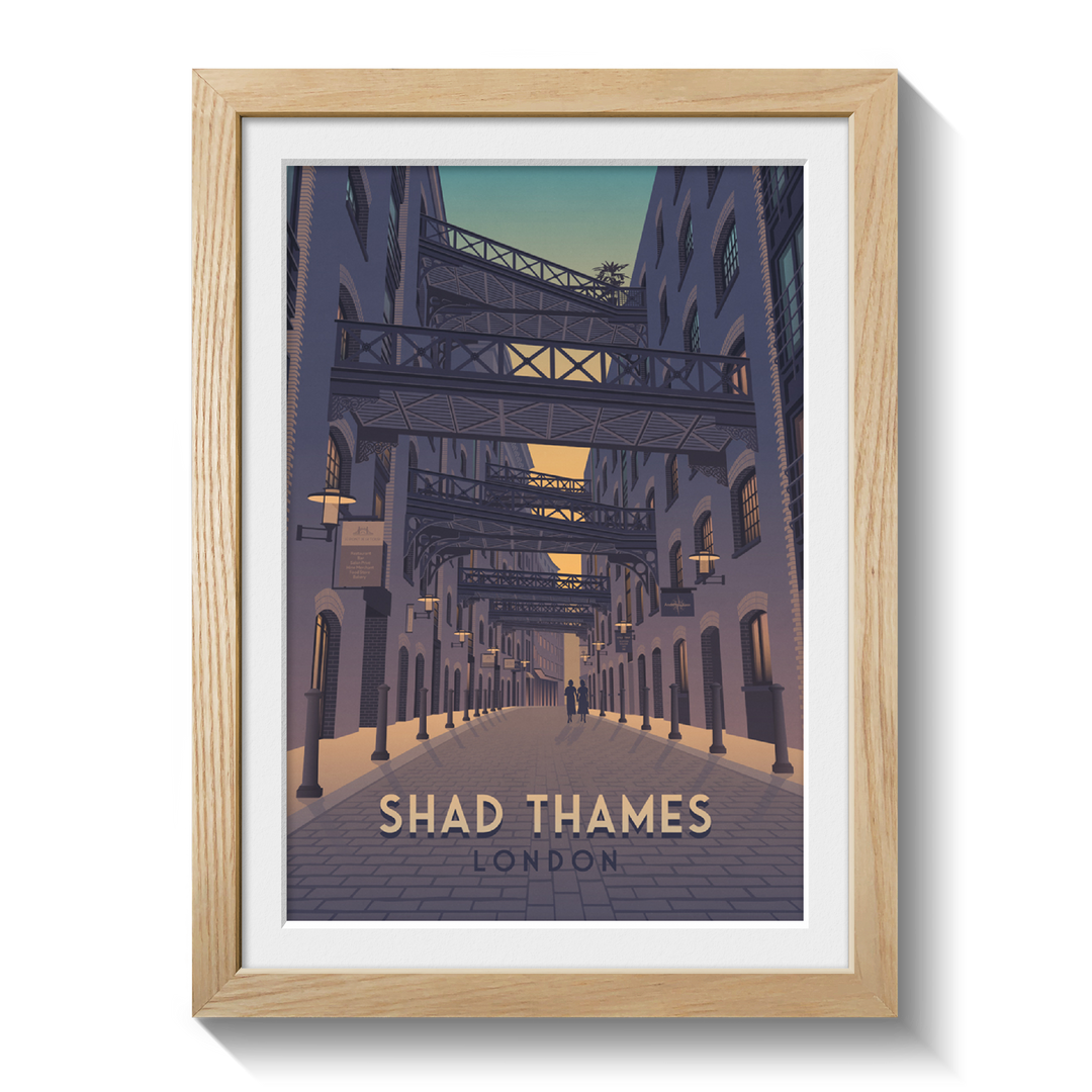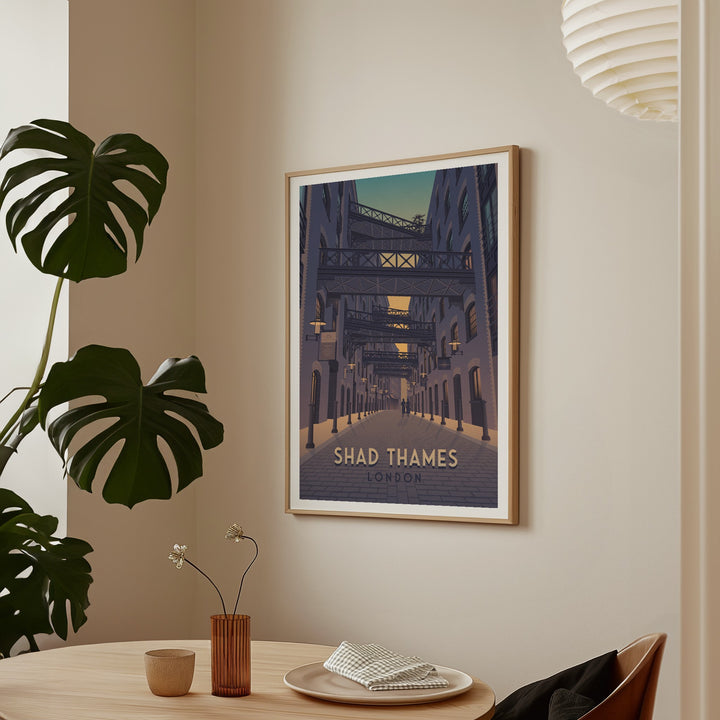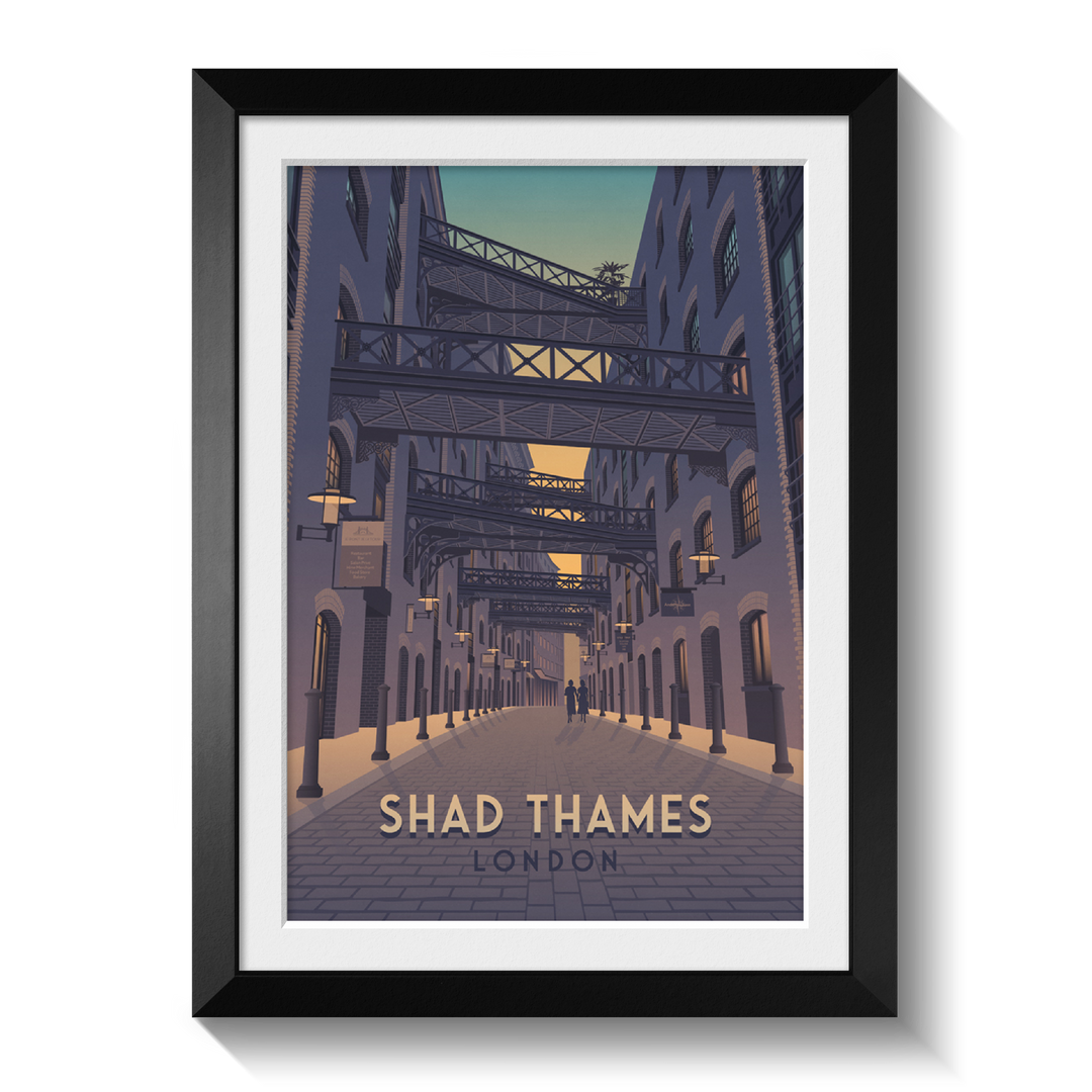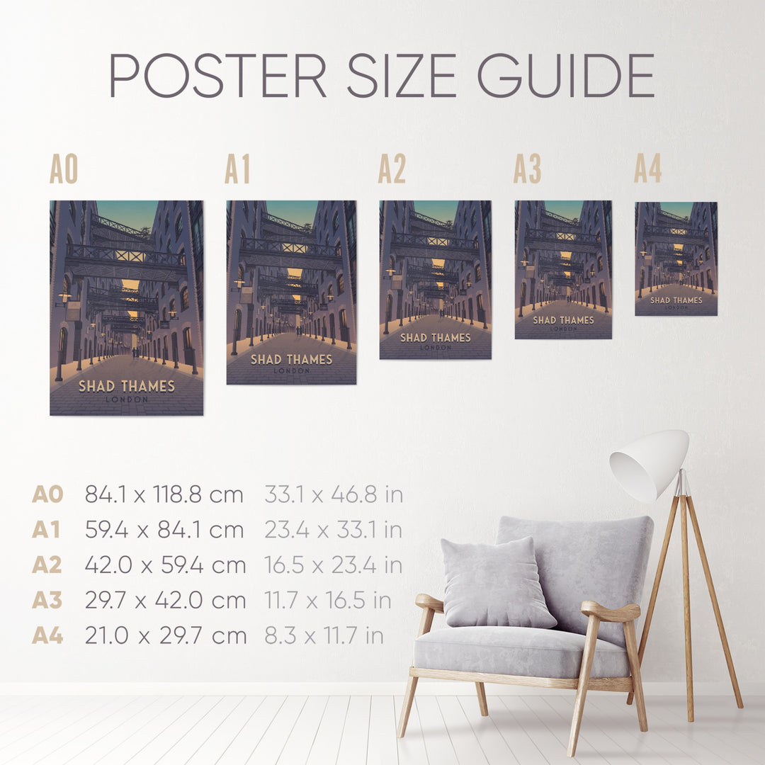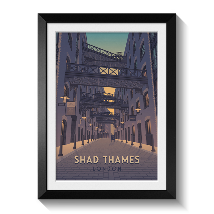 An original travel poster featuring the unmistakable 'Shad Thames' in Bermondsey, London, close to Tower Bridge on the River Thames. This Victorian Warehouse district was once the largest warehouse complex in London.