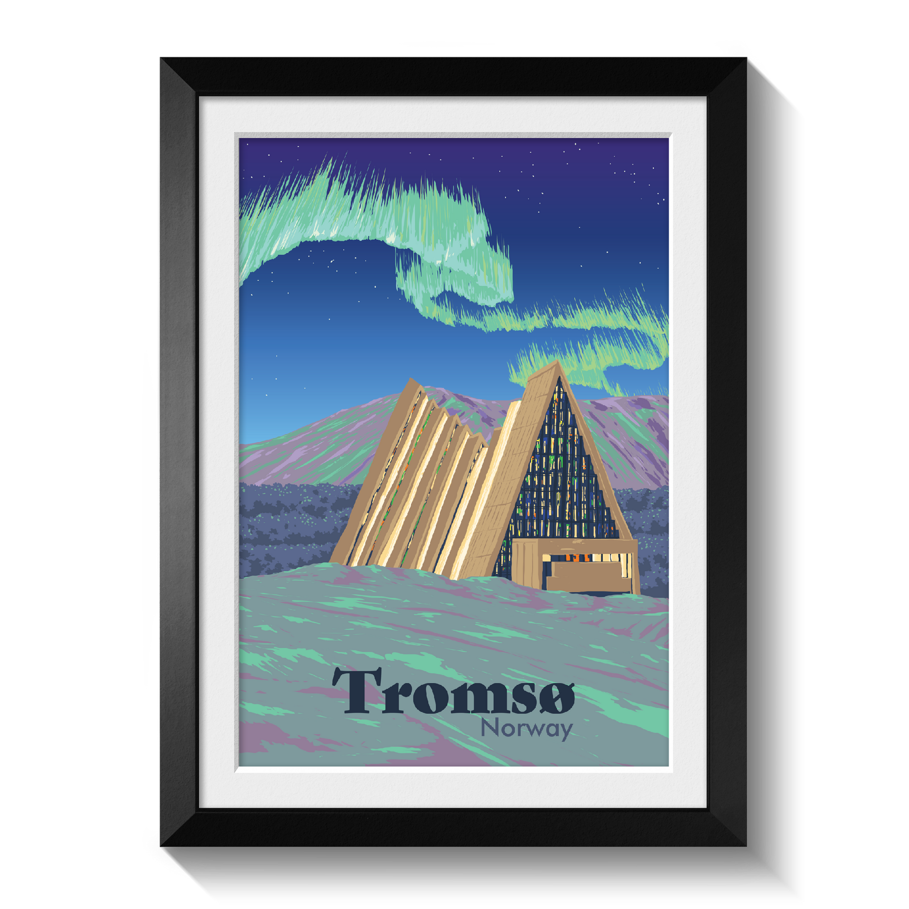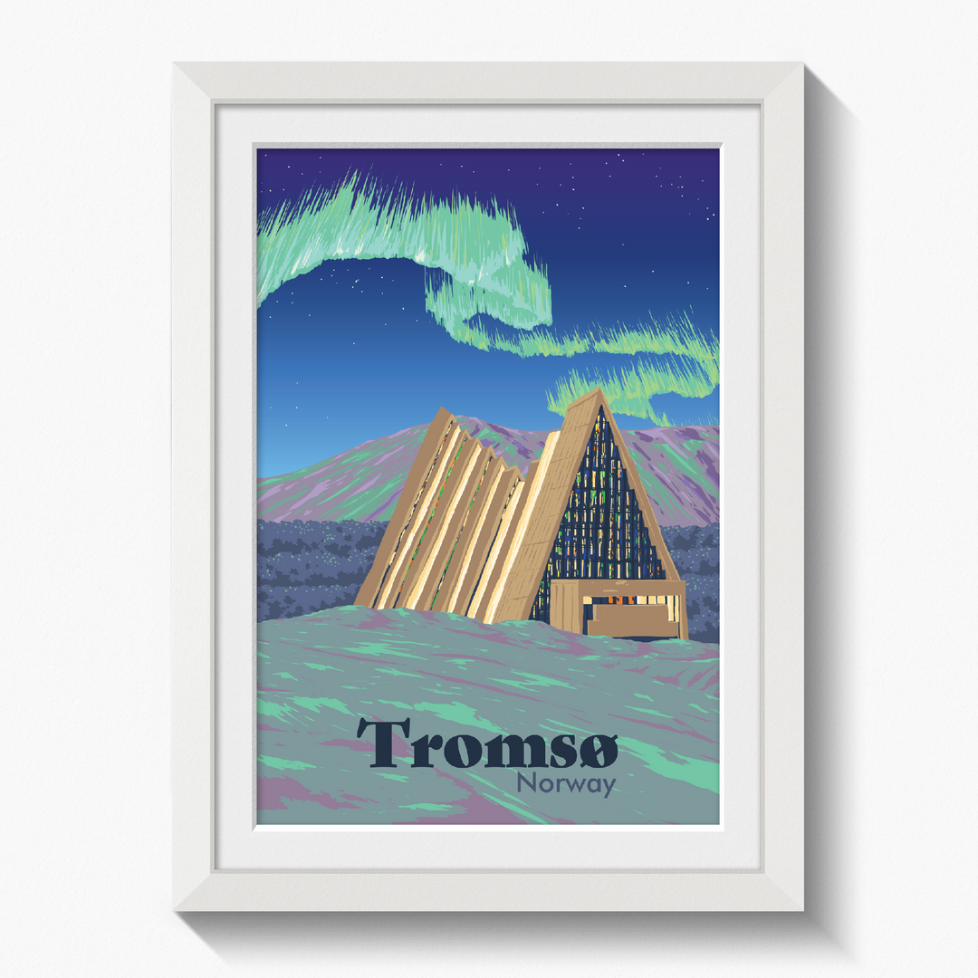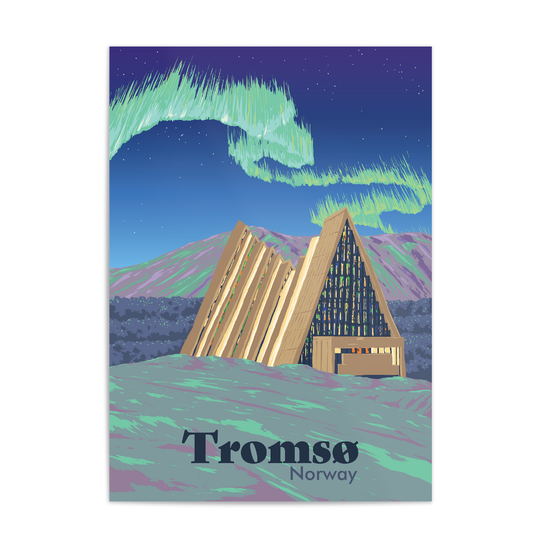 This travel poster features the famous Arctic Cathedral in Norway's Tromso, 217 miles North of the Arctic Circle. The Northern Lights, aka the Aurora Borealis can be seen dancing overhead.