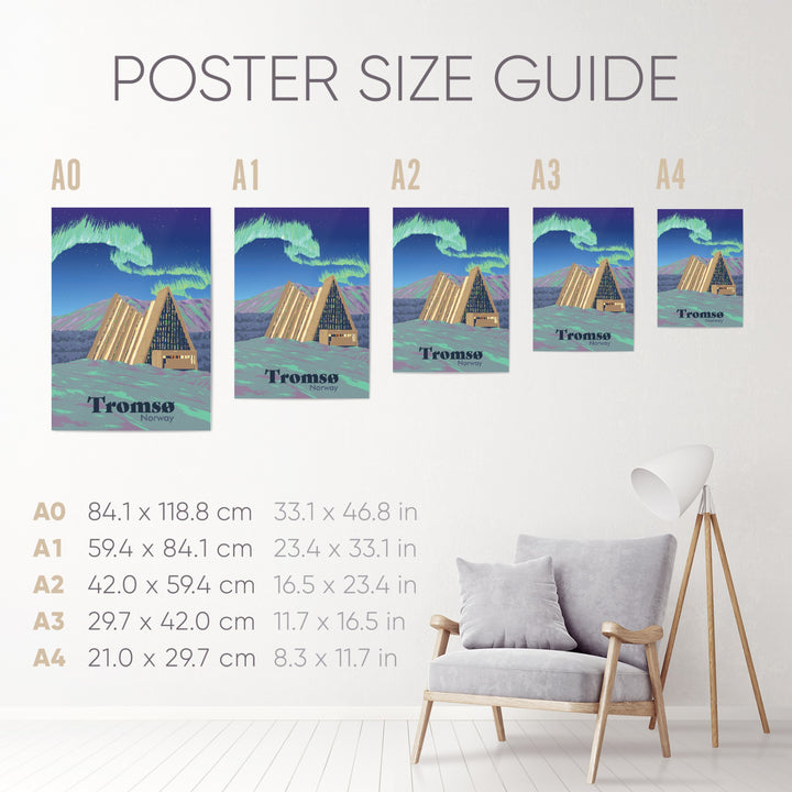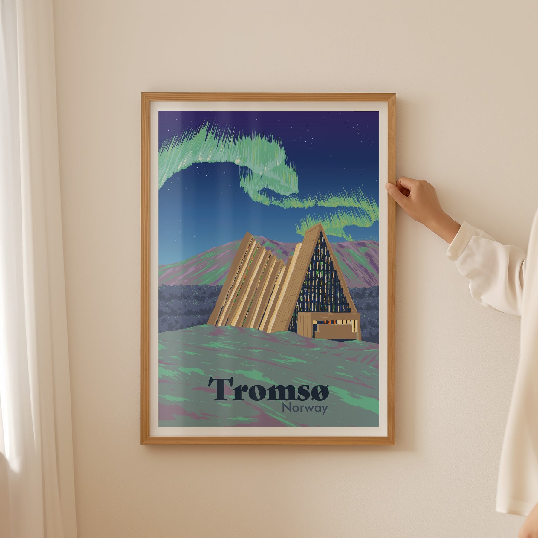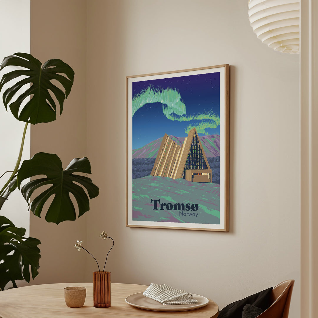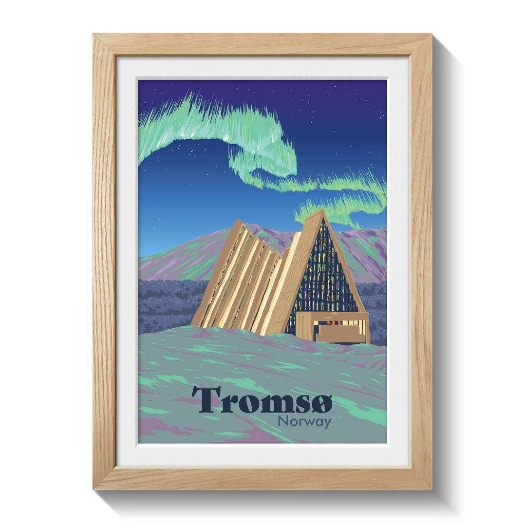 This travel poster features the famous Arctic Cathedral in Norway's Tromso, 217 miles North of the Arctic Circle. The Northern Lights, aka the Aurora Borealis can be seen dancing overhead.