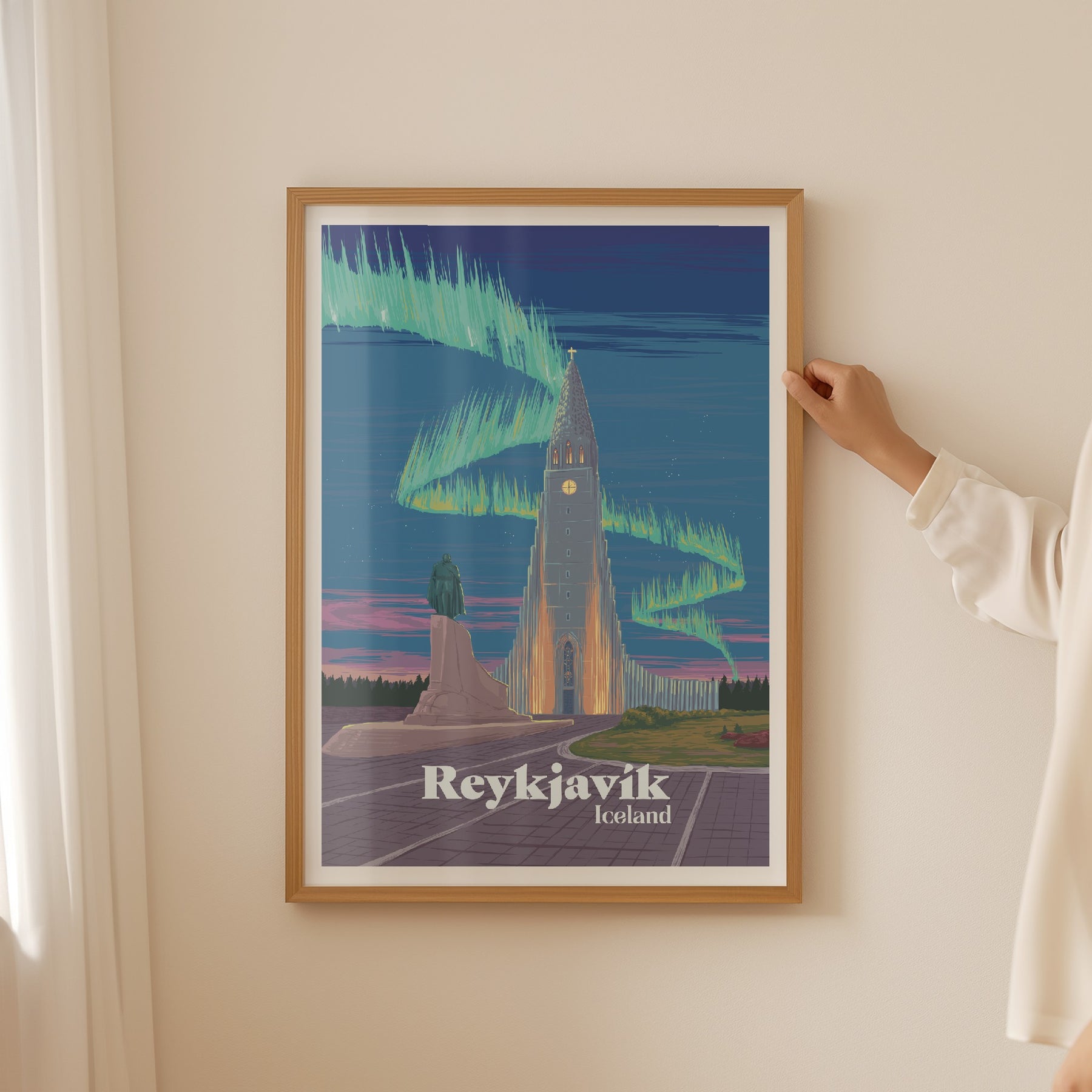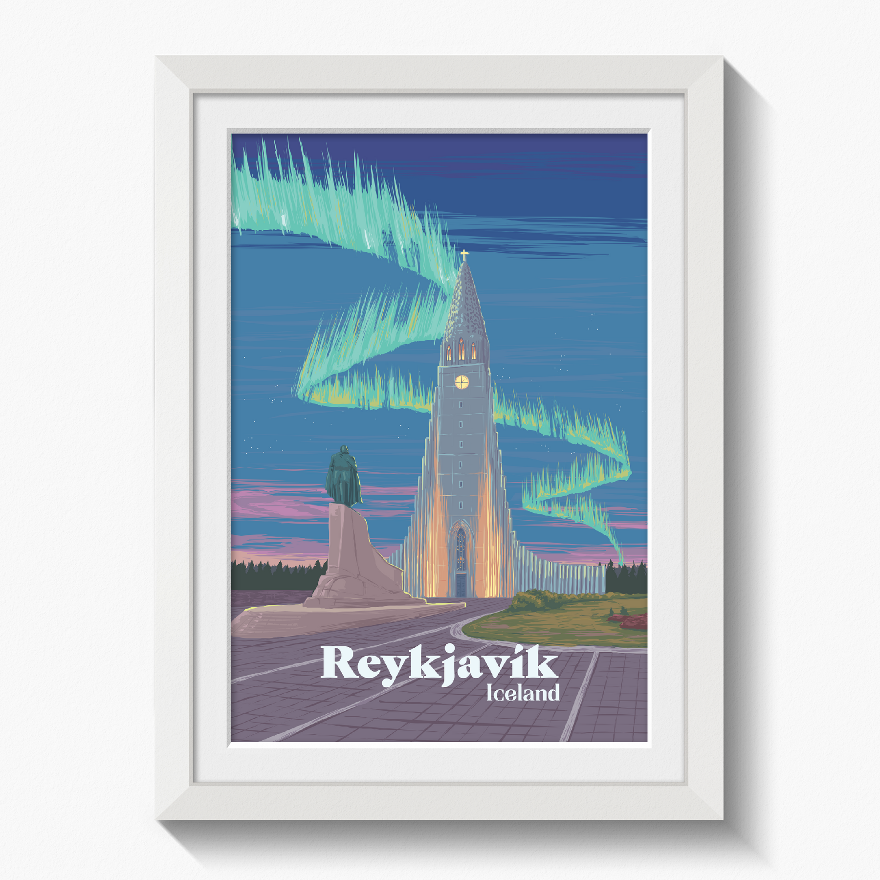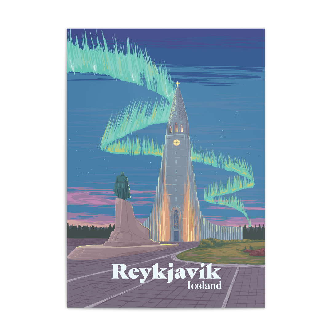 An original travel poster featuring Reykjavik's famous Hallgrímskirkja Church, designed to look like a volcano.