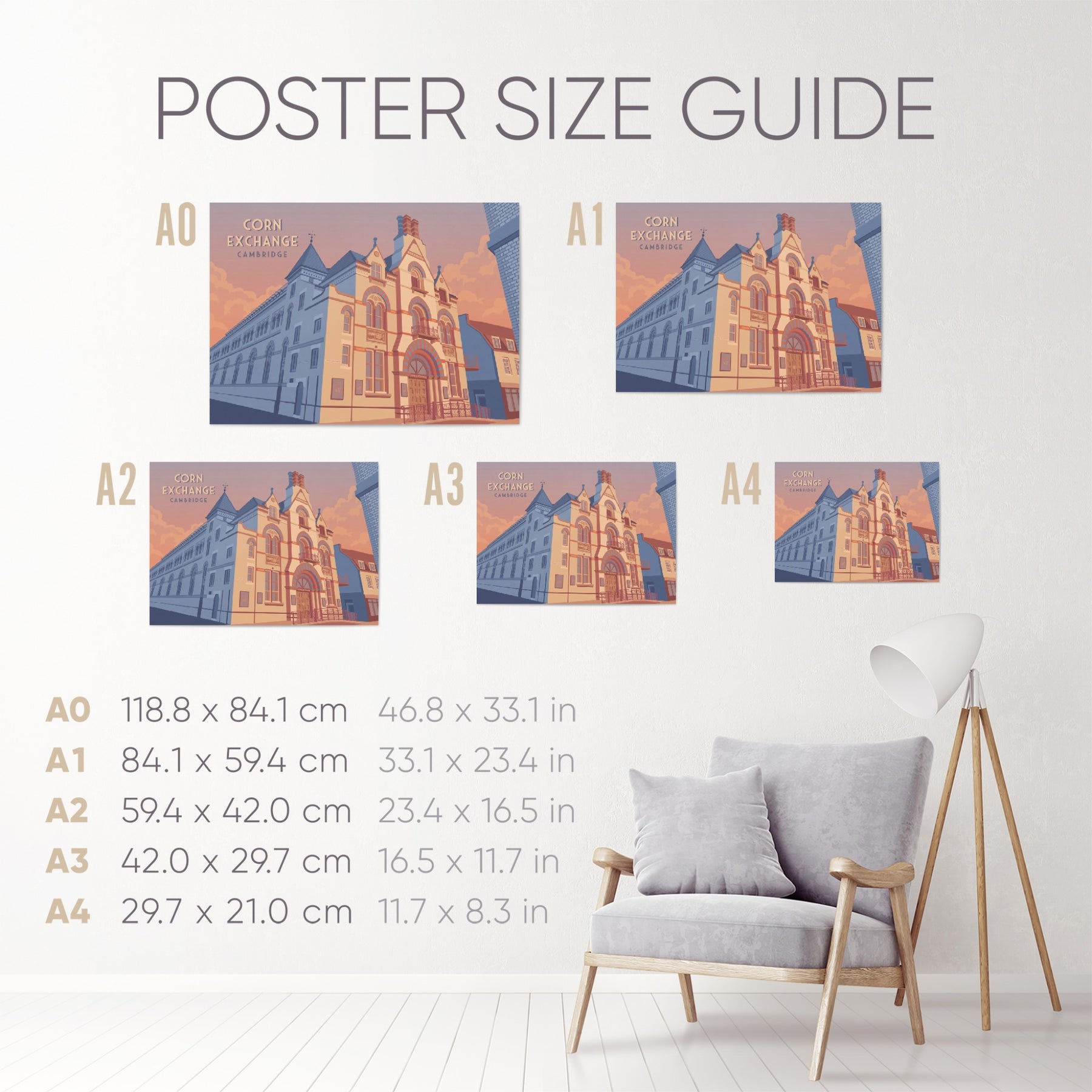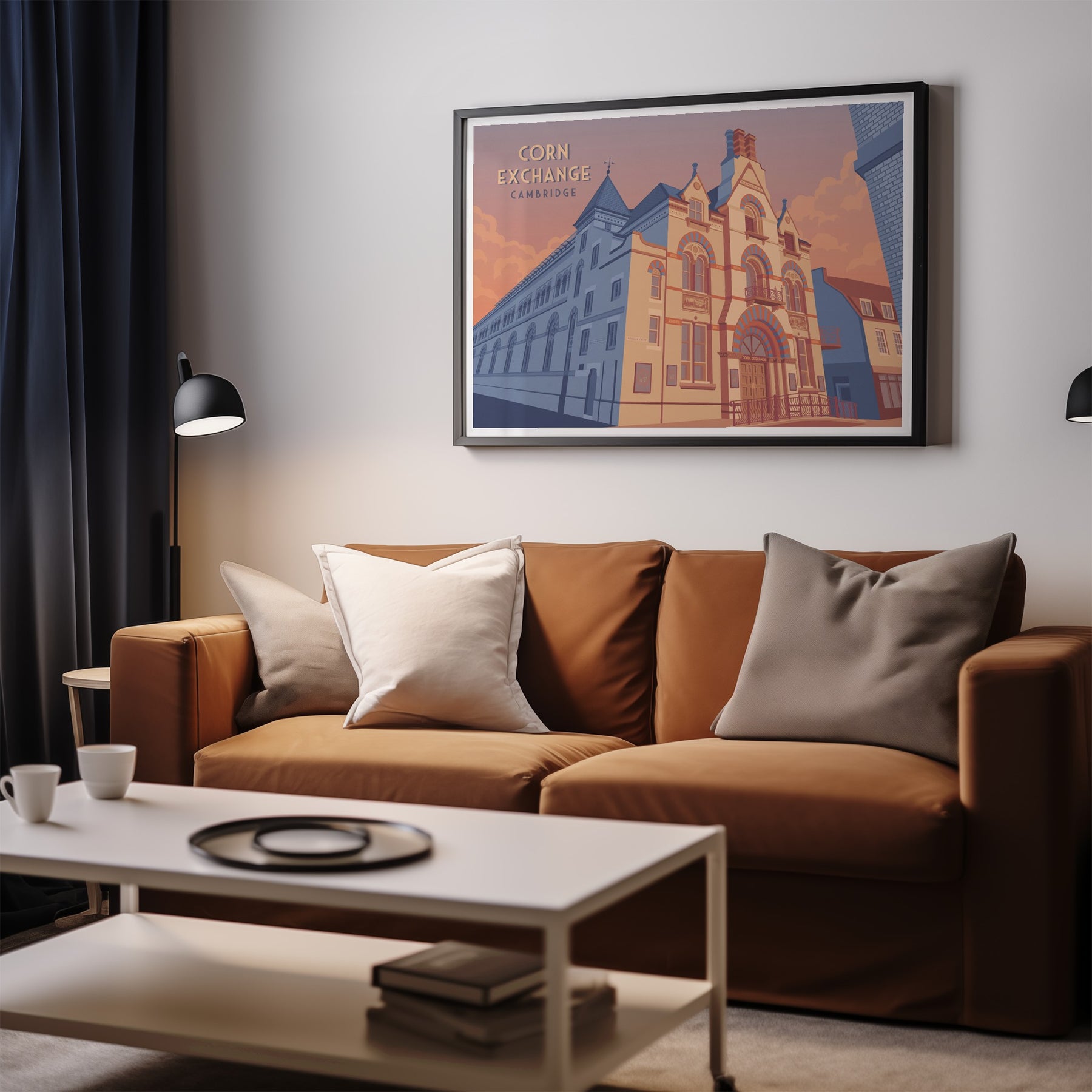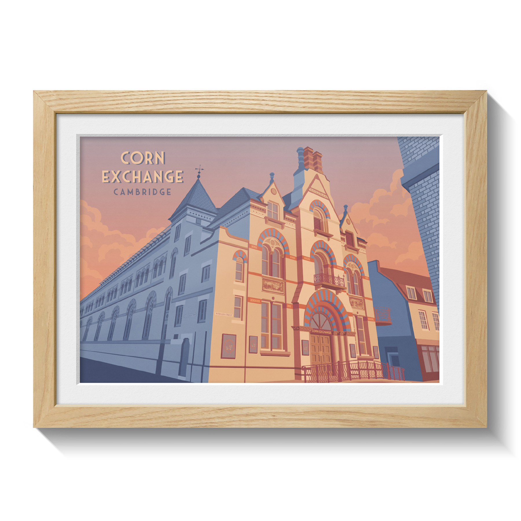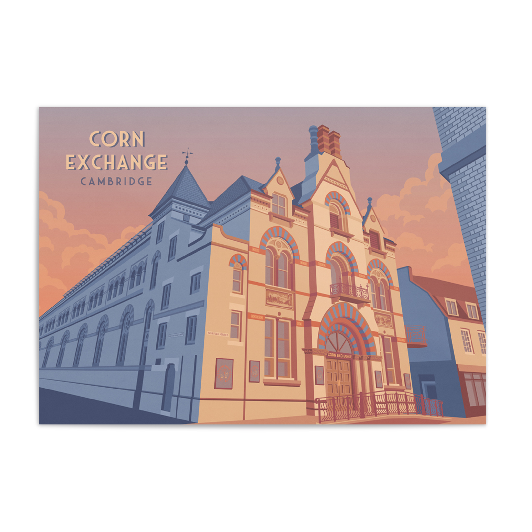 An original travel poster featuring one of Cambridge's most popular music venues, the Corn Exchange. The Corn Exchange has been open since 1875 and has hosted some of the biggest acts in comedy and music over the years.