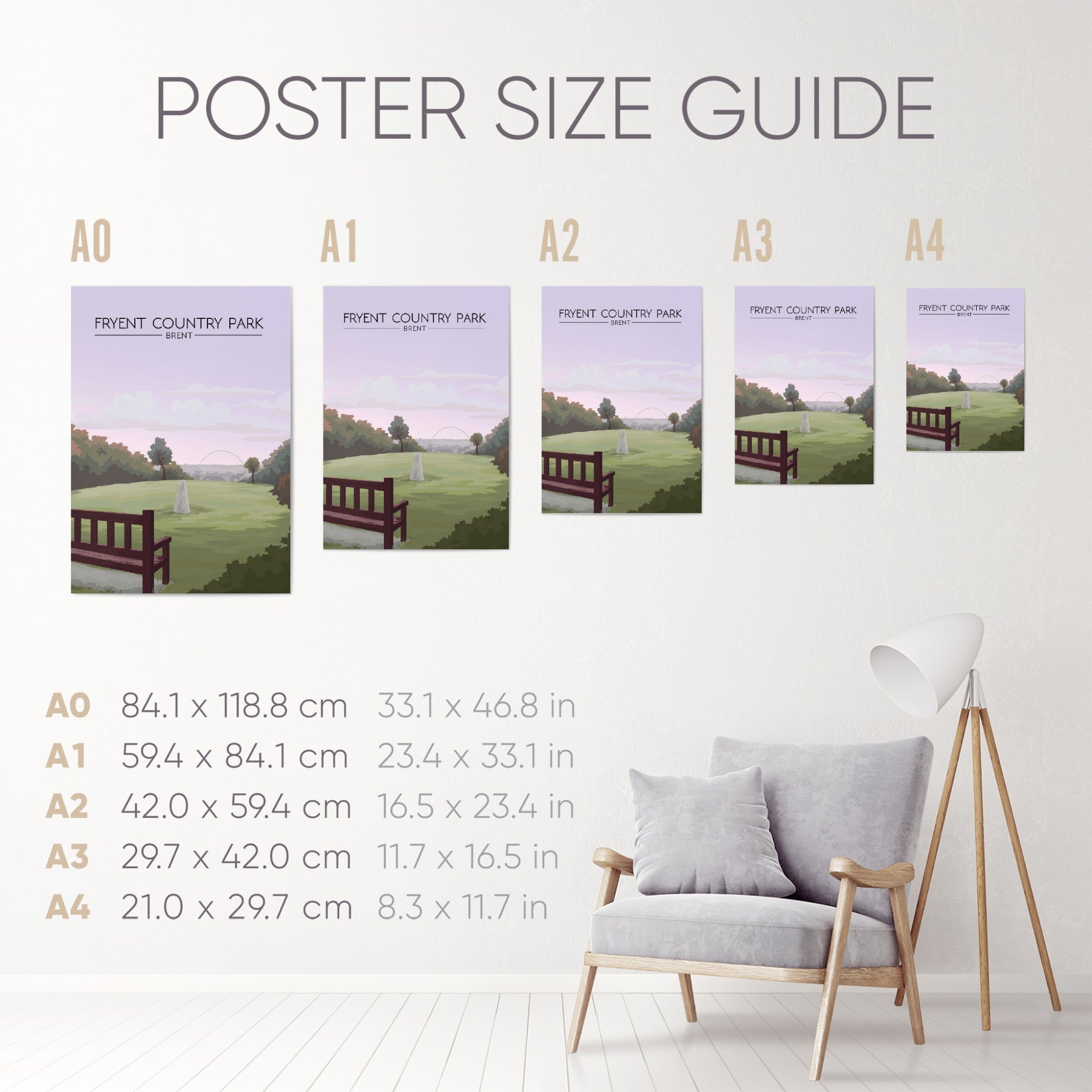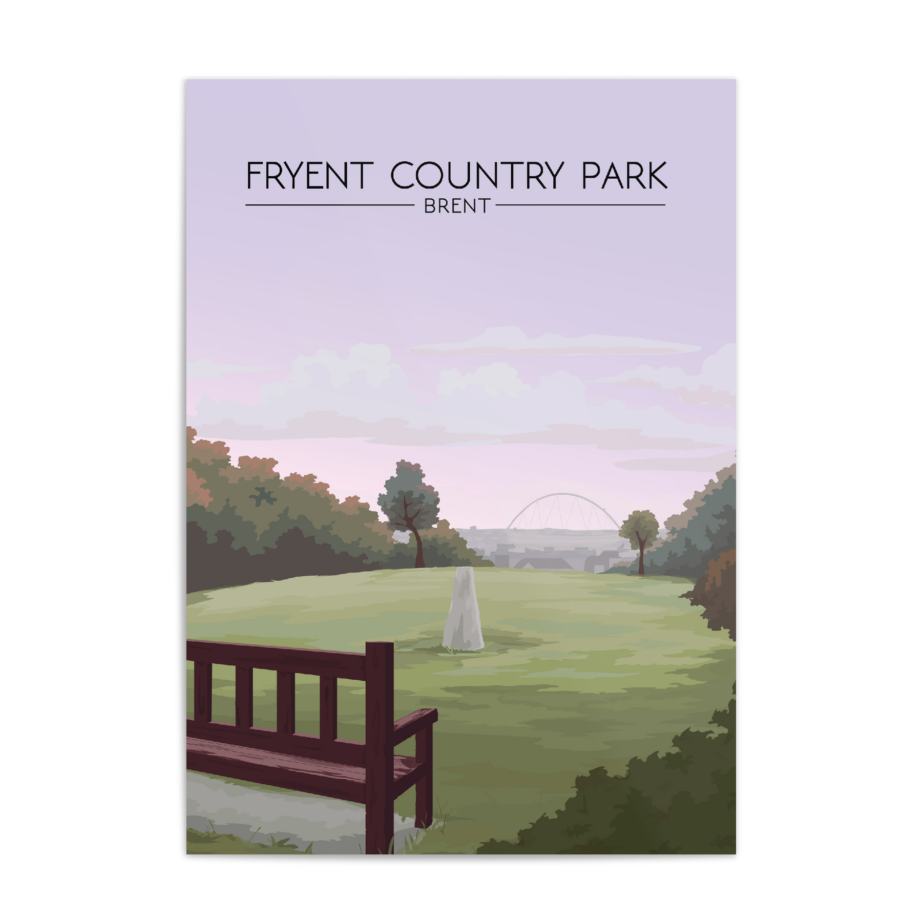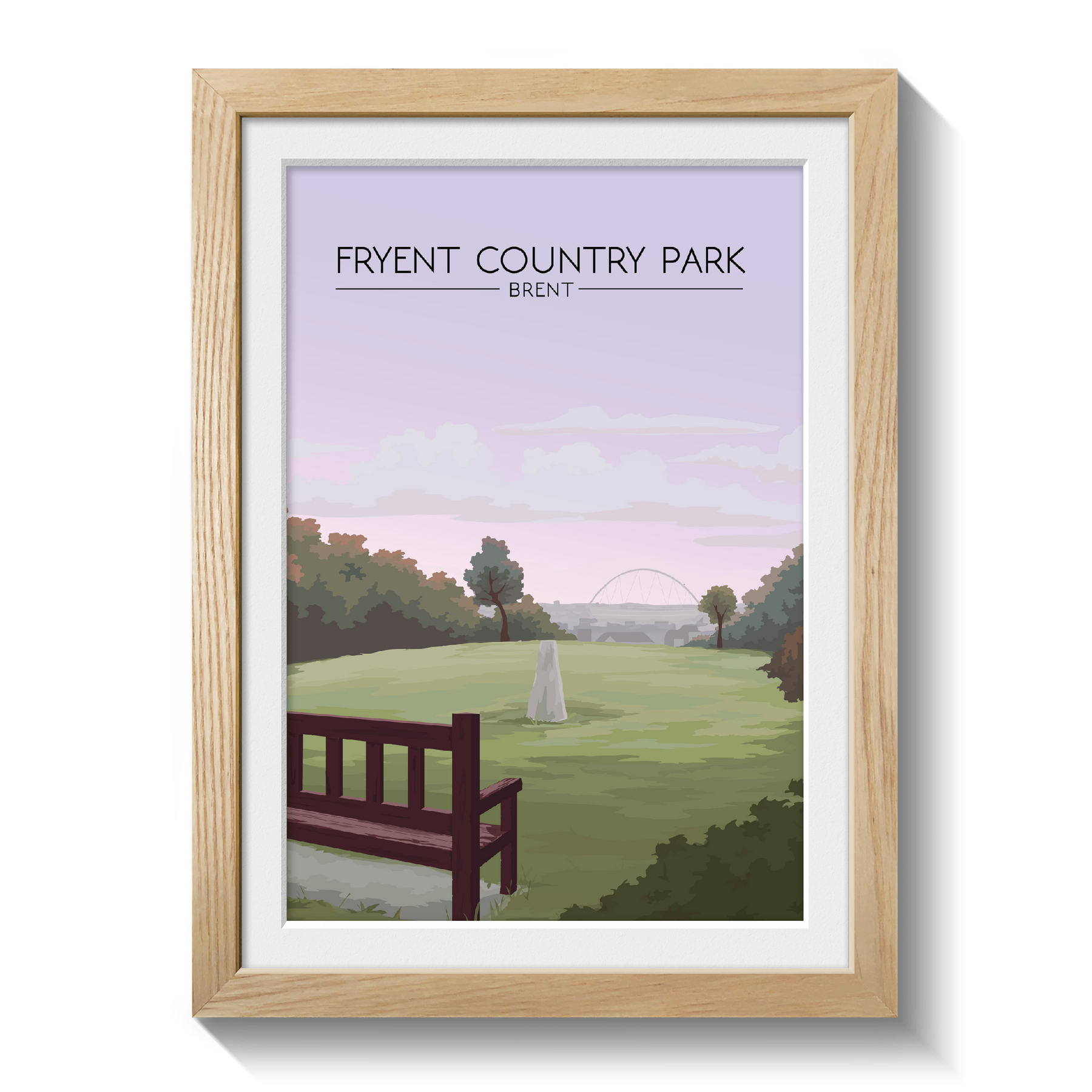 An original travel poster featuringFryent Country Park in Brent. A green oasis in the London Borough of Brent covering over 100 hectares of meadows, woods, hedgerows and ponds with views across London including Wembley Stadium.