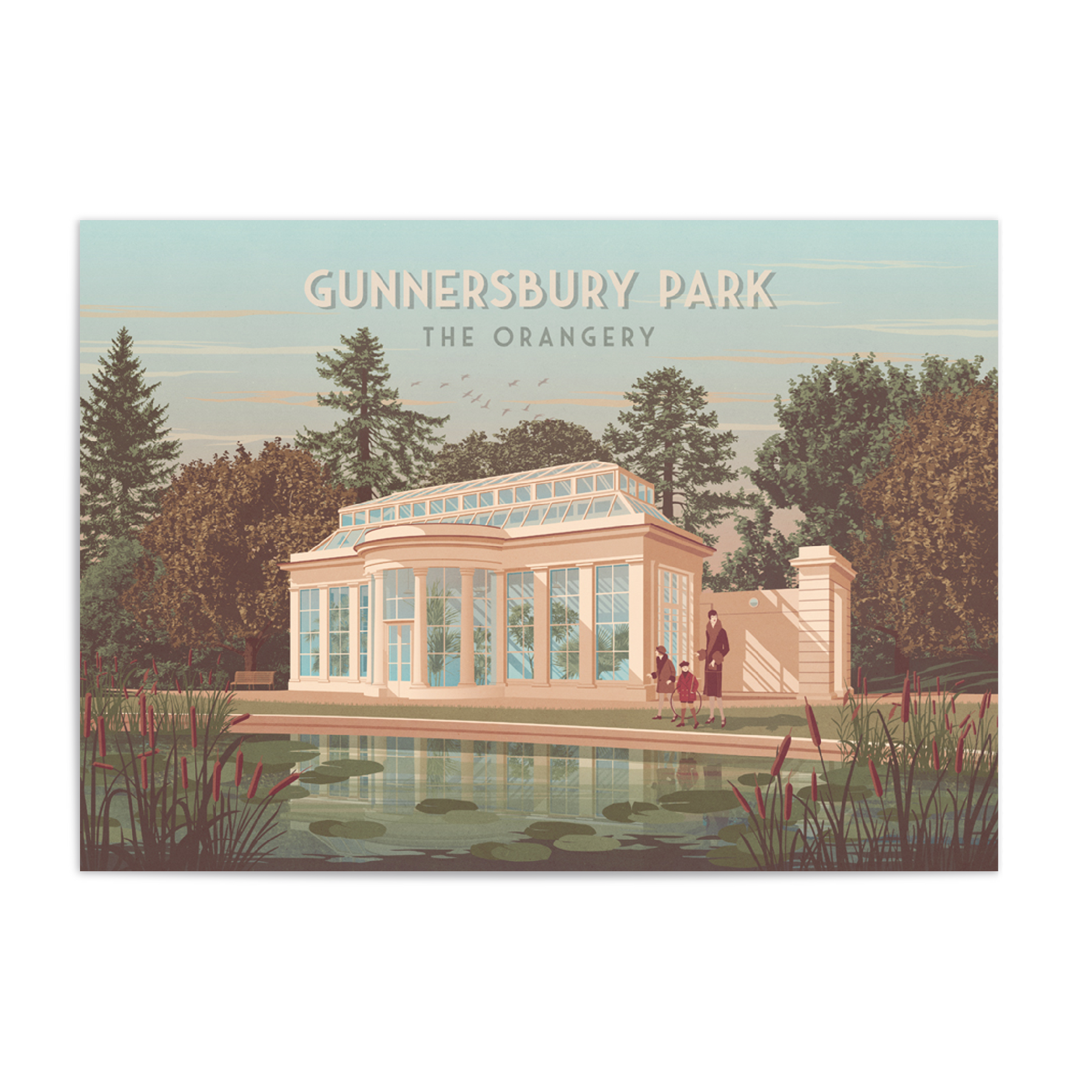 An original travel poster featuring the Orangery at Gunnersbury Park Museum, located in the London Borough of Hounslow between Acton, Brentford, Chiswick and Ealing, West London, England.