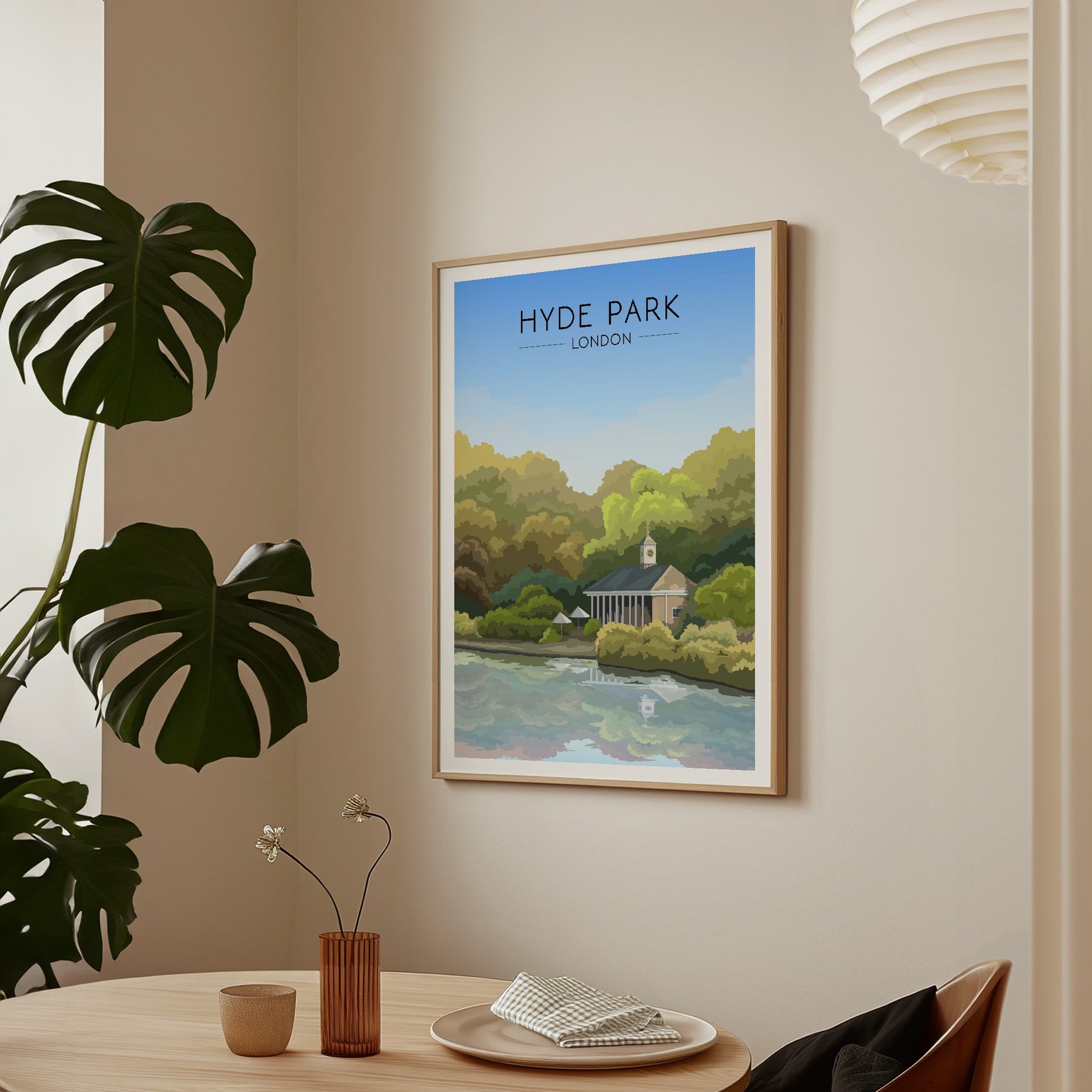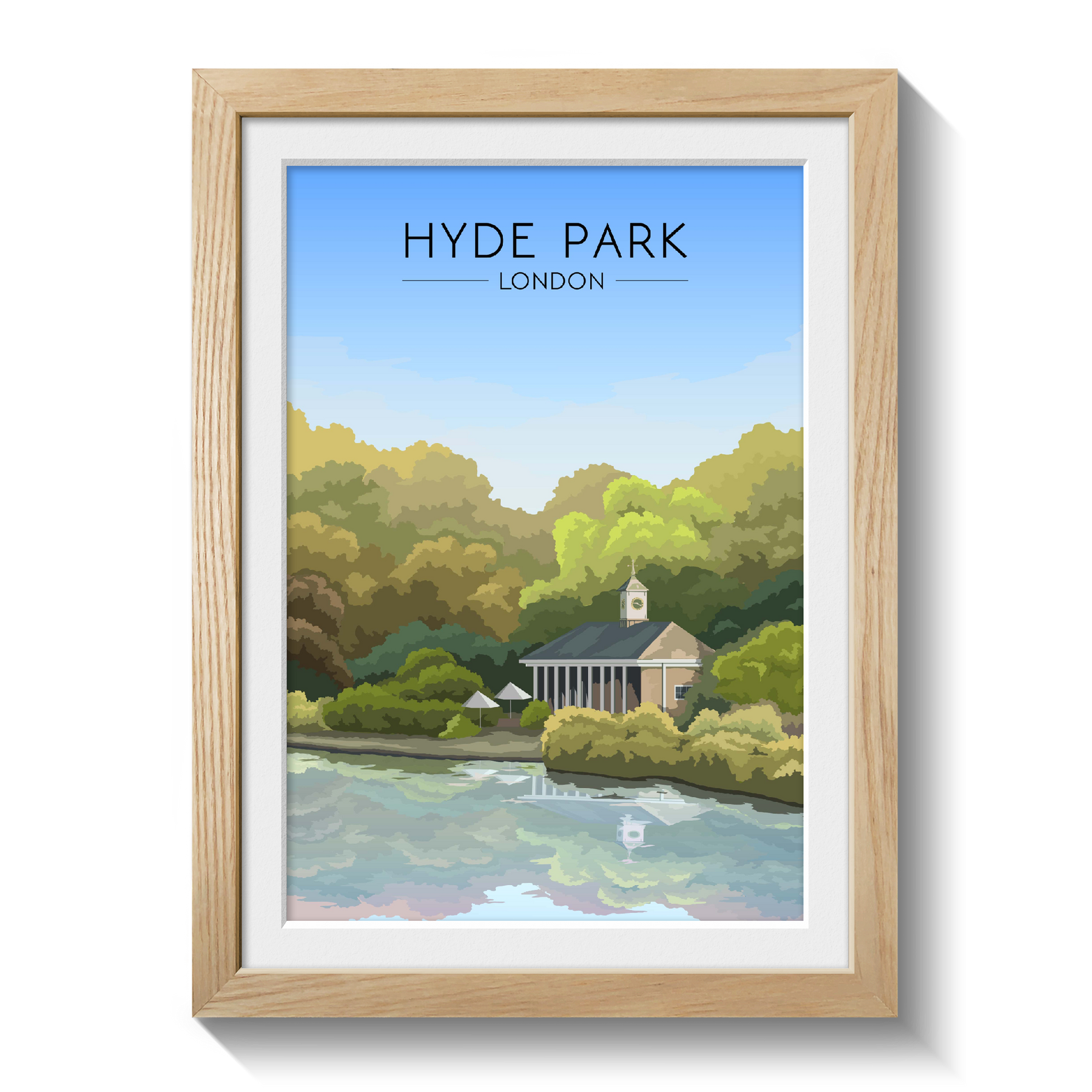 A full colour print featuring the lake house at Hyde Park's famous serpentine lake. The picturesque Serpentine lake was created in 1730 and its name comes from its snakelike curving shape.