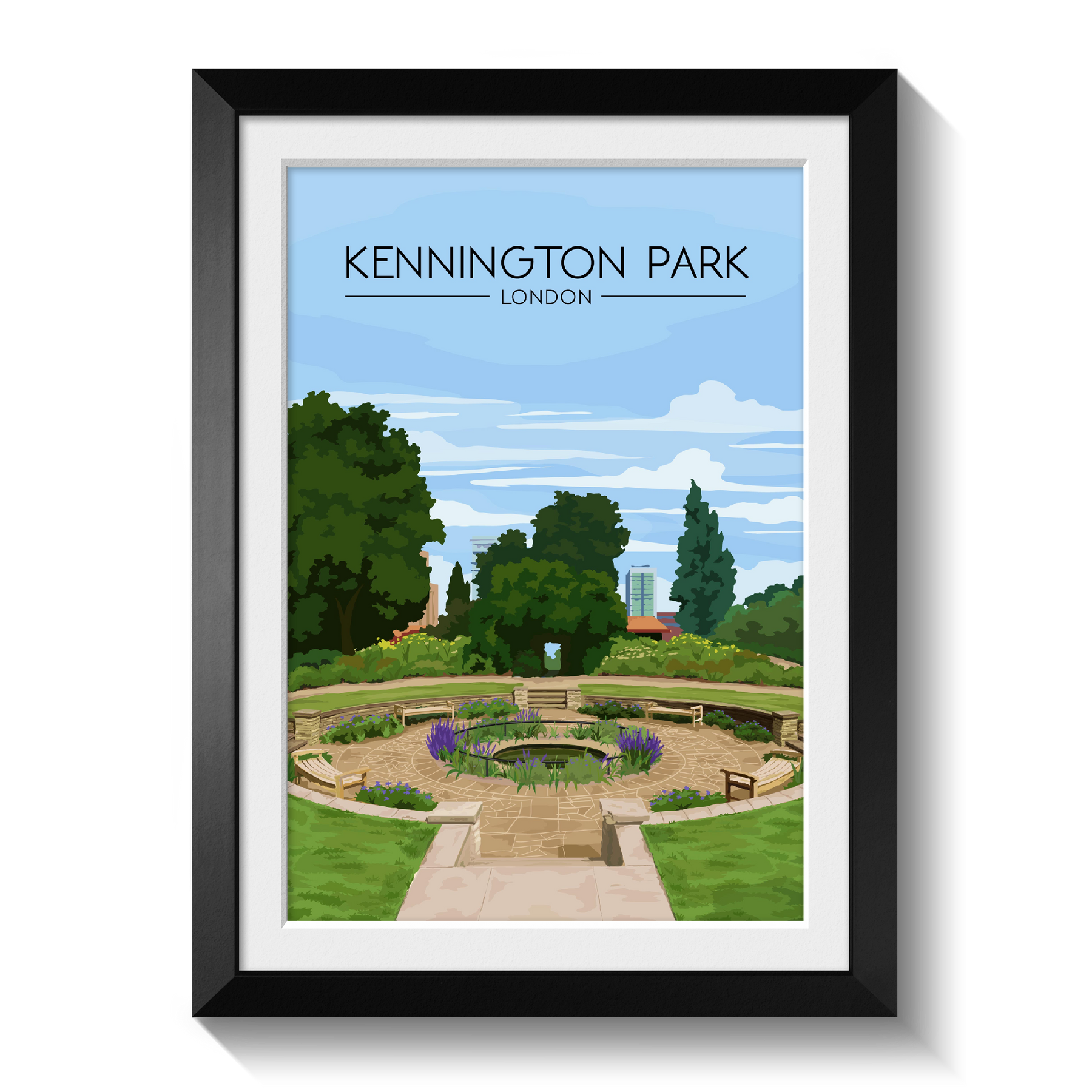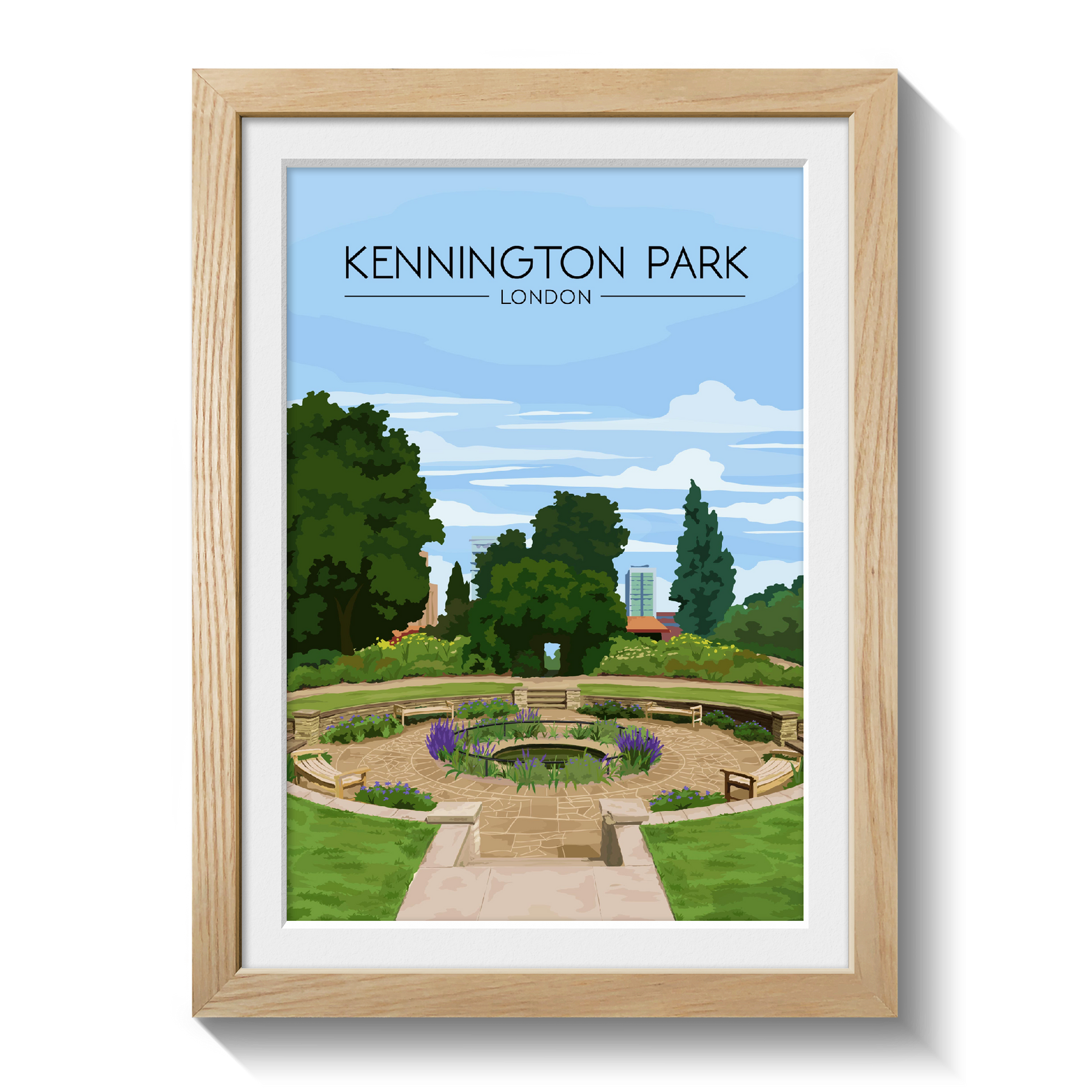 Original travel poster featuring the ornamental flower garden in South London's Kennington Park, situated a stones throw from the Oval Cricket ground in the Lambeth Borough of London.