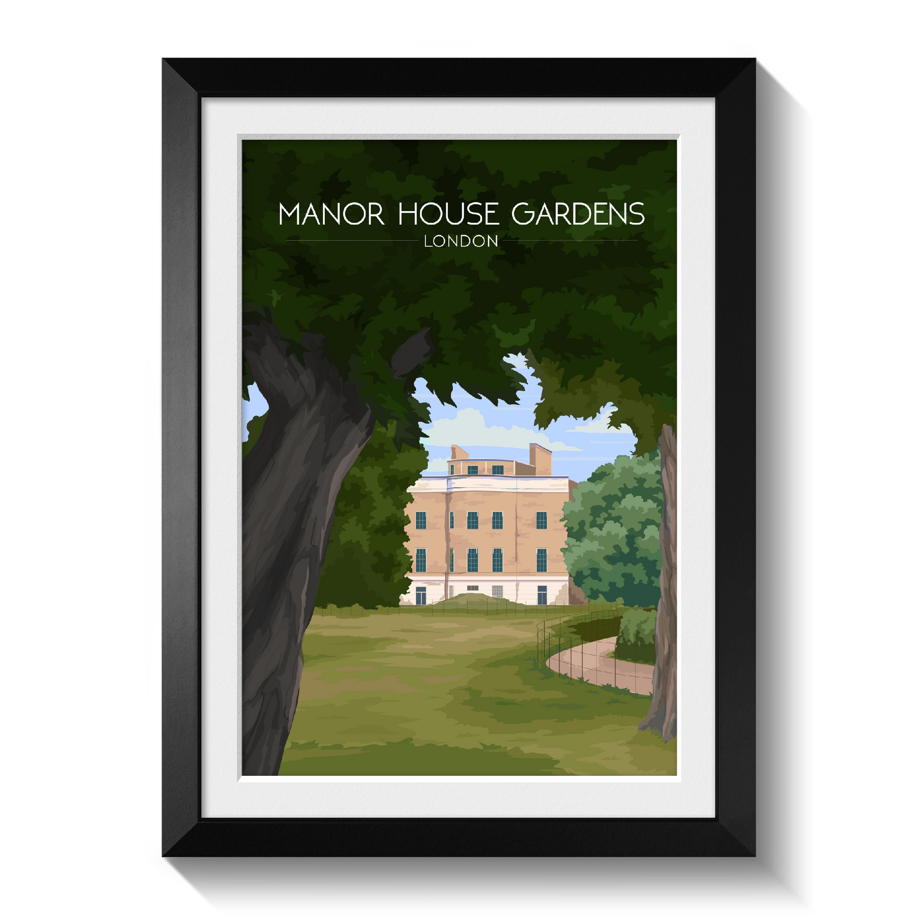 Original travel poster featuring a view of the Manor House in the park, Manor House Gardens in Lee, South East London in Lewisham.