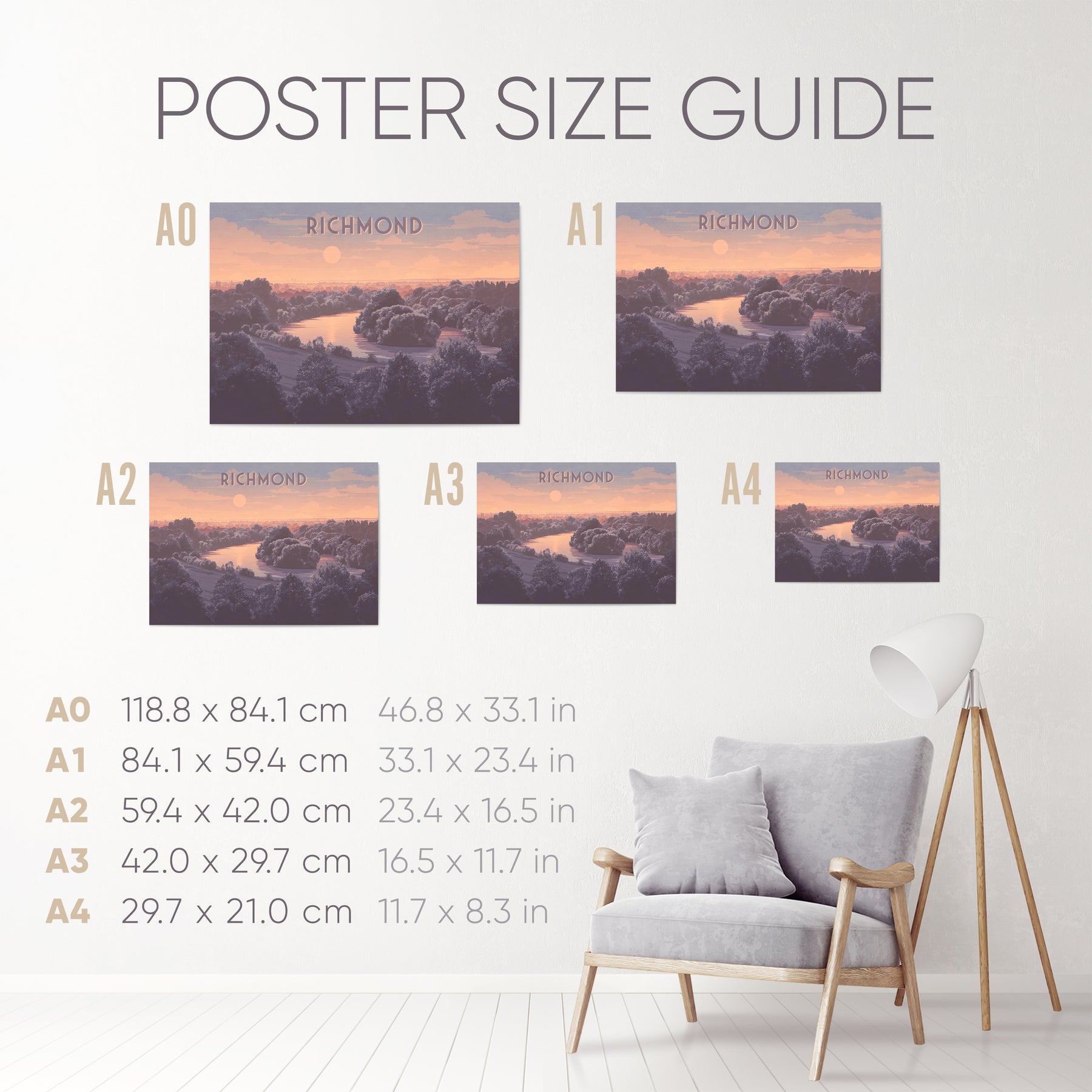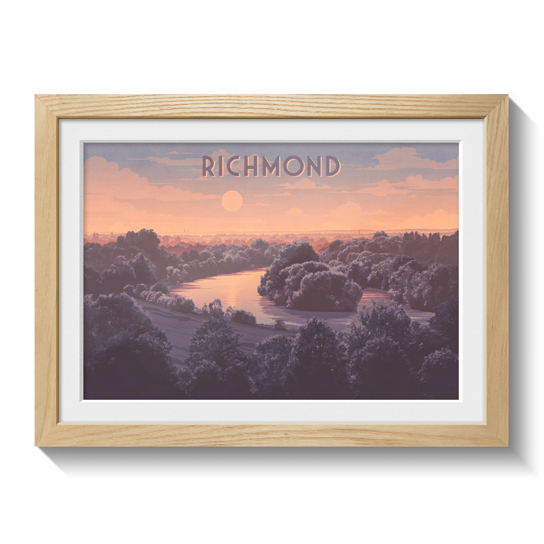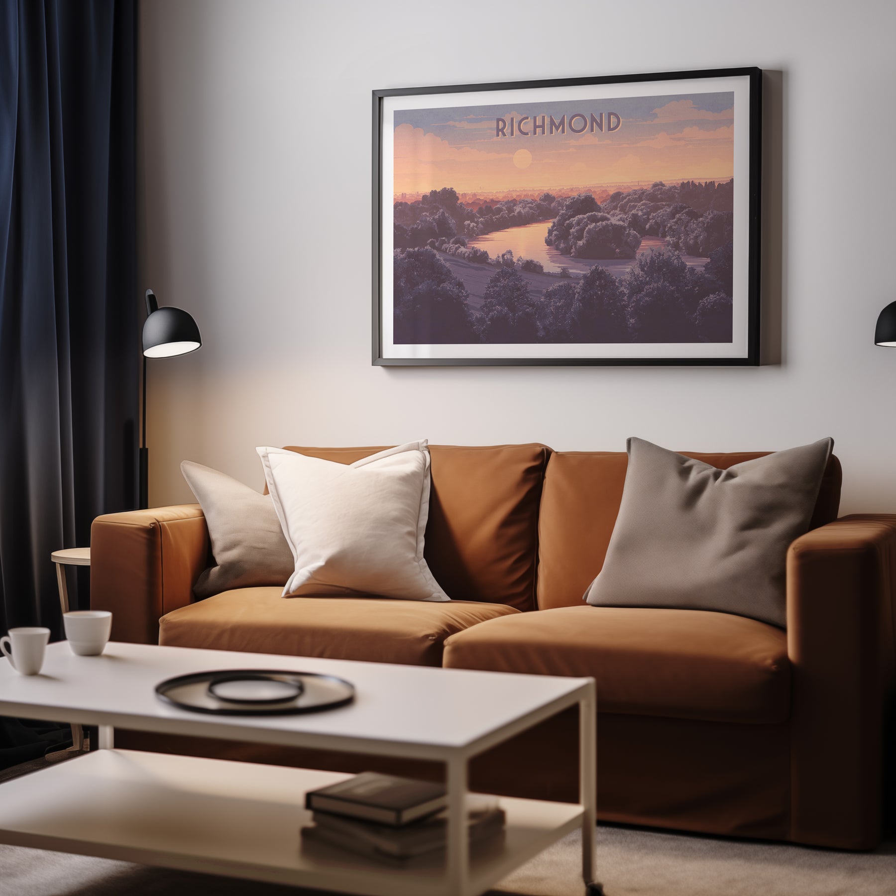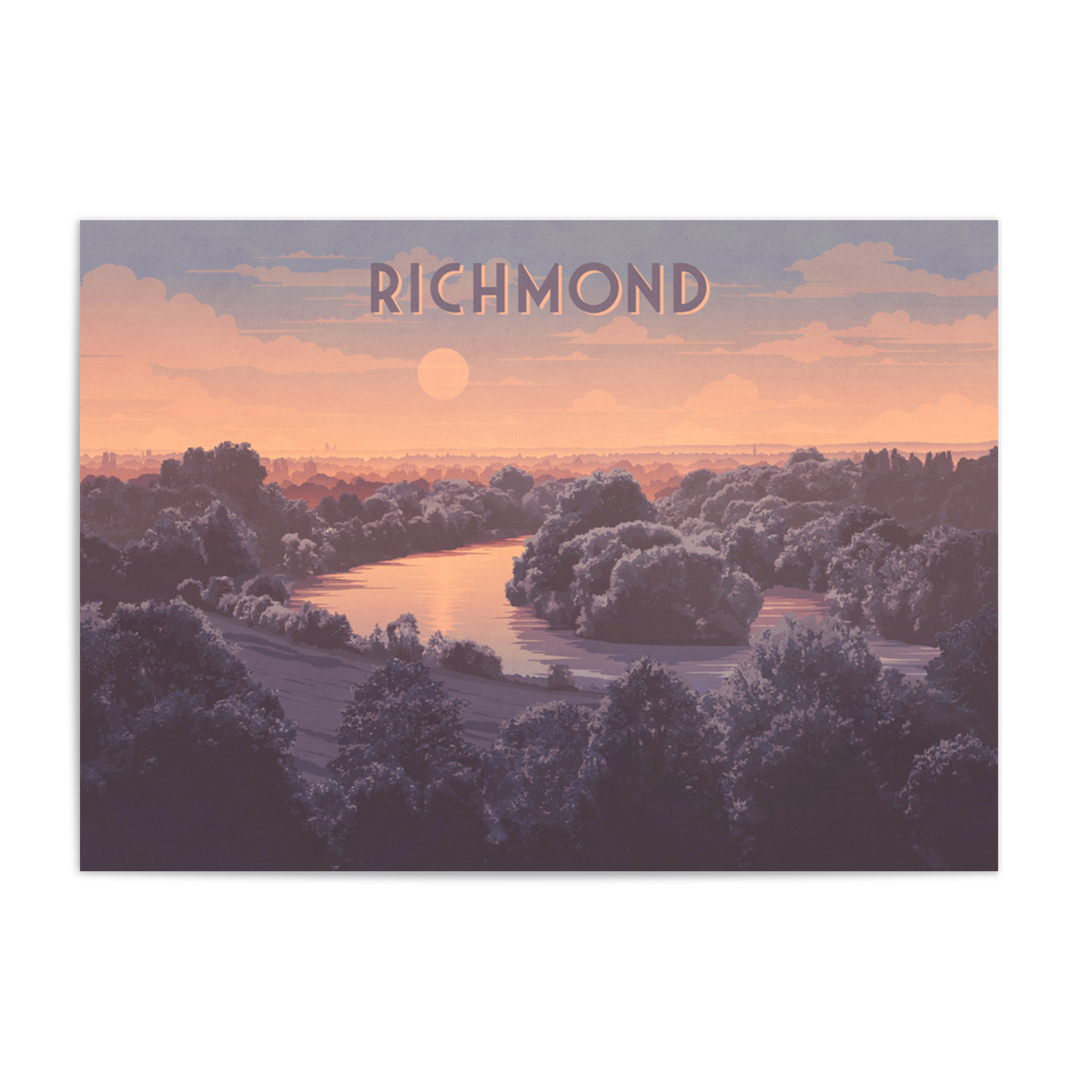 This Richmond travel poster showcases a stunning sunset view from Richmond Hill, overlooking the Thames and surrounding meadows. Perfect for London lovers and nature enthusiasts, it captures one of the city’s most iconic and peaceful panoramas. A stylish decor piece celebrating the timeless beauty of Richmond in southwest London.