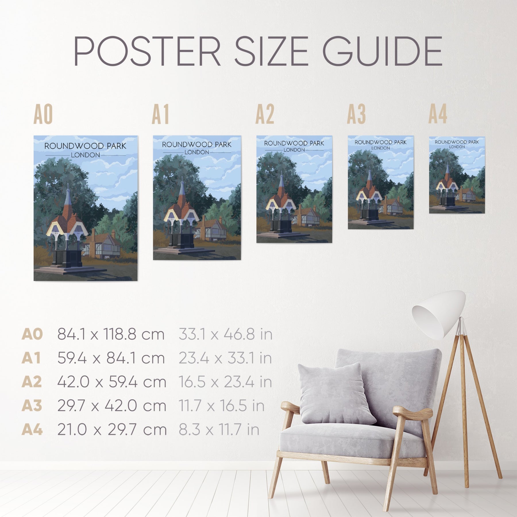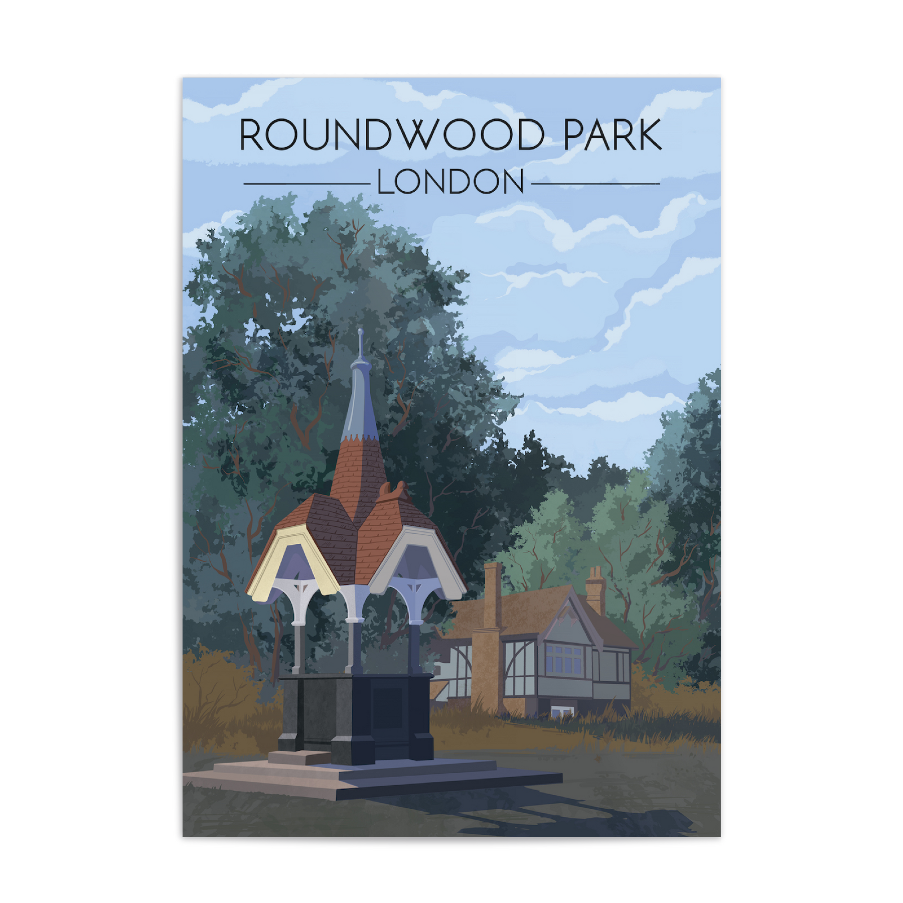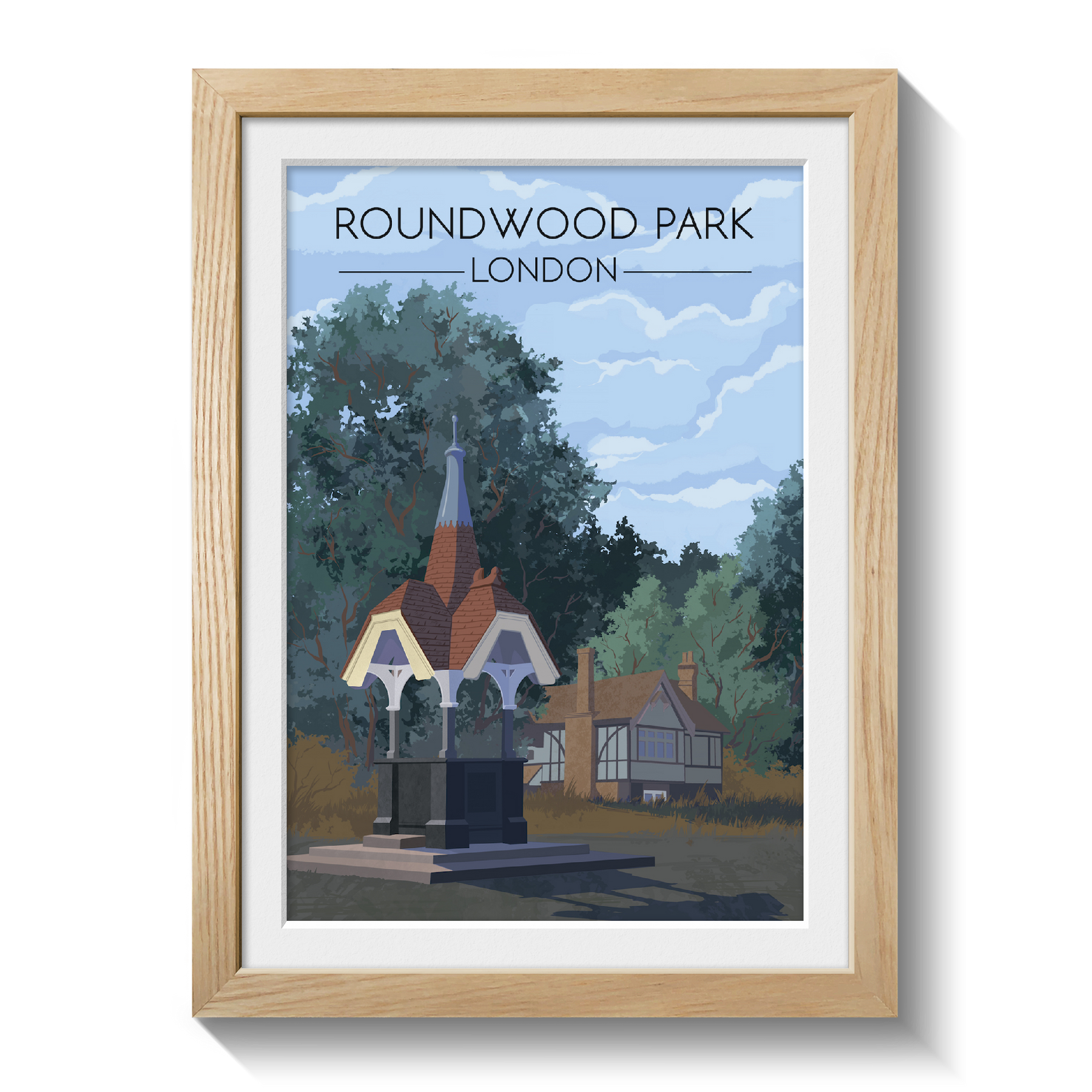 This travel print features North West London's Roundwood Park, a grade two listed formal Victorian Park. In the poster you can see the famous drinking fountain and Roundwood Lodge House.
