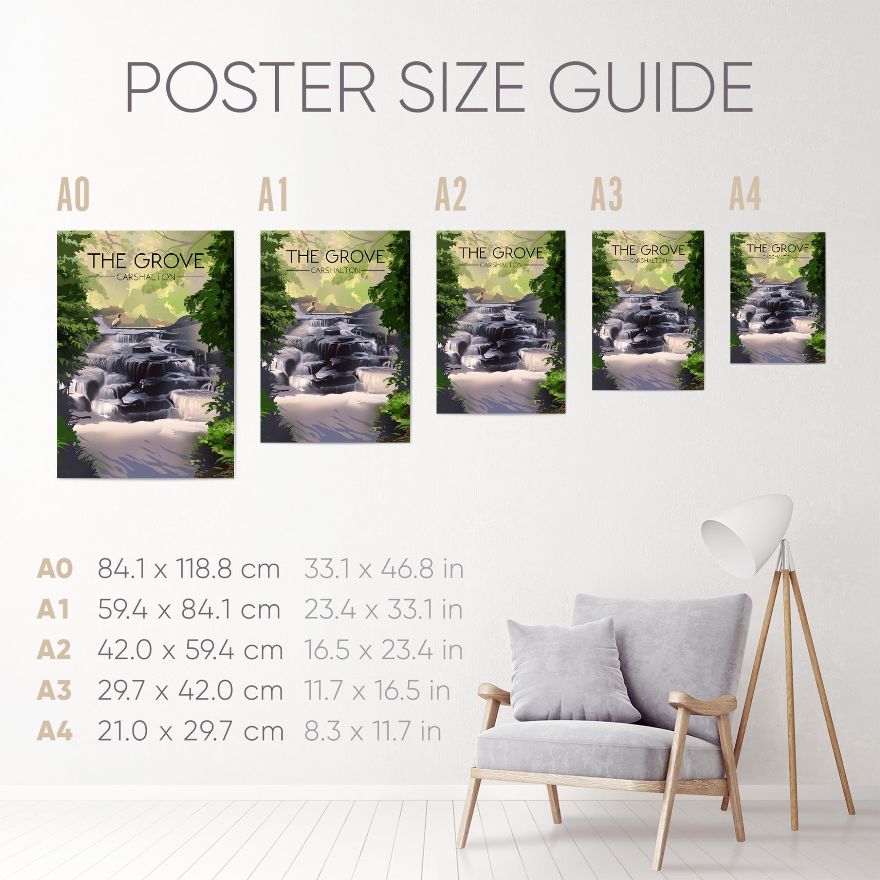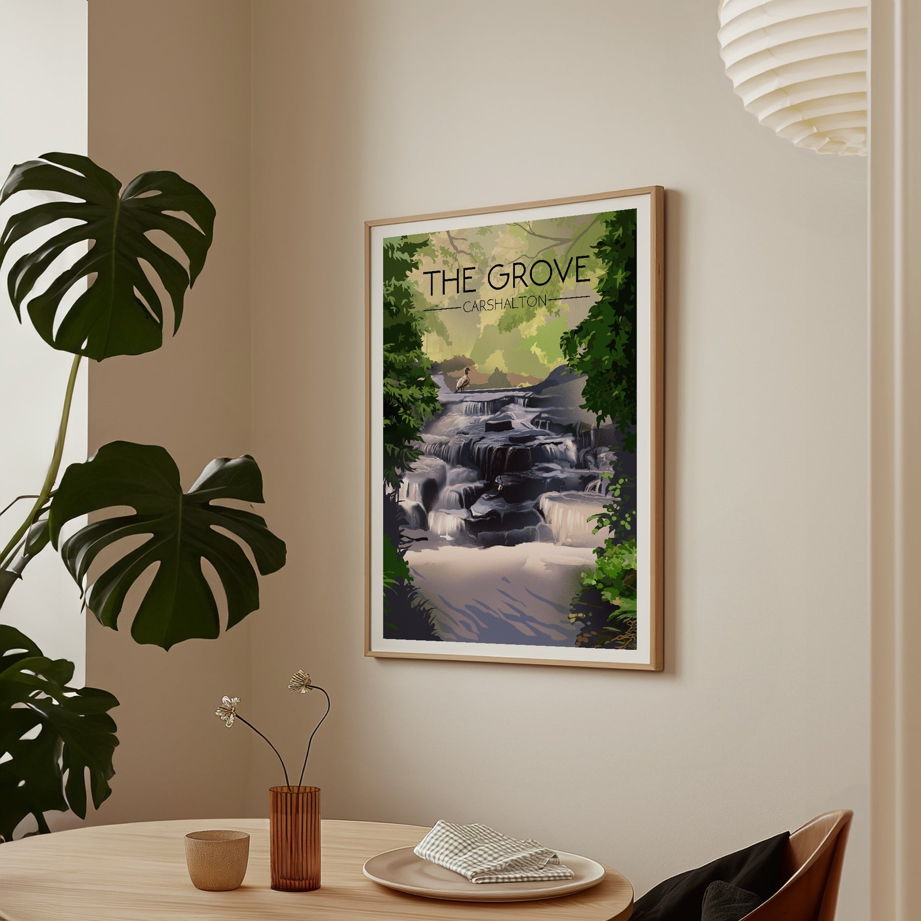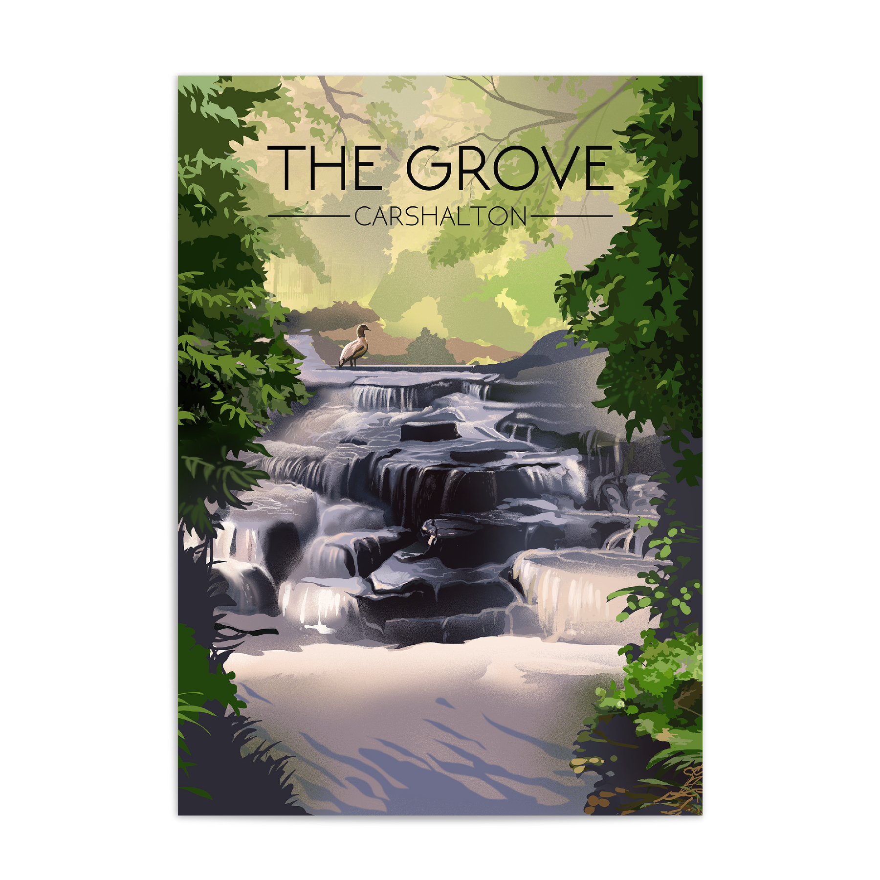 The Grove forms a part of the Carshalton Conservation Area in Sutton. The poster features the waterfall also known as the cascade or mill weir which can be traced back to the 1800s.