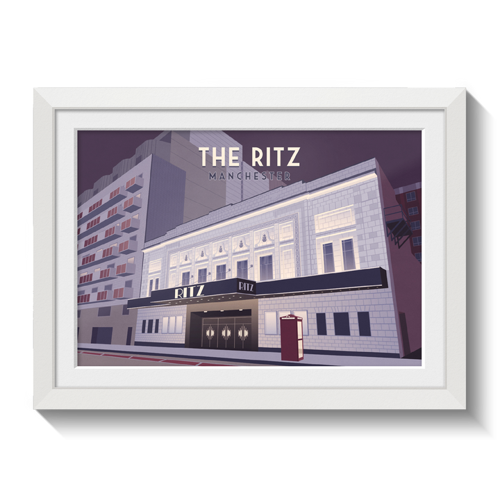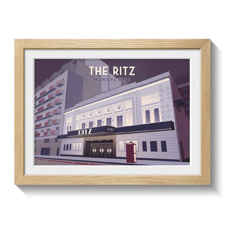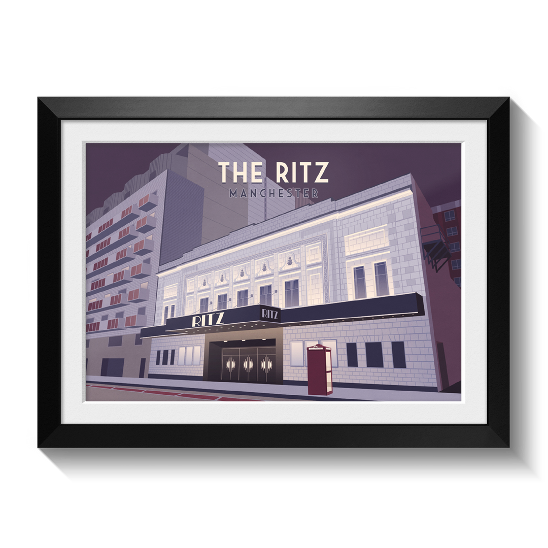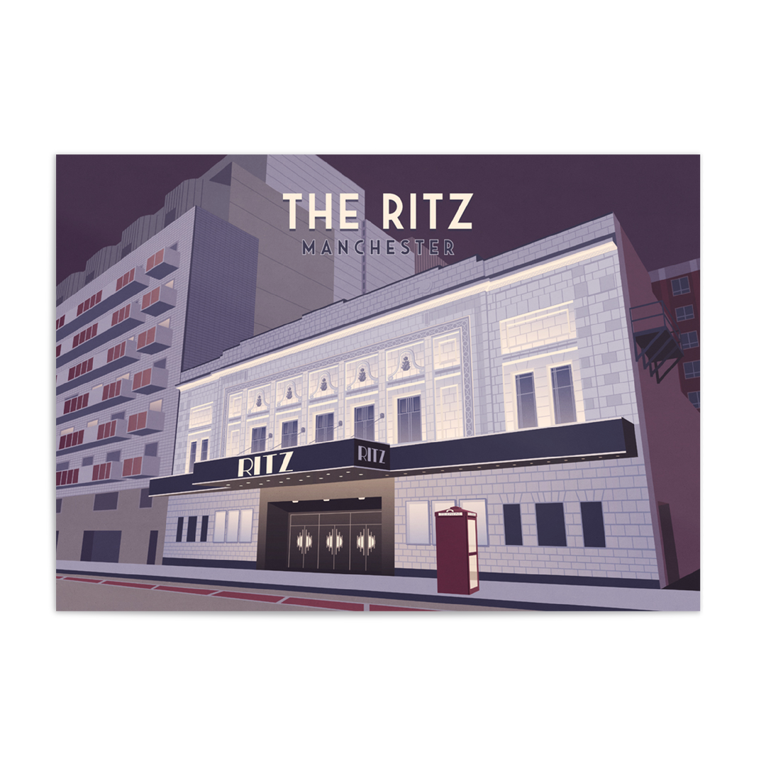 An original travel poster featuring Manchester's iconic Ritz music venue, also known as the o2 Ritz Manchester.